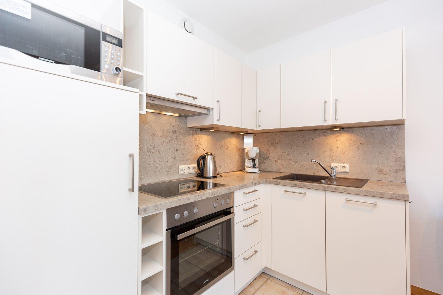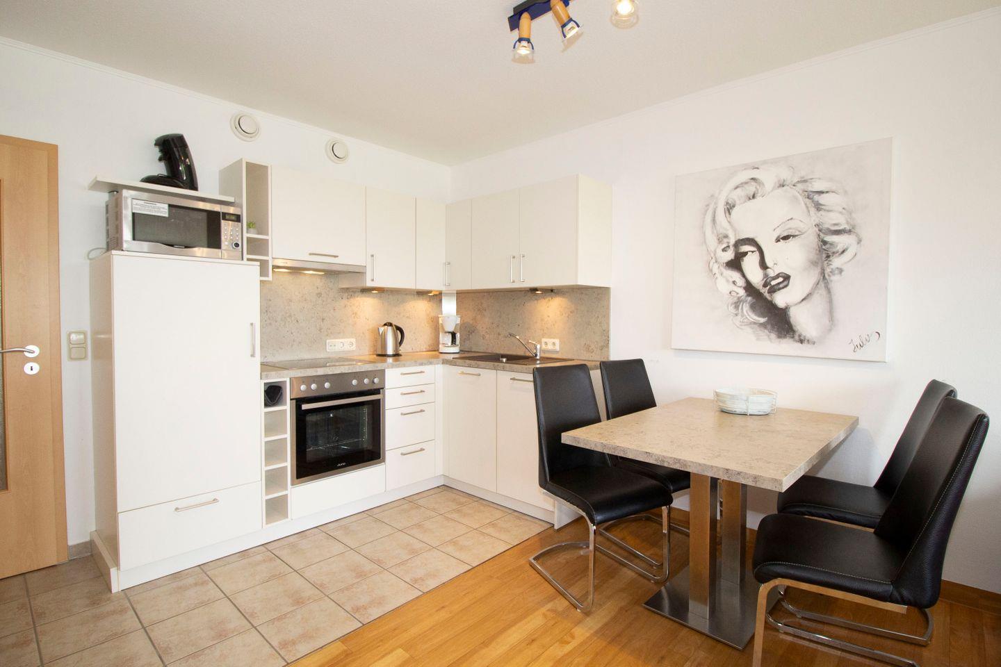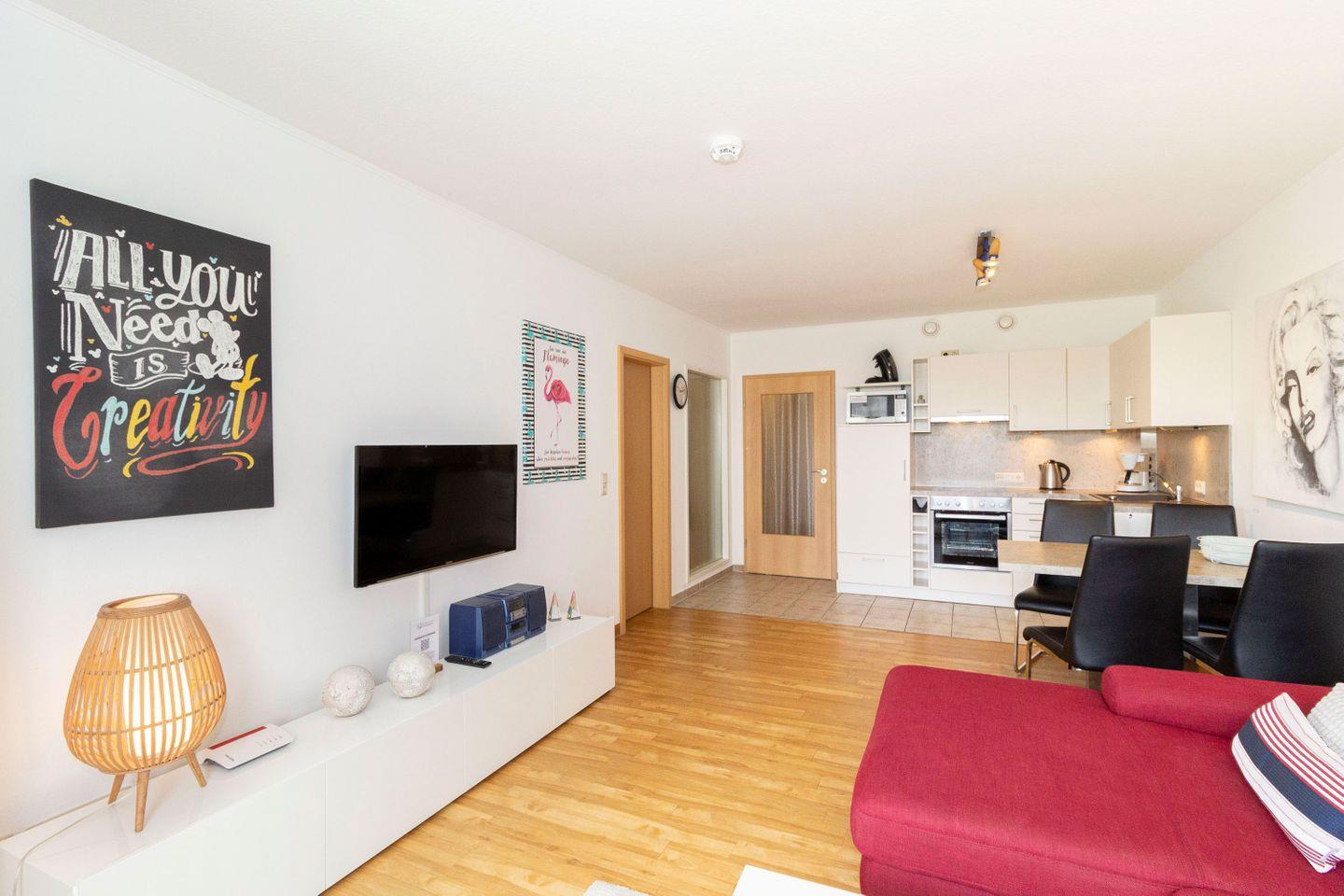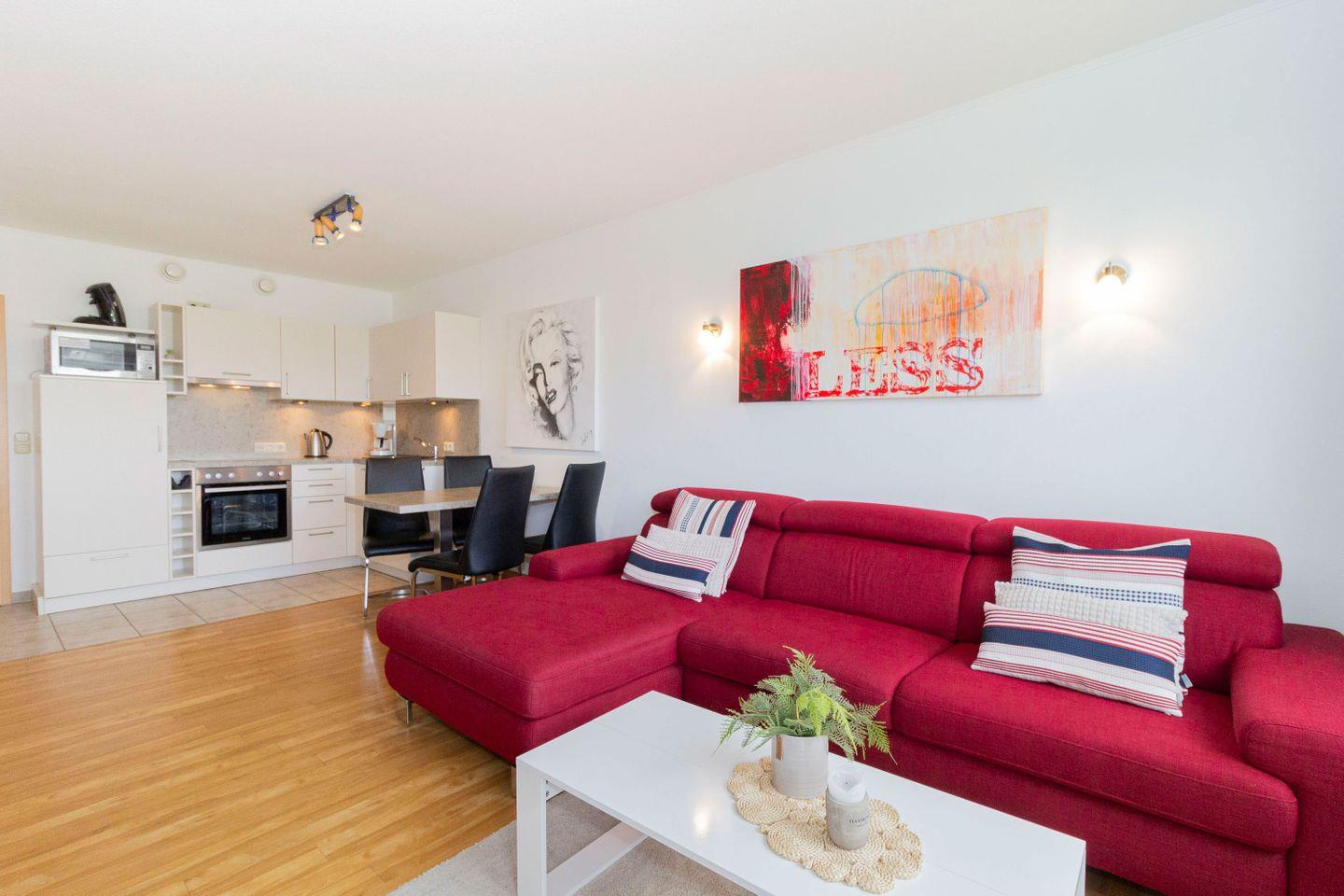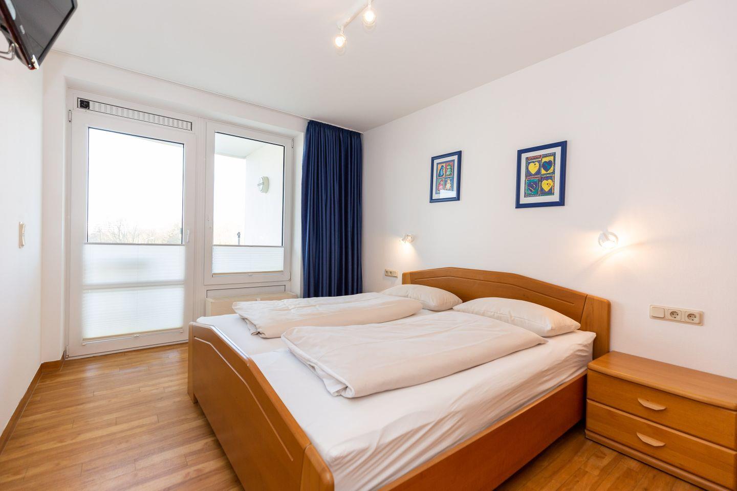 Haus "Kurpark-Residenz", Typ D2, App.-Nr. "221", bis 4 Personen, 2. OG, Westseite, ca. 61 m² Größe, Wohnzimmer mit Flachbild-TV, sep. Schlafzimmer mit Doppelbett und 2. Flachbild TV, separates 2. innenliegendes Schlafzimmer mit Einzelbetten und kontrollierter Be- und Entlüftung, Dusche/WC mit Sitzgelegenheit in der Dusche, Küchenzeile (Fliesen) mit Geschirrspüler, Mikrowelle und Backofen, Senseo Kaffeemaschine, Loggia Richtung Westen mit Zugang vom Wohn- und Schlafzimmer, SAT-TV, WLAN, HiFi-Anlage, Tiefgaragenstellplatz, Strandkorb im Sommer 2026.