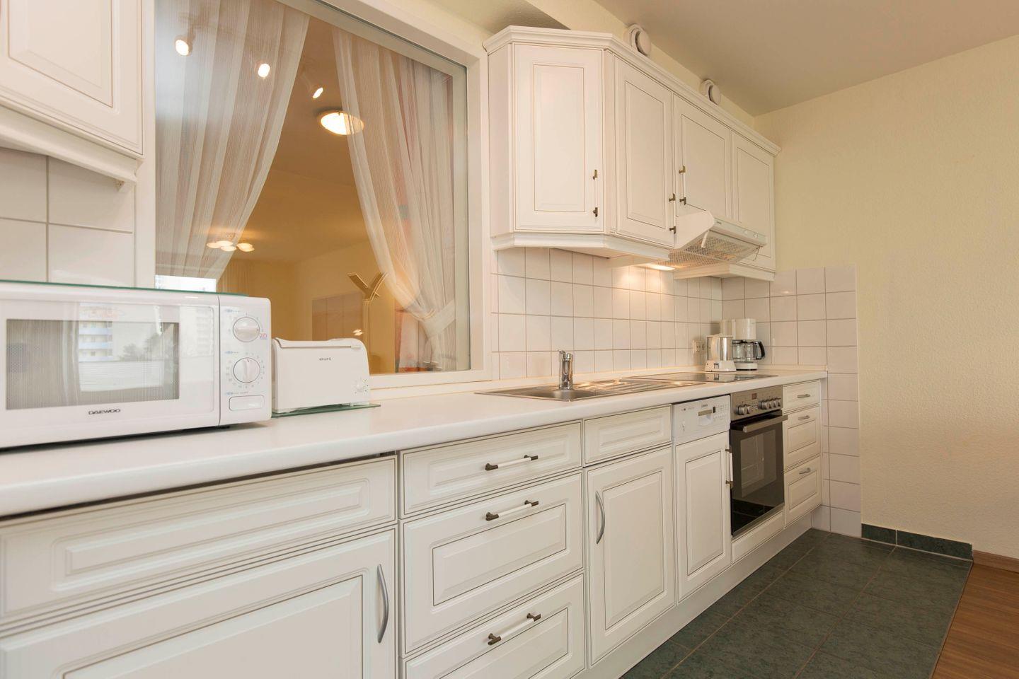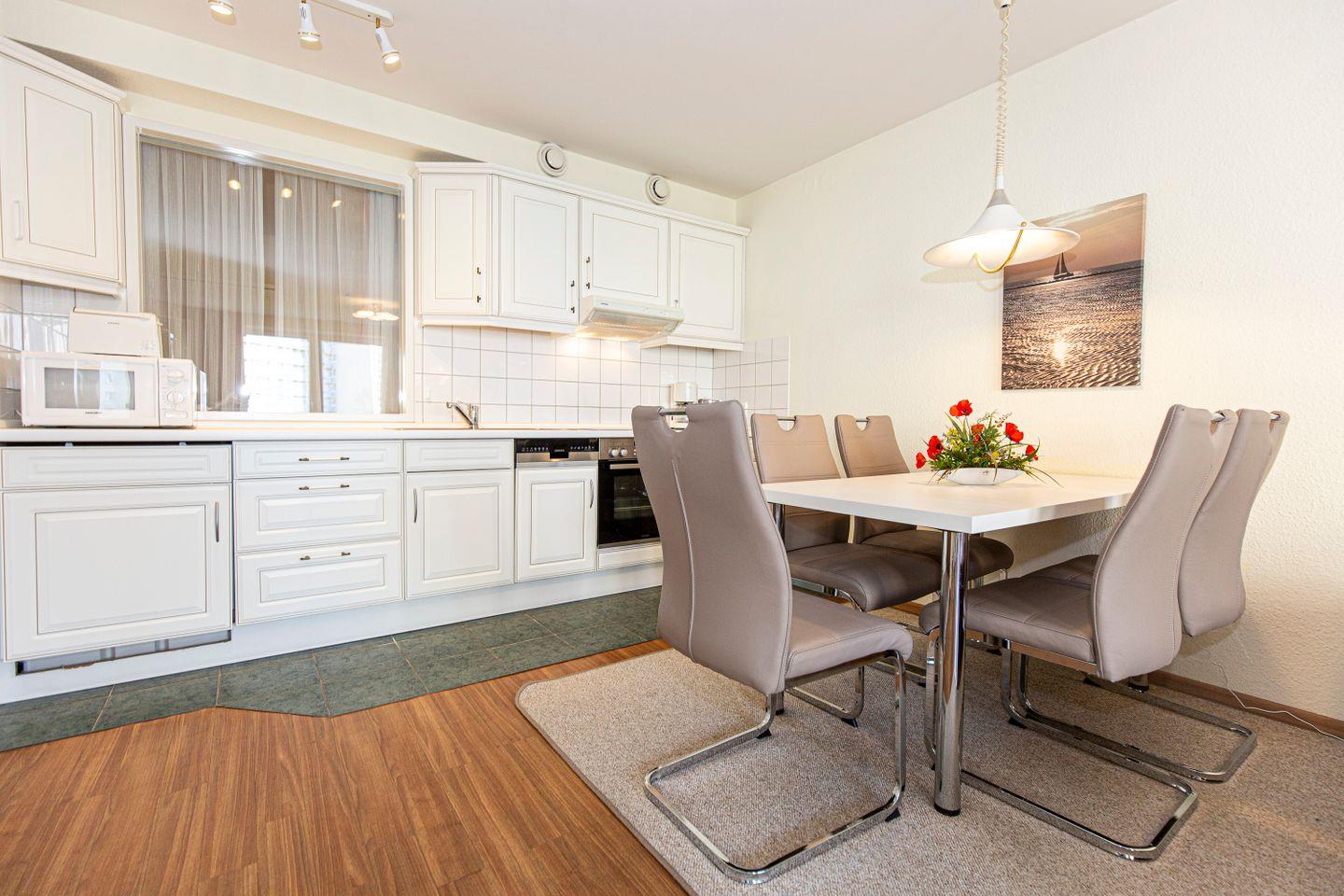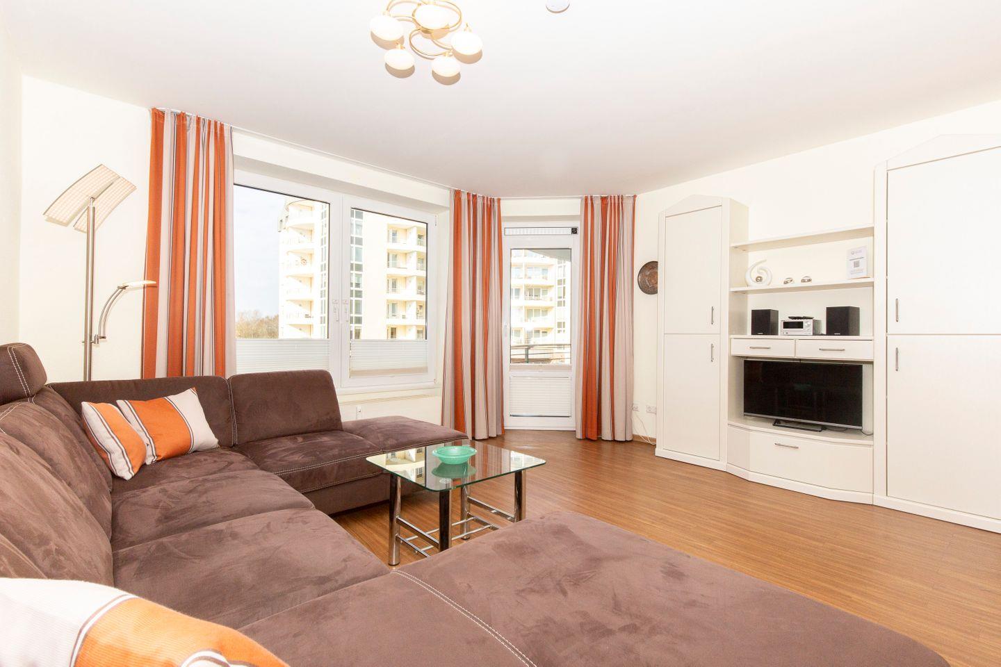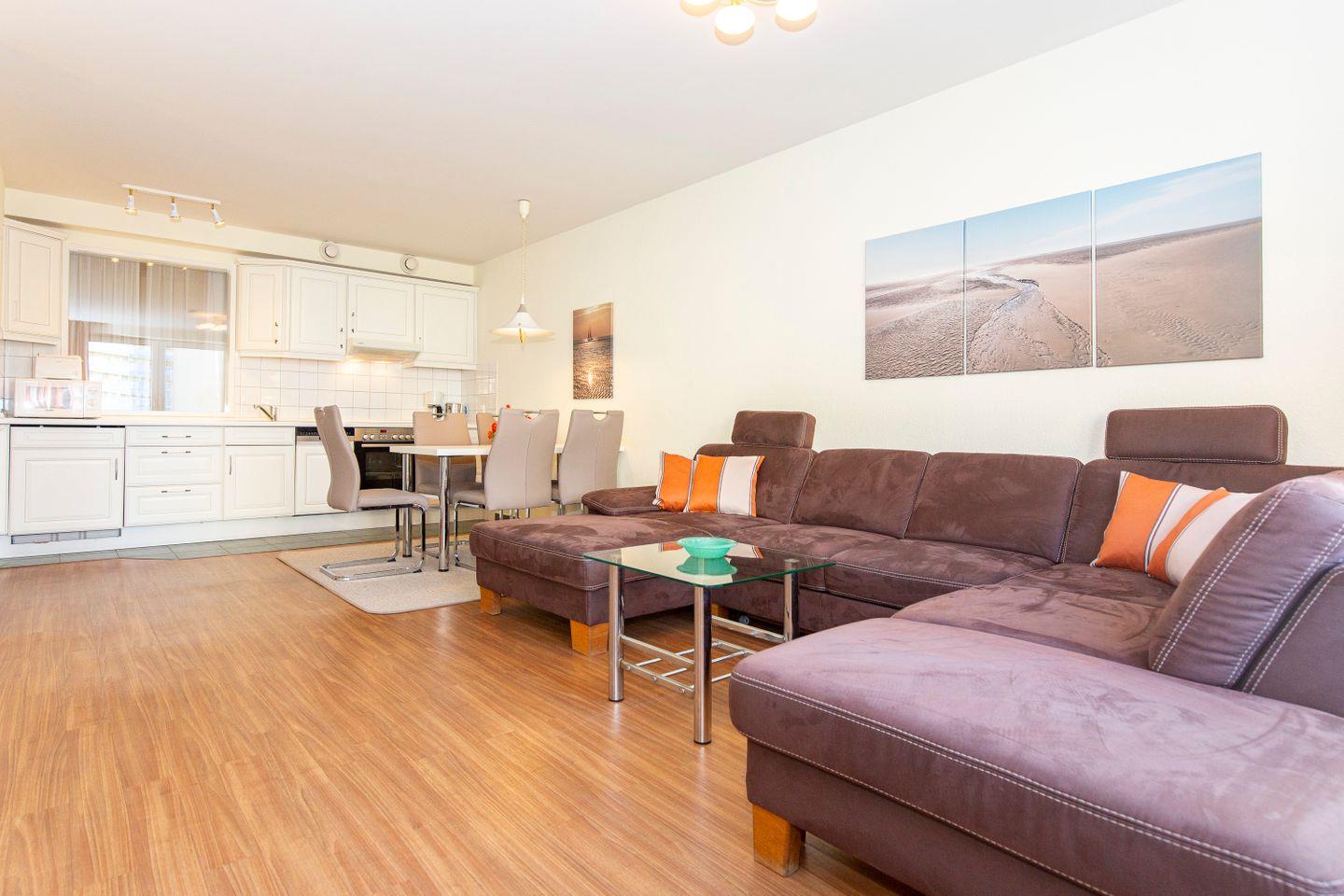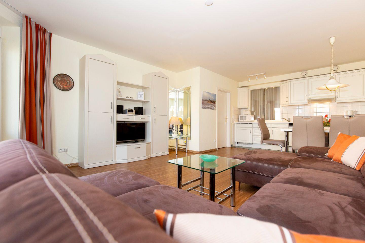Haus "Kurpark-Residenz", Typ D2, Appartement-Nr. "135", bis 5 Personen, 1. OG, Südseite (Parkseite), ca. 69 m² Wohnungsgröße, Wohnzimmer mit Schlafcouch, separates Schlafzimmer mit Doppelbett, separates Schlafzimmer (innenliegend) mit Einzelbetten, Dusche/WC und Bidet, Küchenzeile mit Mikrowelle, Backofen und Geschirrspüler, Raucher App., Balkon, Smart-TV, Haustiere willkommen, Tiefgaragenstellplatz, Strandkorb im Sommer 2026.