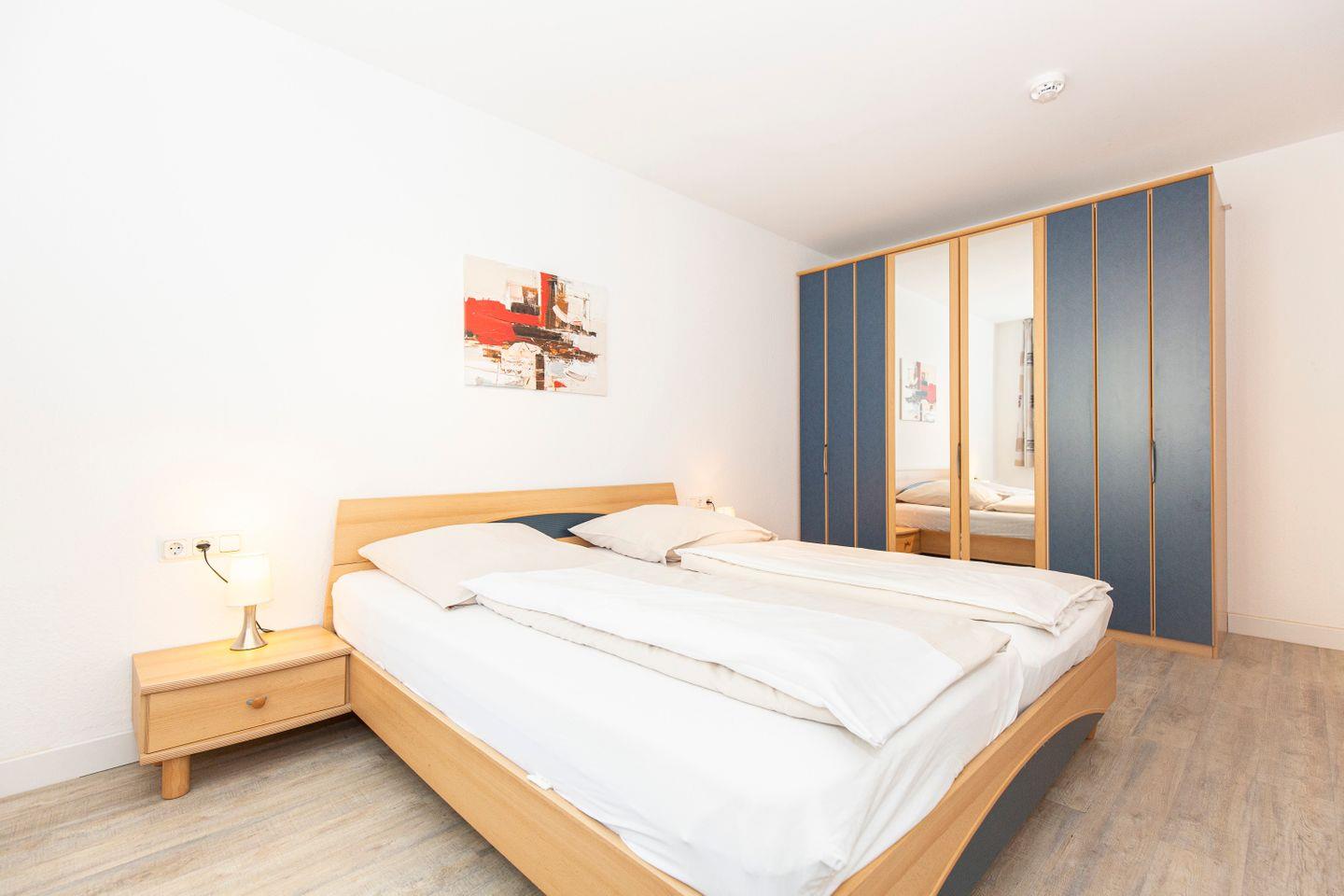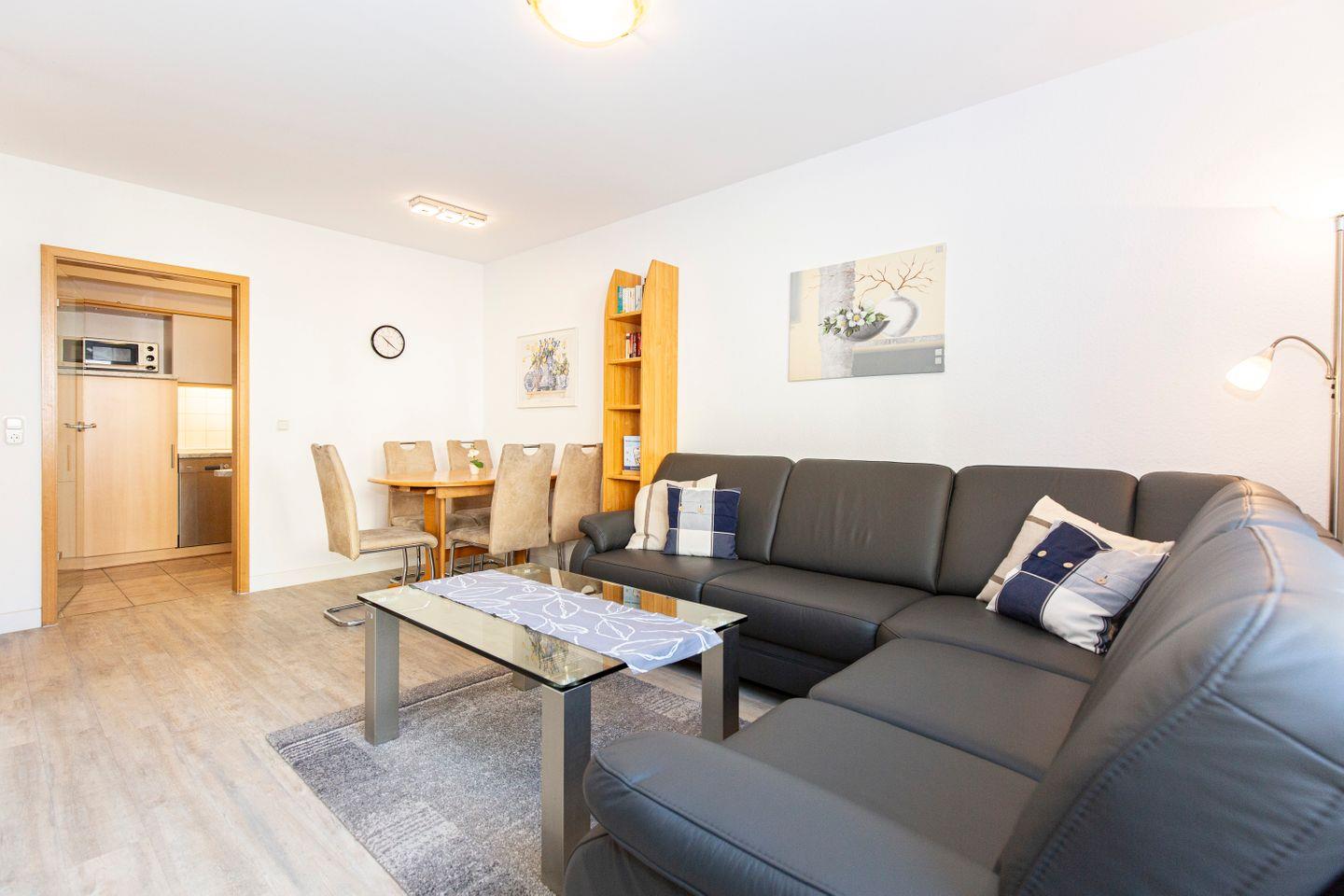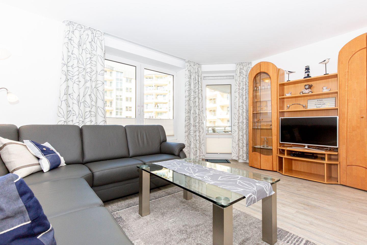 Haus "Kurpark-Residenz", Typ D2, Appartement-Nr. "133", bis 4 Personen, 1. OG, Südseite (Parkseite),ca. 68 m² Wohnungsgröße, Wohnzimmer, separates Schlafzimmer mit Doppelbett, sep. Kinderzimmer mit Etagenbett (innenliegend), Dusche/WC, Gäste-WC, separate Küche mit Mikrowelle, Geschirrspüler und Backofen, Loggia, SAT-TV, WLAN Zugang im App., Tiefgaragenstellplatz, Nichtraucher, Haustiere sind nicht gestattet, Strandkorb im Sommer 2026.