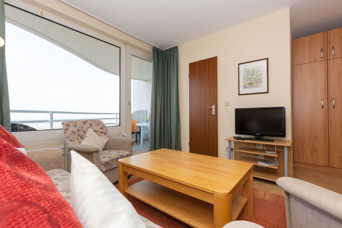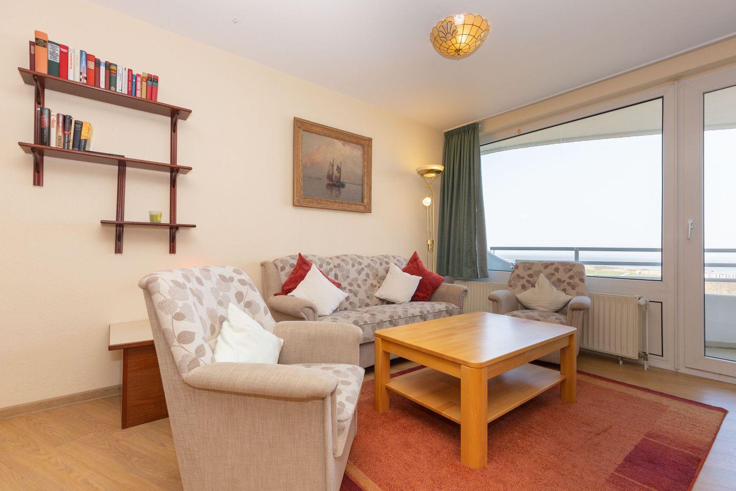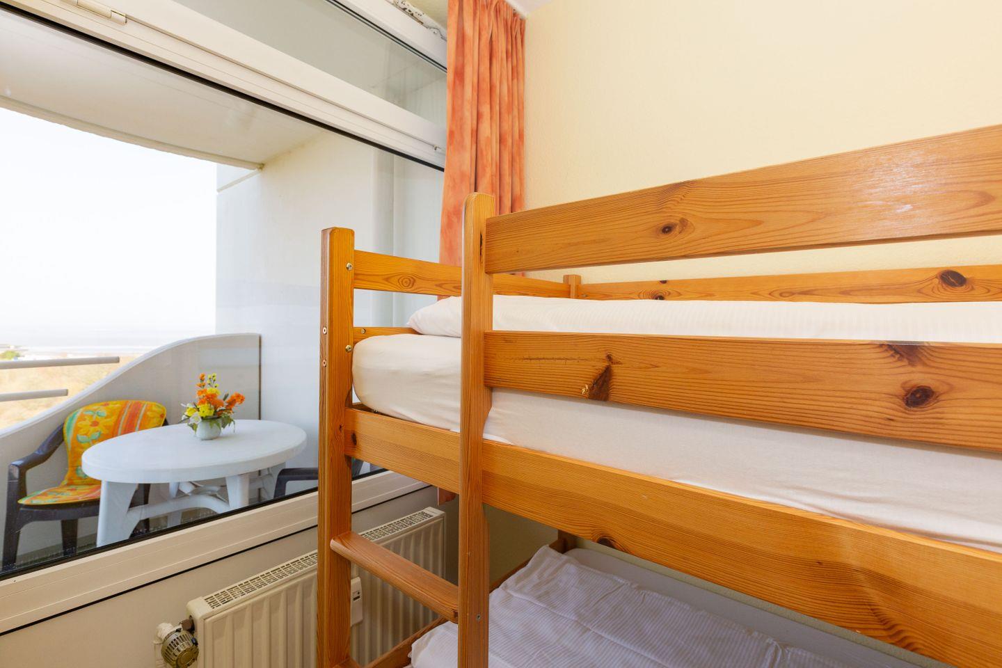 Haus "Lord Nelson", Typ 2, Appartement-Nr. "703", bis 4 Personen, 7. Etage, ca. 40 qm Wohnungsgröße, Weltnaturerbe Wattenmeer (Meerblick Richtung Neuwerk), Wohnbereich mit Schrankbett (einzeln klappbar), separates kleines Kinderzimmer mit Etagenbett, Dusche/WC, Küchenzeile mit Mikrowelle, Telefon, Kabel-TV, Balkon, Außenstellplatz, Haustiere sind nicht erlaubt, Strandkorb im Sommer 2026, Wlan-Zugang