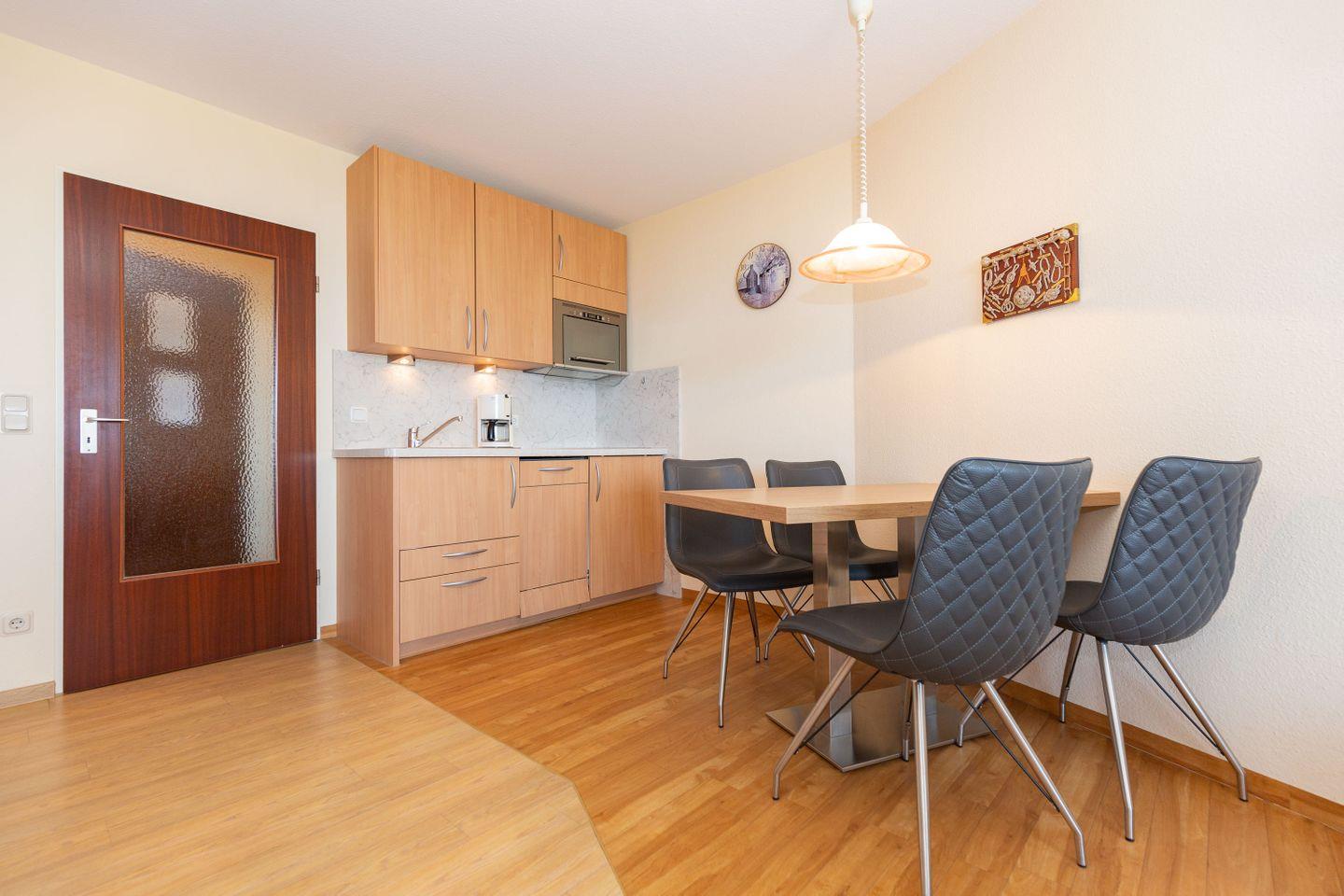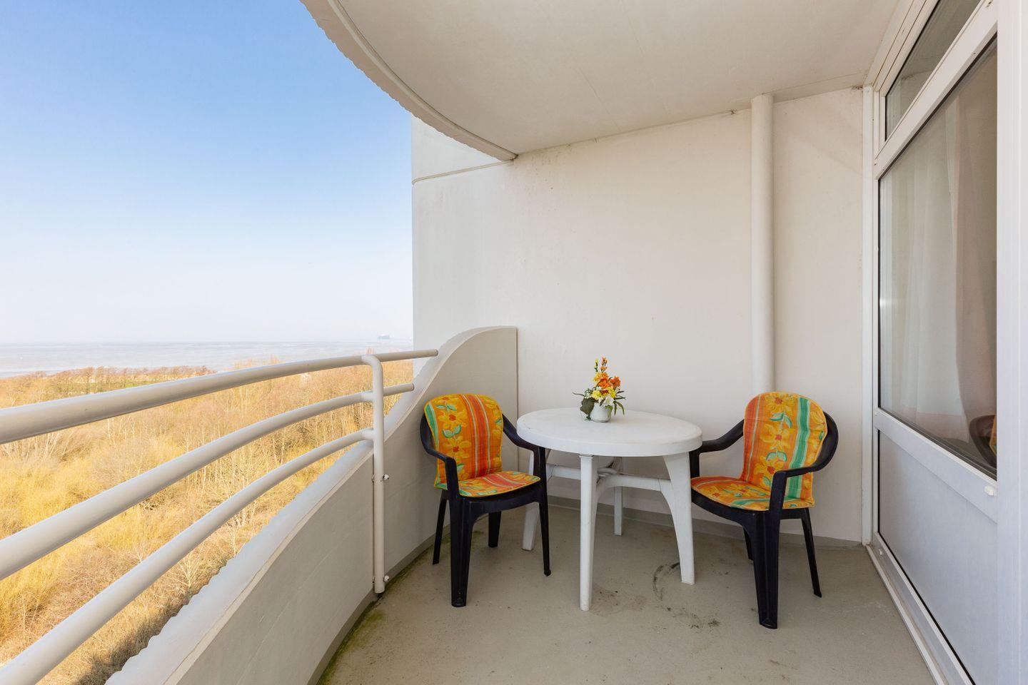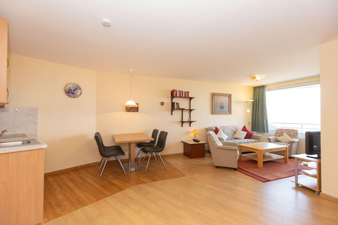Haus "Lord Nelson", Typ 2, Appartement-Nr. "703", bis 4 Personen, 7. Etage, ca. 40 qm Wohnungsgröße, Weltnaturerbe Wattenmeer (Meerblick Richtung Neuwerk), Wohnbereich mit Schrankbett (einzeln klappbar), separates kleines Kinderzimmer mit Etagenbett, Dusche/WC, Küchenzeile mit Mikrowelle, Telefon, Kabel-TV, Balkon, Außenstellplatz, Haustiere sind nicht erlaubt, Strandkorb im Sommer 2026, Wlan-Zugang