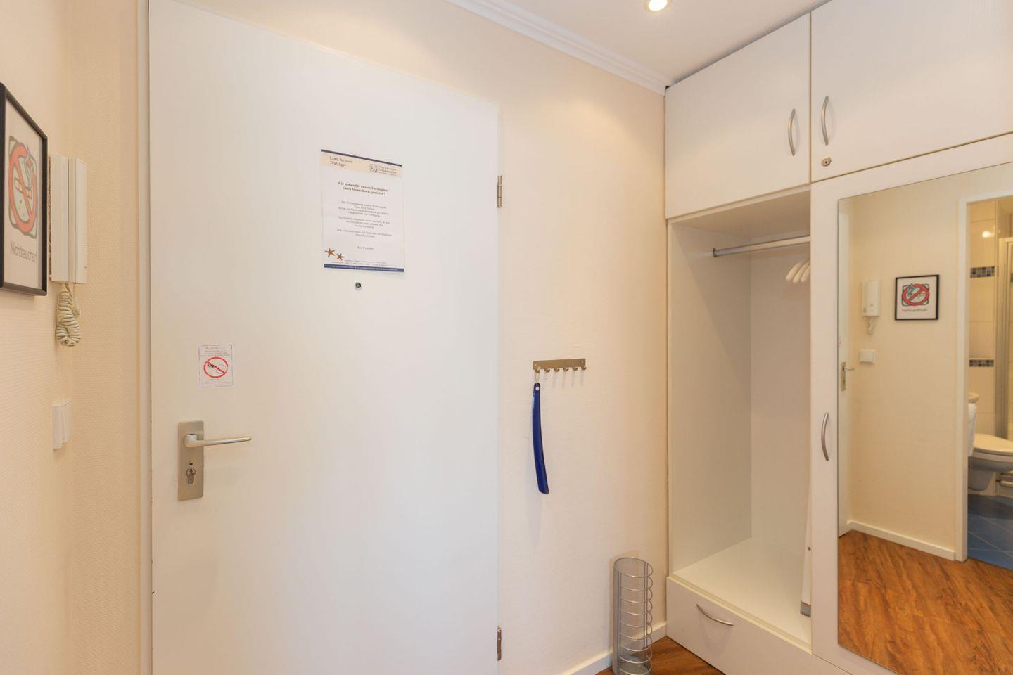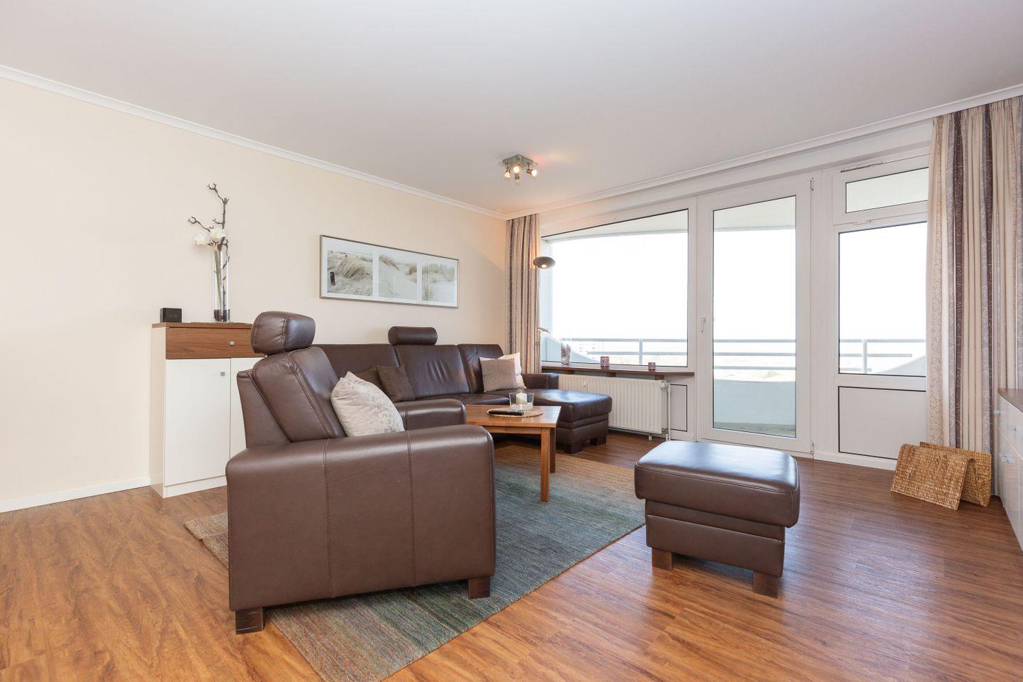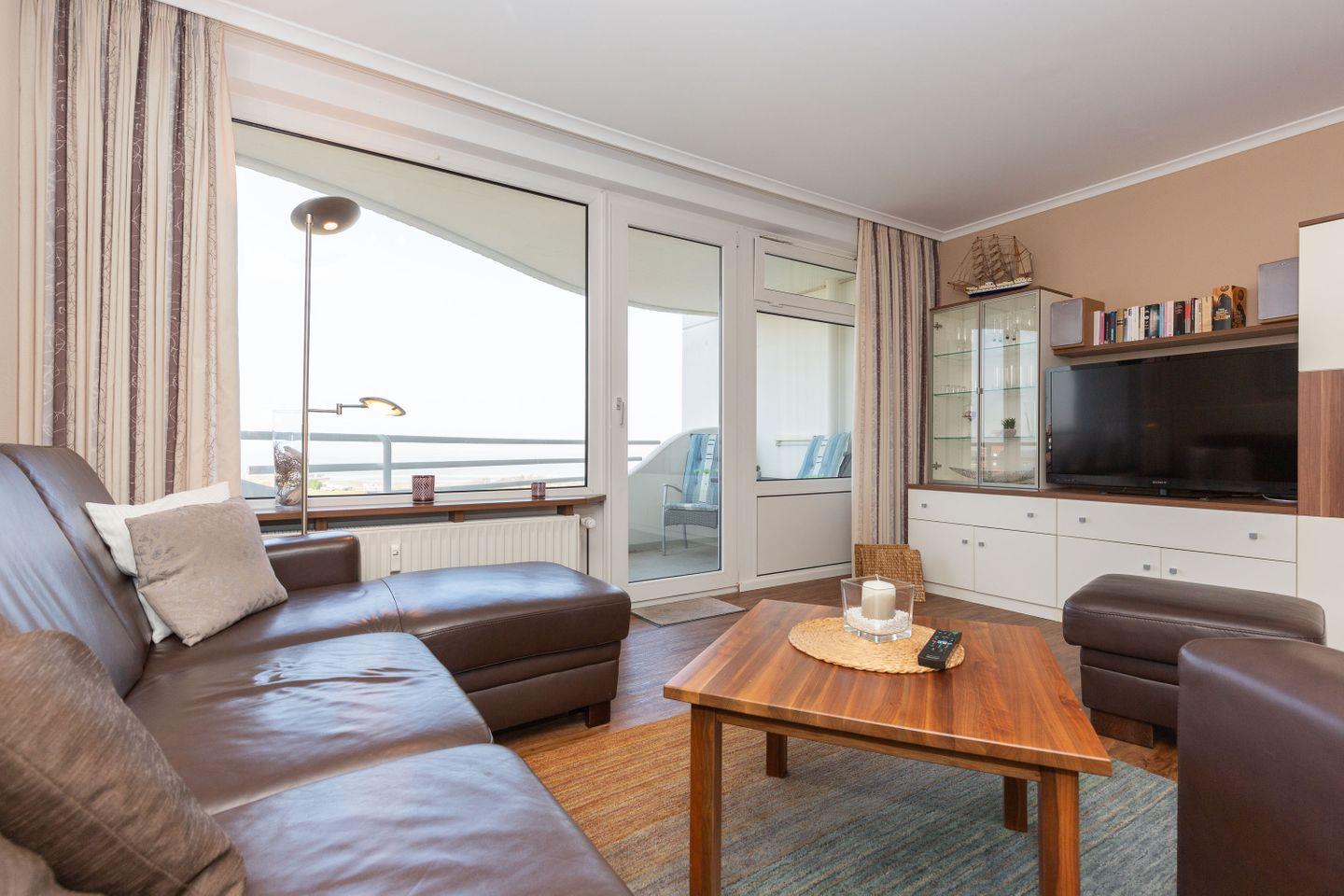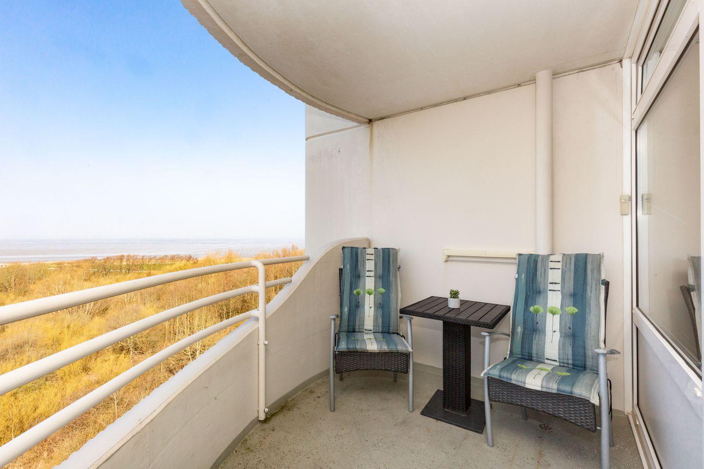 Haus "Lord Nelson", Typ 4, App.-Nr. 702, bis 2 Pers., 7.Etage, ca. 40 qm Größe, am Weltnaturerbe Wattenmeer (Meerblick Richtung Neuwerk), Wohnbereich mit Schrankbett, Dusche, WC, Küchenzeile mit Geschirrspüler und Mikrowelle, Balkon, Kabel-TV, kostenloser WLAN-Zugang im App., Garagenstellplatz, Nichtraucherwohnung, Haustiere nicht erlaubt, Strandkorb im Sommer 2025.