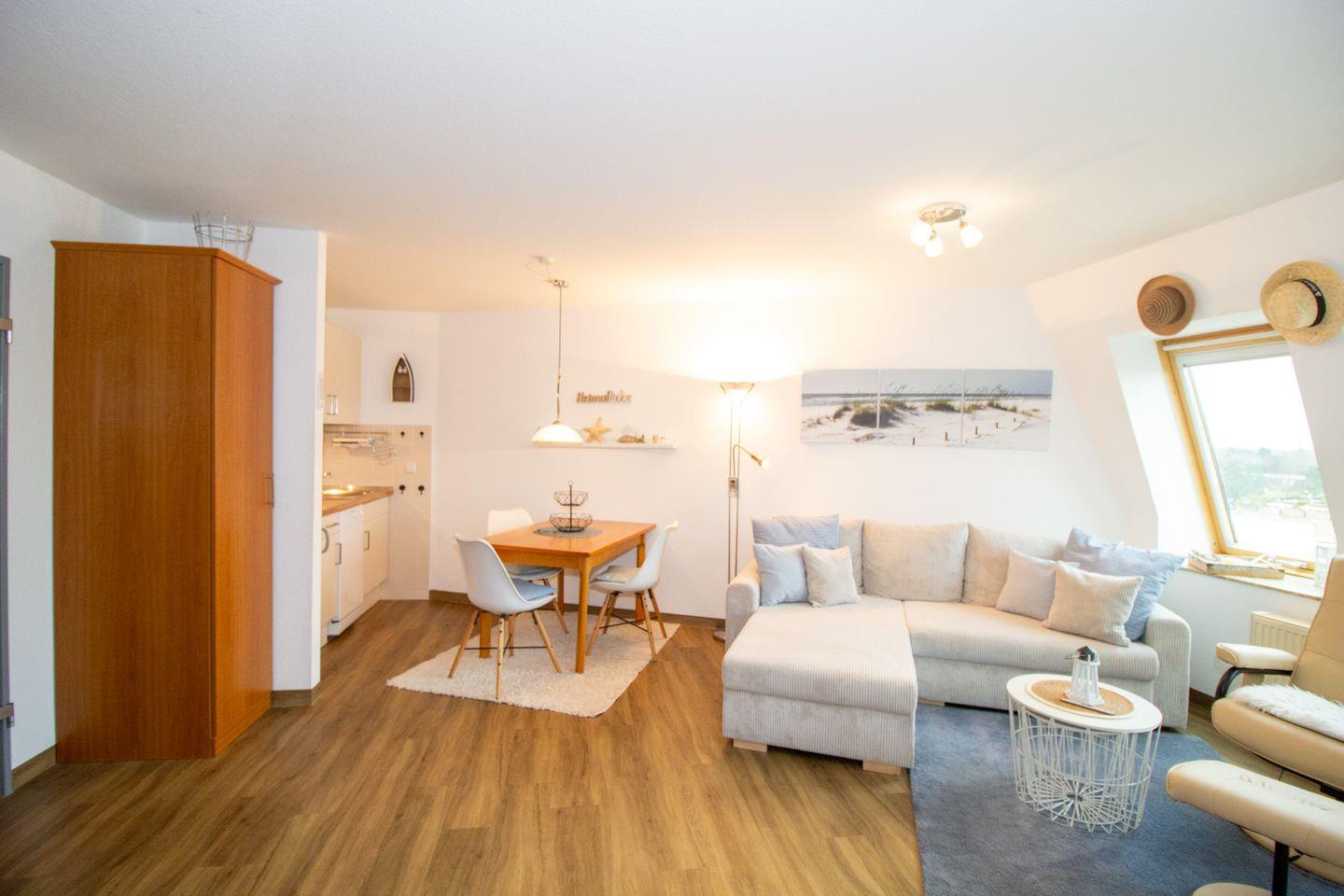 In der 2-Zimmer-Ferienwohnung im 5. Stock (Aufzug bis zur 4. Etage, dann übers Treppenhaus) erwartet unsere Urlaubsgäste ein romantischer Ausblick auf die Nordsee in Richtung Neuwerk. Die FeWo bietet Platz für bis zu 3 Urlaubsgäste und eignet sich optimal für Familien oder Paare. Das Urlaubsdomizil selbst punktet mit gemütlicher Einrichtung und Wohlfühlambiente. Die strandnahe Lage ermöglicht spontane Strandausflüge und Spaziergänge zur nahegelegenen Kugelbake, dem Wahrzeichen Cuxhavens.
