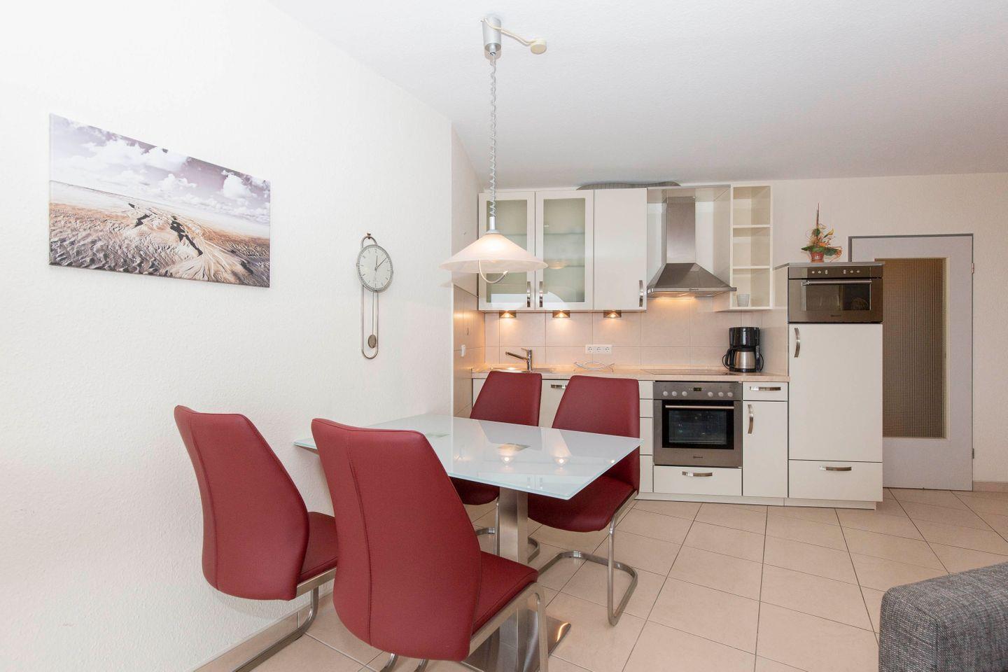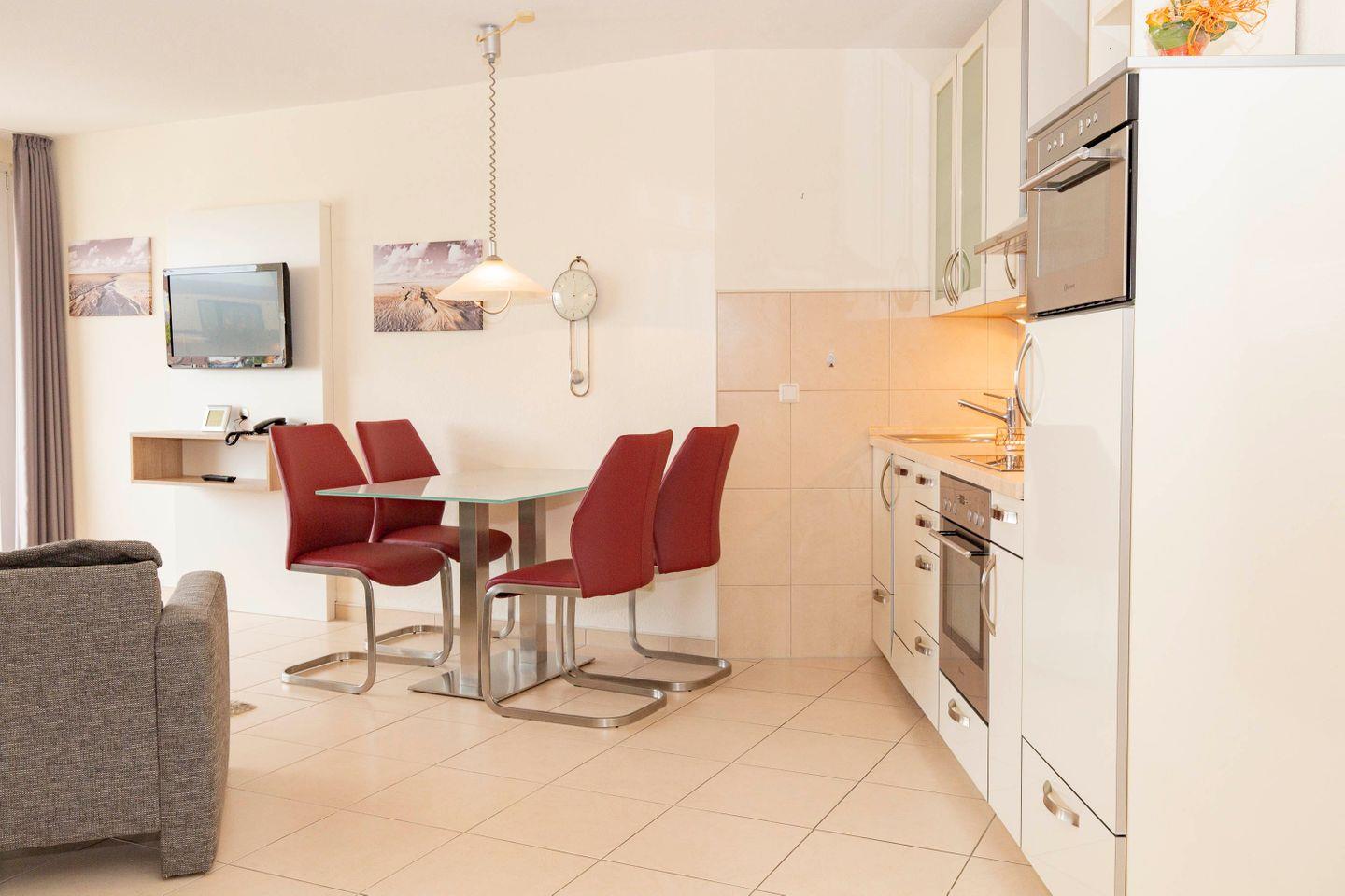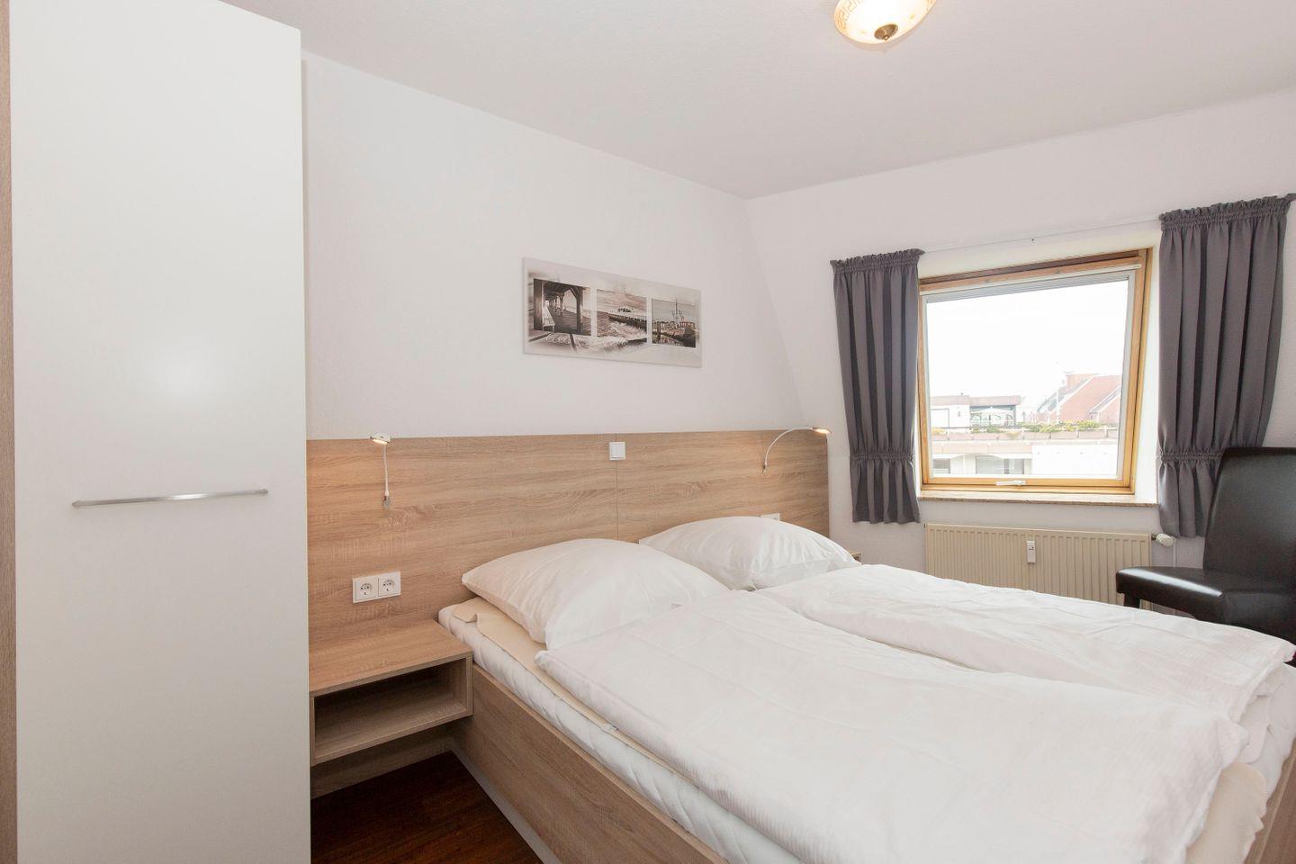 Haus "Trafalgar", Typ B, App.-Nr. "425", bis 4 Personen, 4. Etage, ca. 55 qm Größe, Westseite (Meerblick/Richtung Neuwerk), Wohn/Schlafraum mit Schlafcouch, sep. Schlafzimmer mit Doppelbett, Küchenzeile mit Mikrowelle/Geschirrspüler, Dusche/WC, das Appartement ist bis auf das Schlafzimmer gefliest, Balkon, Telefon, Kabel-TV, kostenl. W-LAN im App., Tiefgaragenstellplatz, Strandkorb im Sommer 2026, max. 2 Hunde pro Buchung gegen Gebühr erlaubt, Nichtraucher