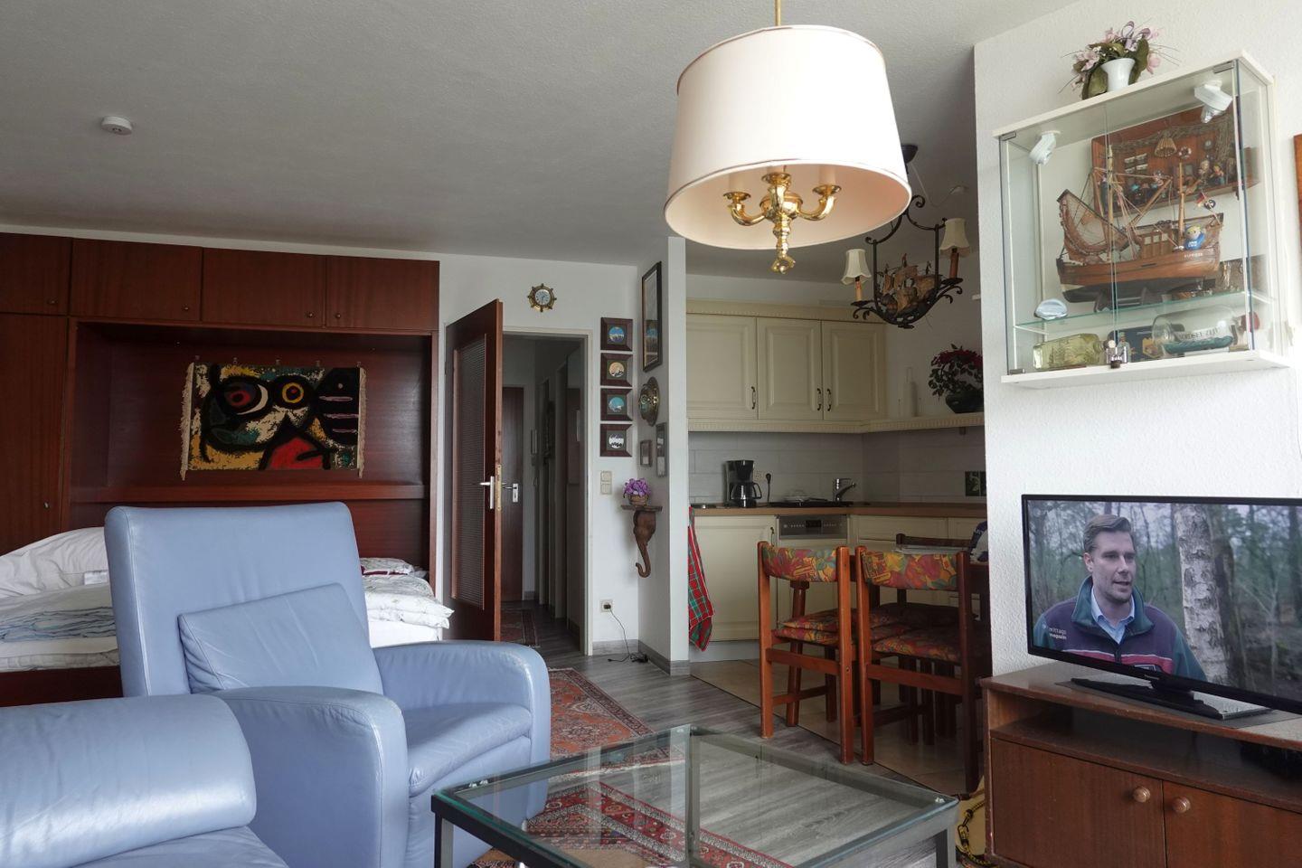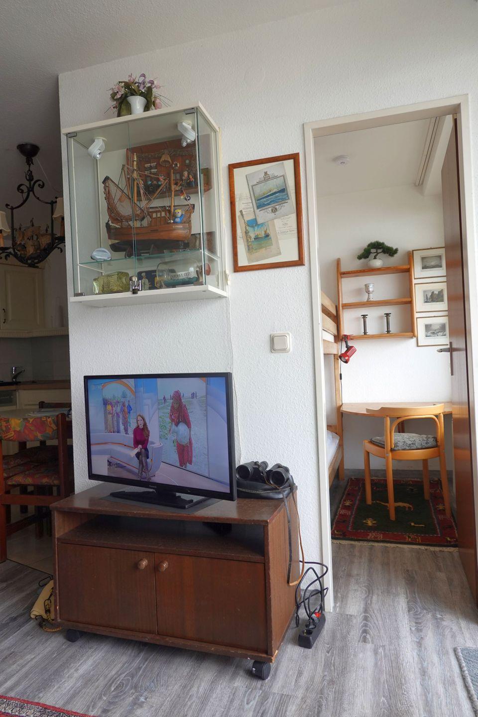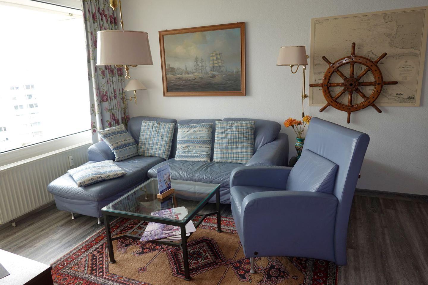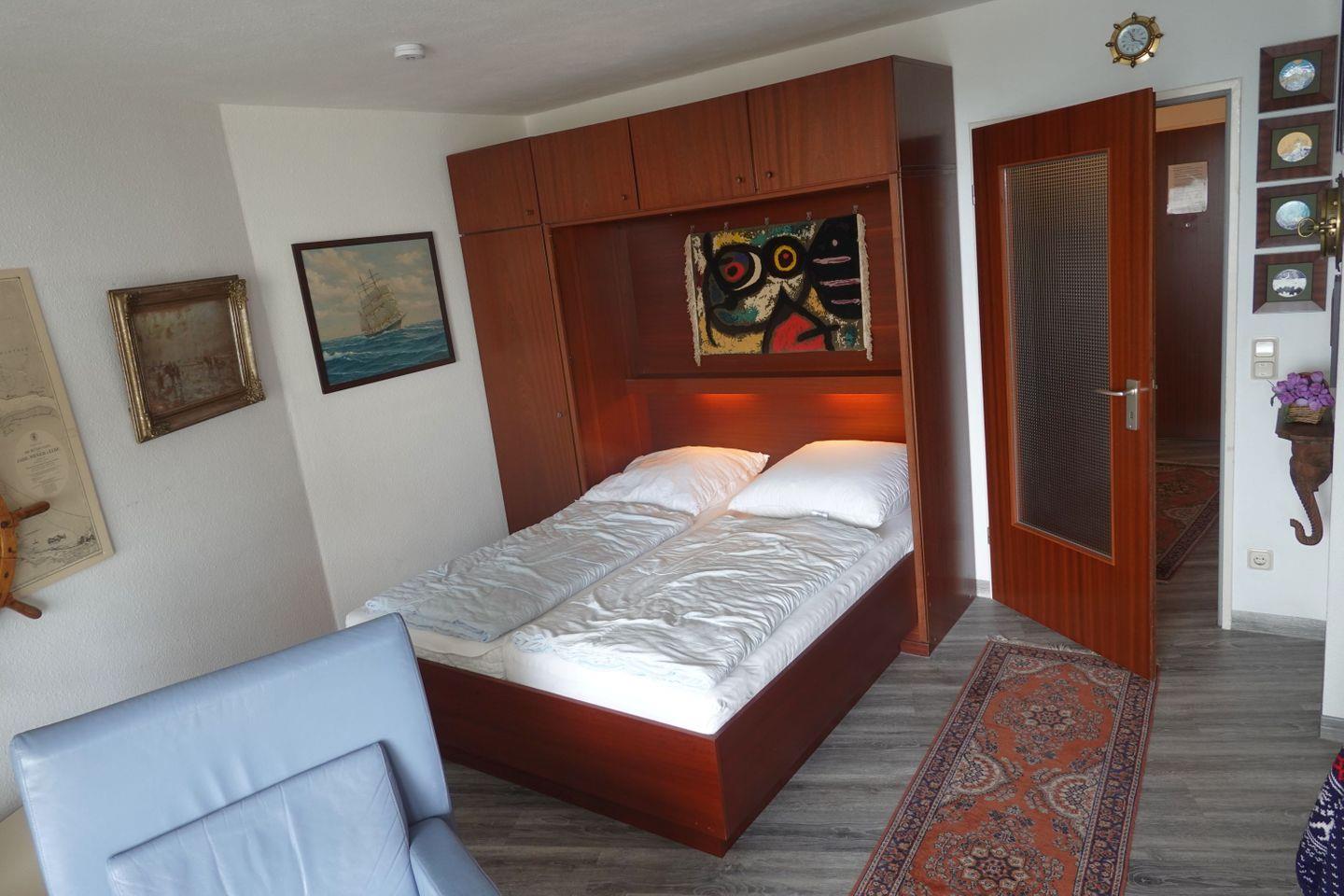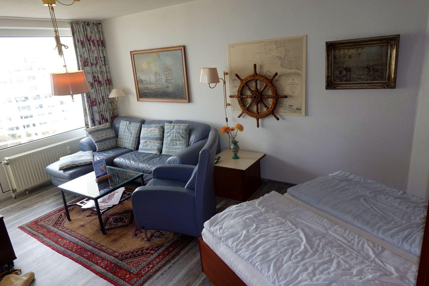 Haus "Lord Nelson", Typ 2, App.-Nr. "716", bis 4 Pers., 7.te Etage, ca. 40 qm Größe, Weltschifffahrtsweg (seitlicher Meerblick Richtung Elbe), Wohnbereich mit Doppelbett, separates kleines Kinderzimmer mit Etagenbett, Dusche/WC, Küchenzeile mit Mikrowelle, Geschirrspüler, Telefon, Kabel-TV, Balkon, Tiefgaragenstellplatz, kein WLAN