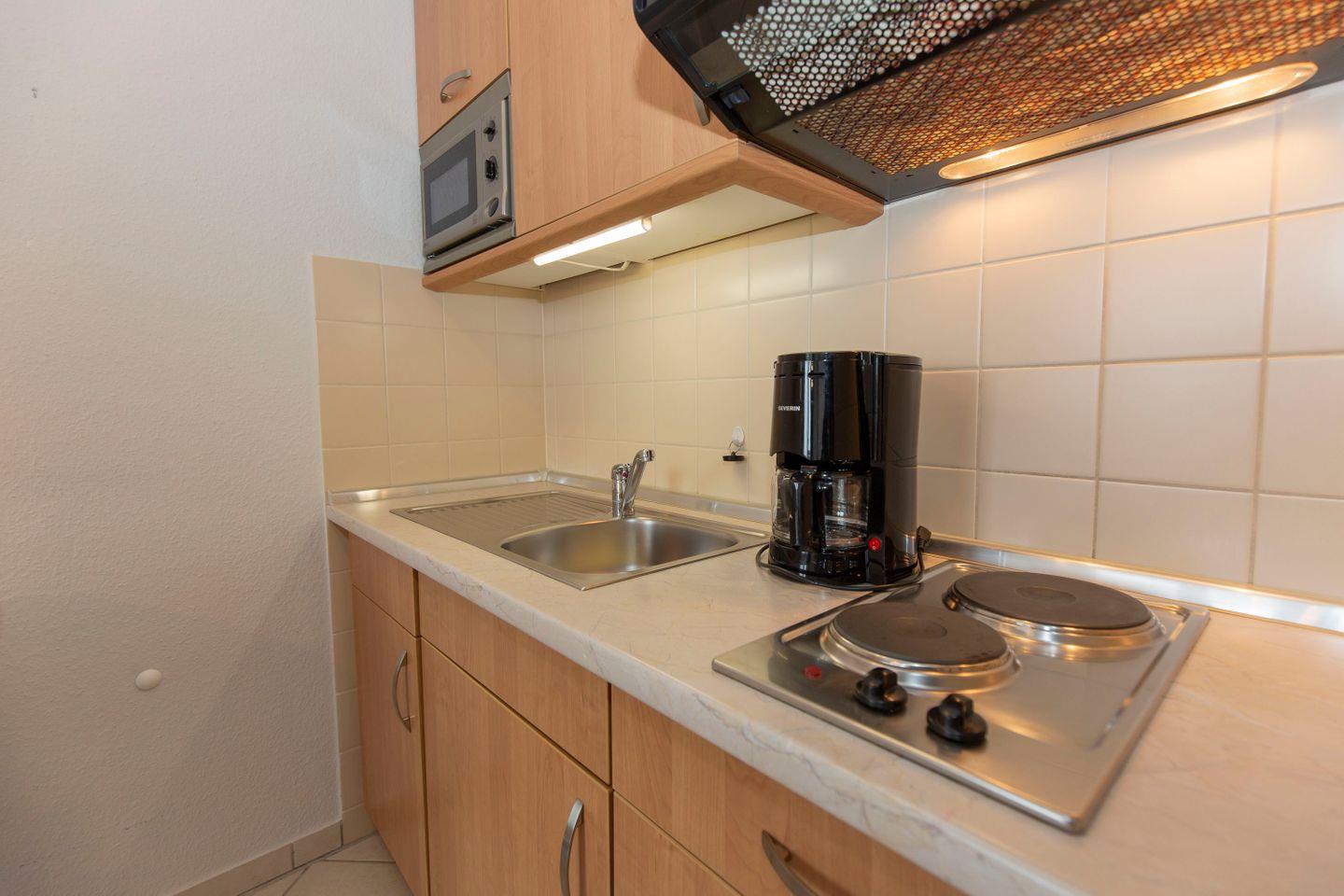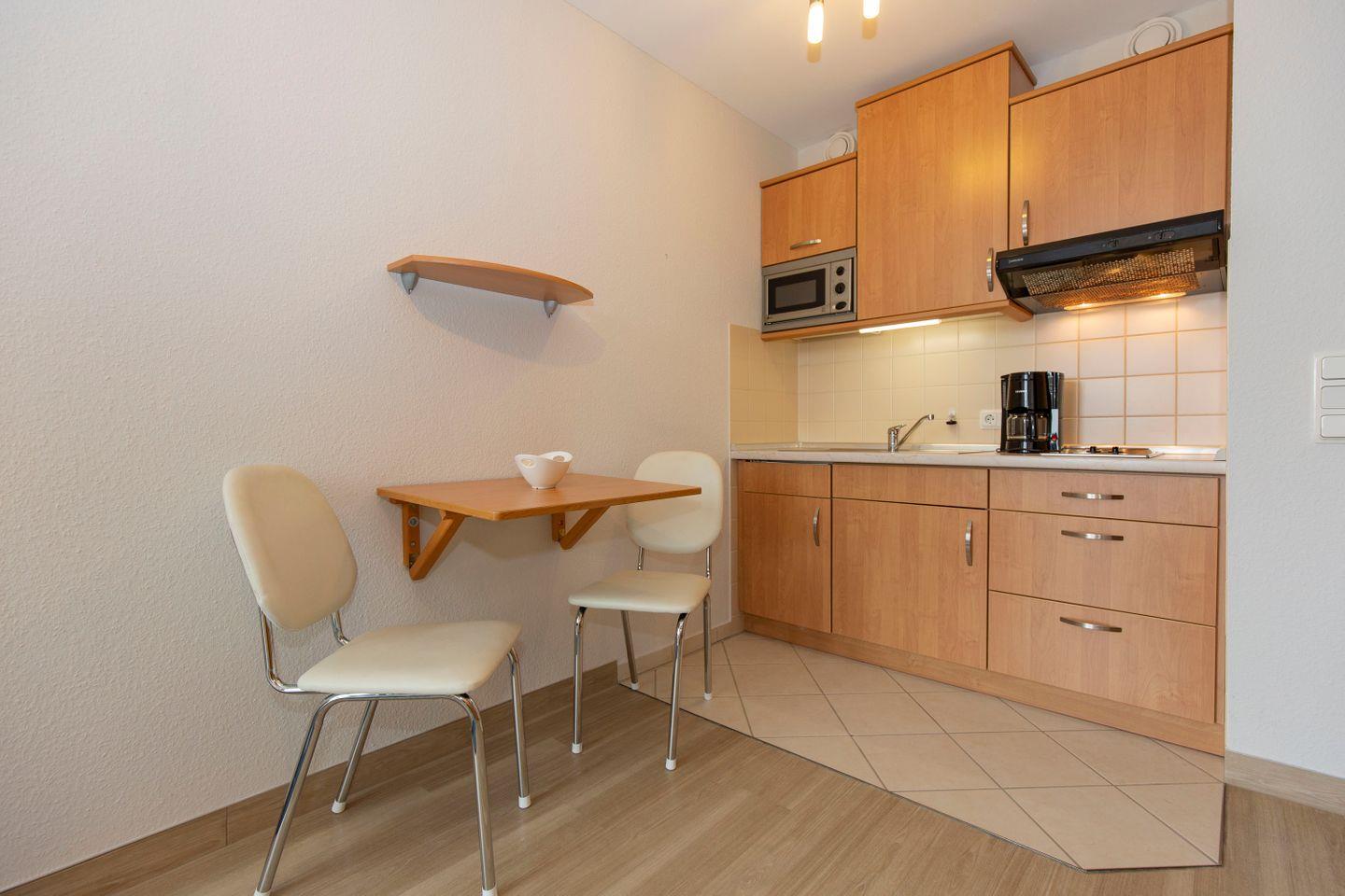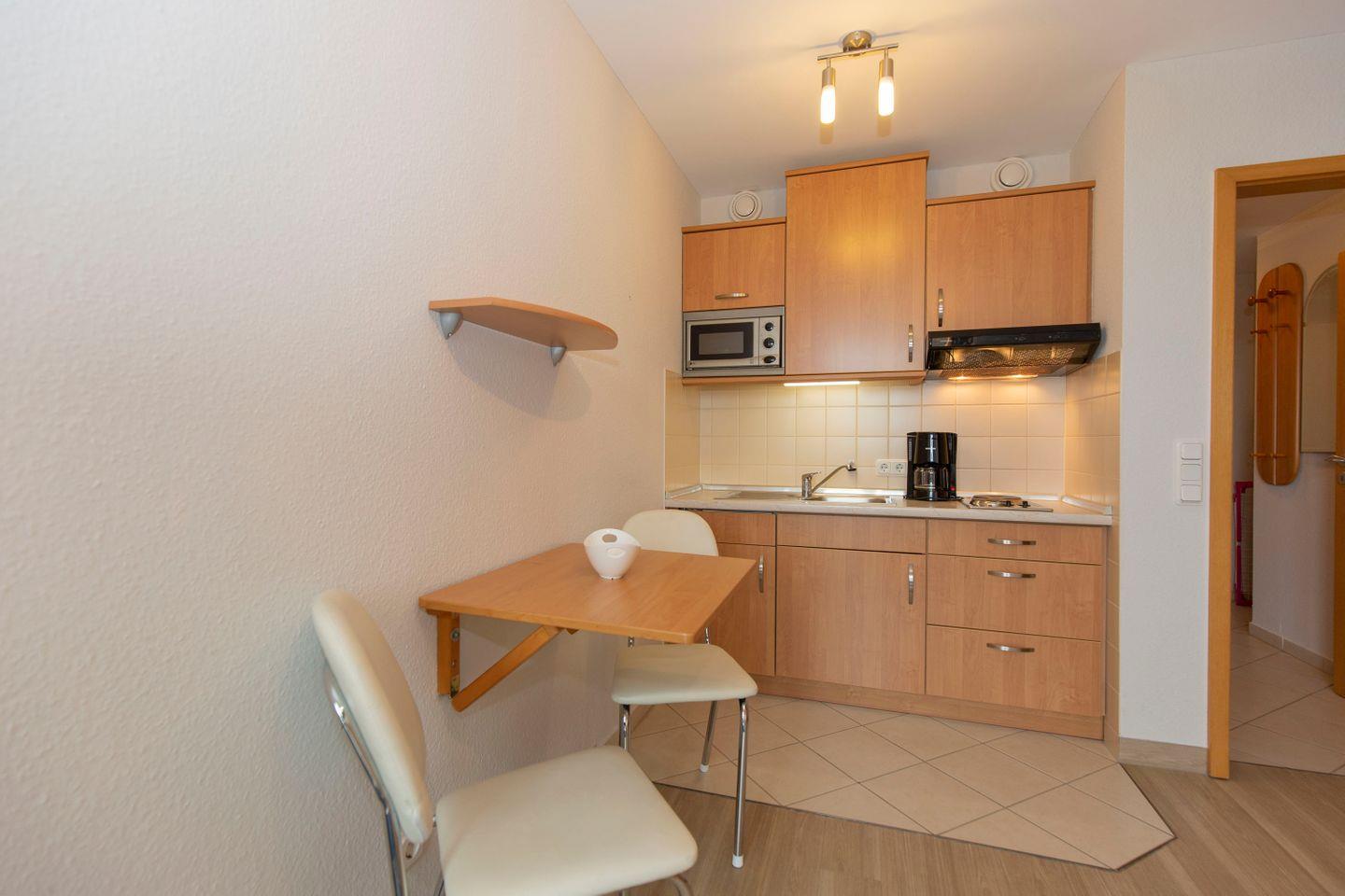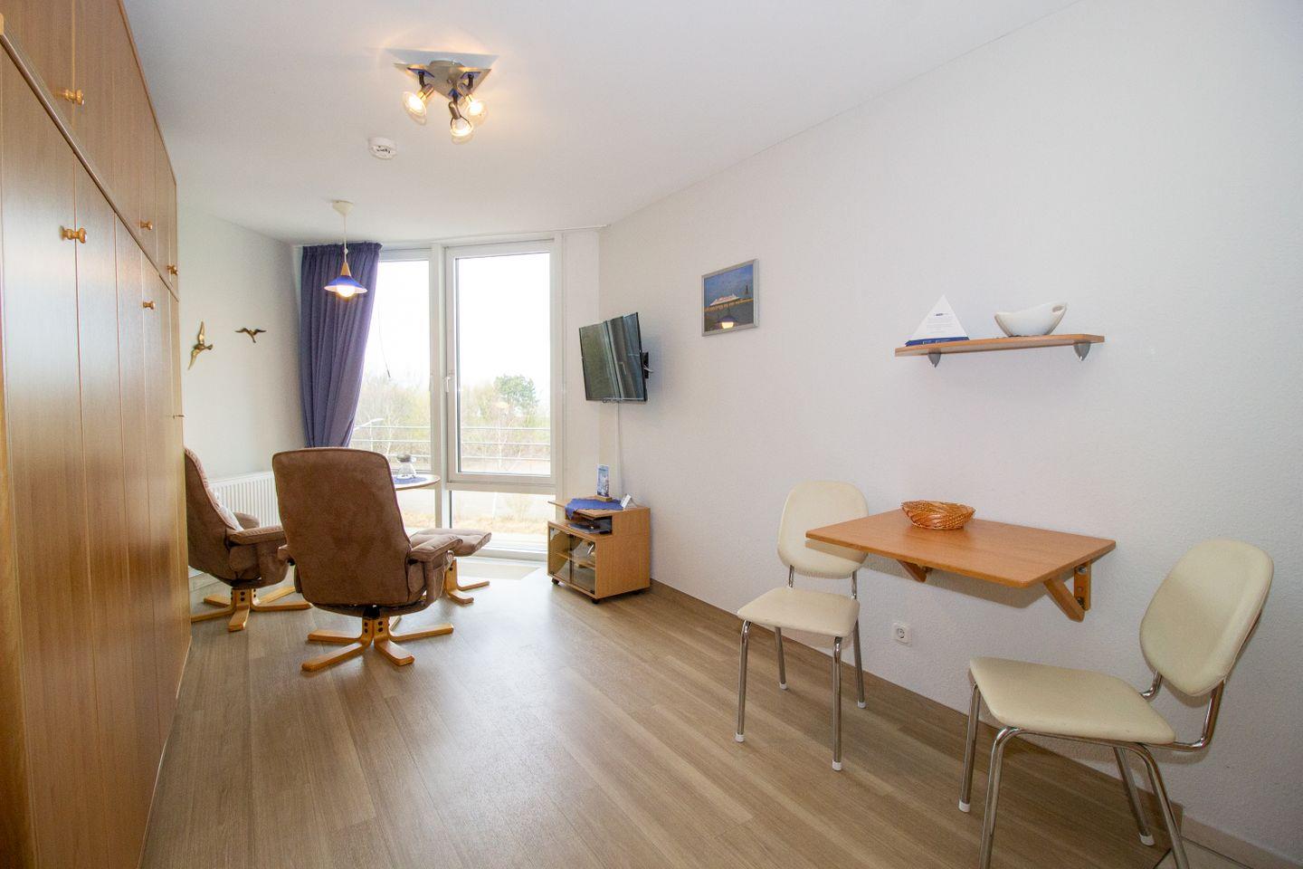 Haus "Kurpark-Residenz", Typ A, App.-Nr. "218 A", bis 2 Personen, 2. OG, Nord/Westseite (mit Seesicht Richtung "Elbe"), ca. 30 m² Größe, Wohnzimmer mit Schrankbett, Dusche/WC, Küchenzeile mit Mikrowelle, ohne Balkon, SAT-TV, PKW-Außenstellplatz, Nichtraucher, keine Haustiere gestattet, WLAN im App., Achtung: Kombi-Buchung mit der Nachbarwohnung 218-B zum Sonderpreis möglich!