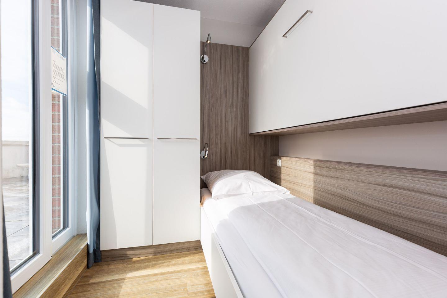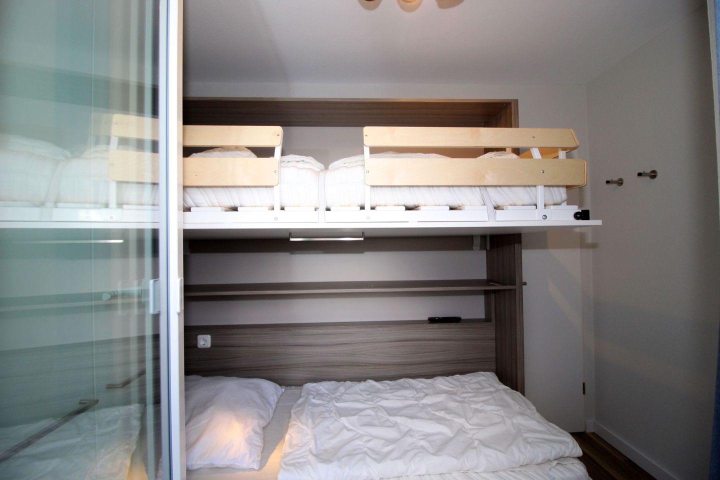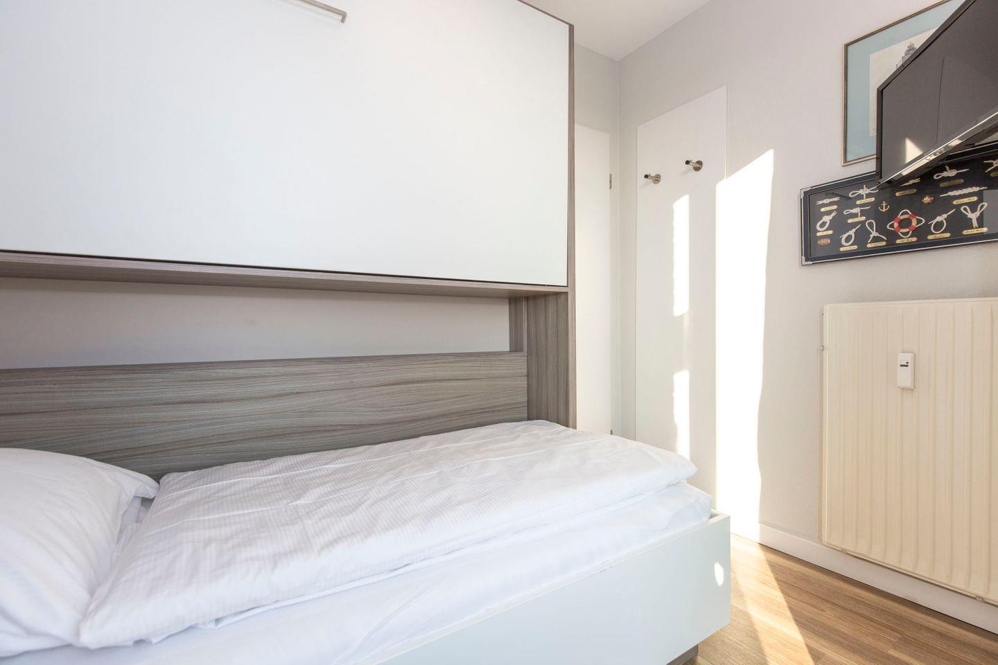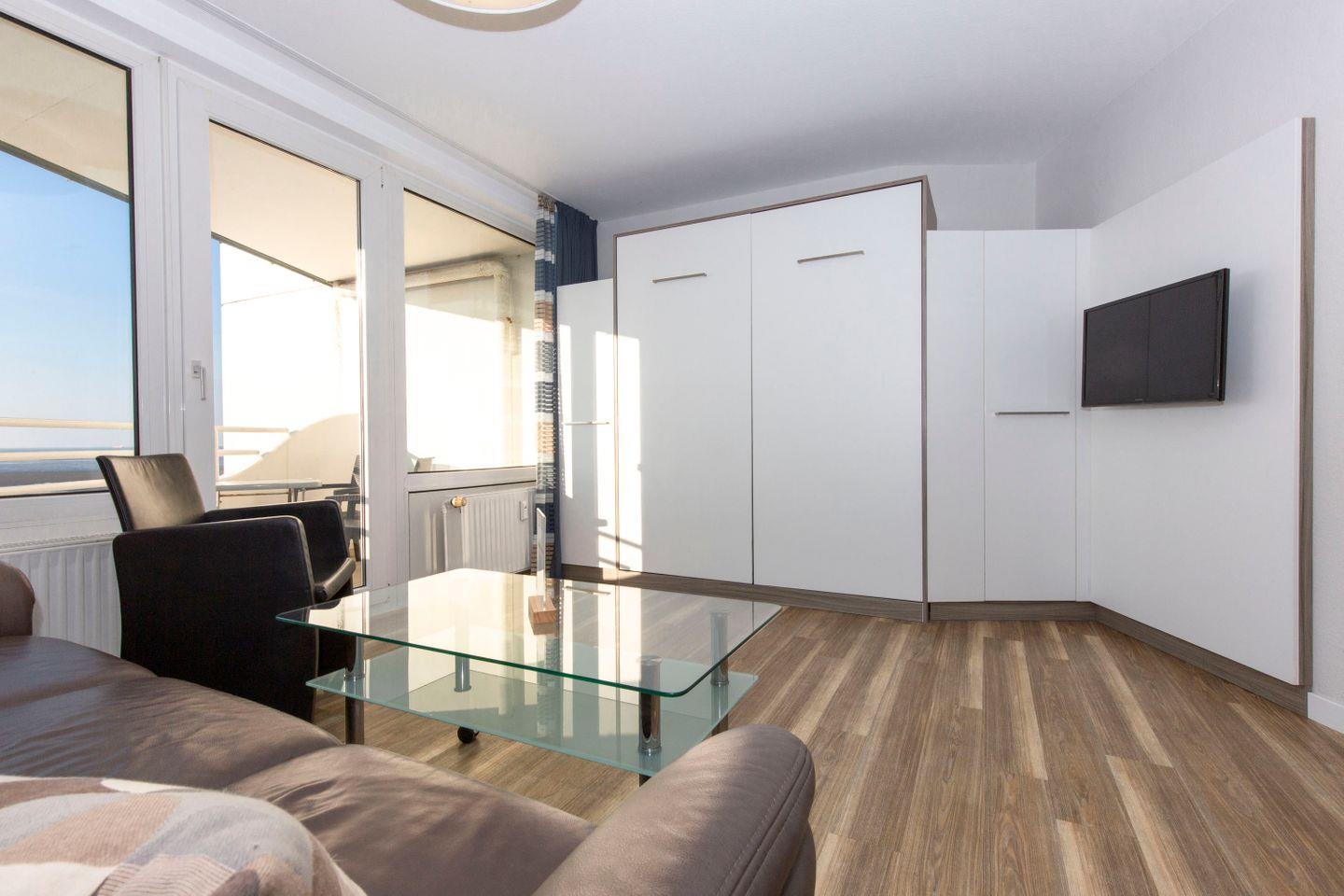 Haus "Lord Nelson", Typ 1, App.-Nr. "807", bis 4 Pers., 8. Etage, ca. 43 qm Größe, zur Westseite (Meerblick Richtung Neuwerk), Wohnbereich mit Schrankbett, sep. kleines Kinderzimmer mit Einzelbett und Schiffskojen-Bett sowie TV, Dusche/WC, Küchenzeile mit Geschirrspüler/Mikrowelle, Telefon, Kabel-TV, kostenl. WLAN-Anschluss im App., Balkon, Dachterrasse mit Strandkorb, Strandkorb im Sommer 2026, Tiefgaragenstellplatz.