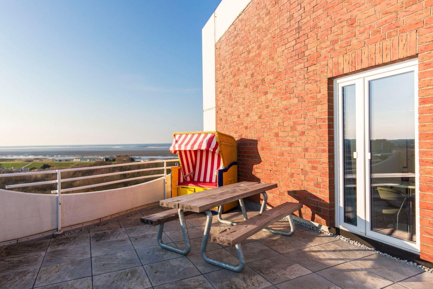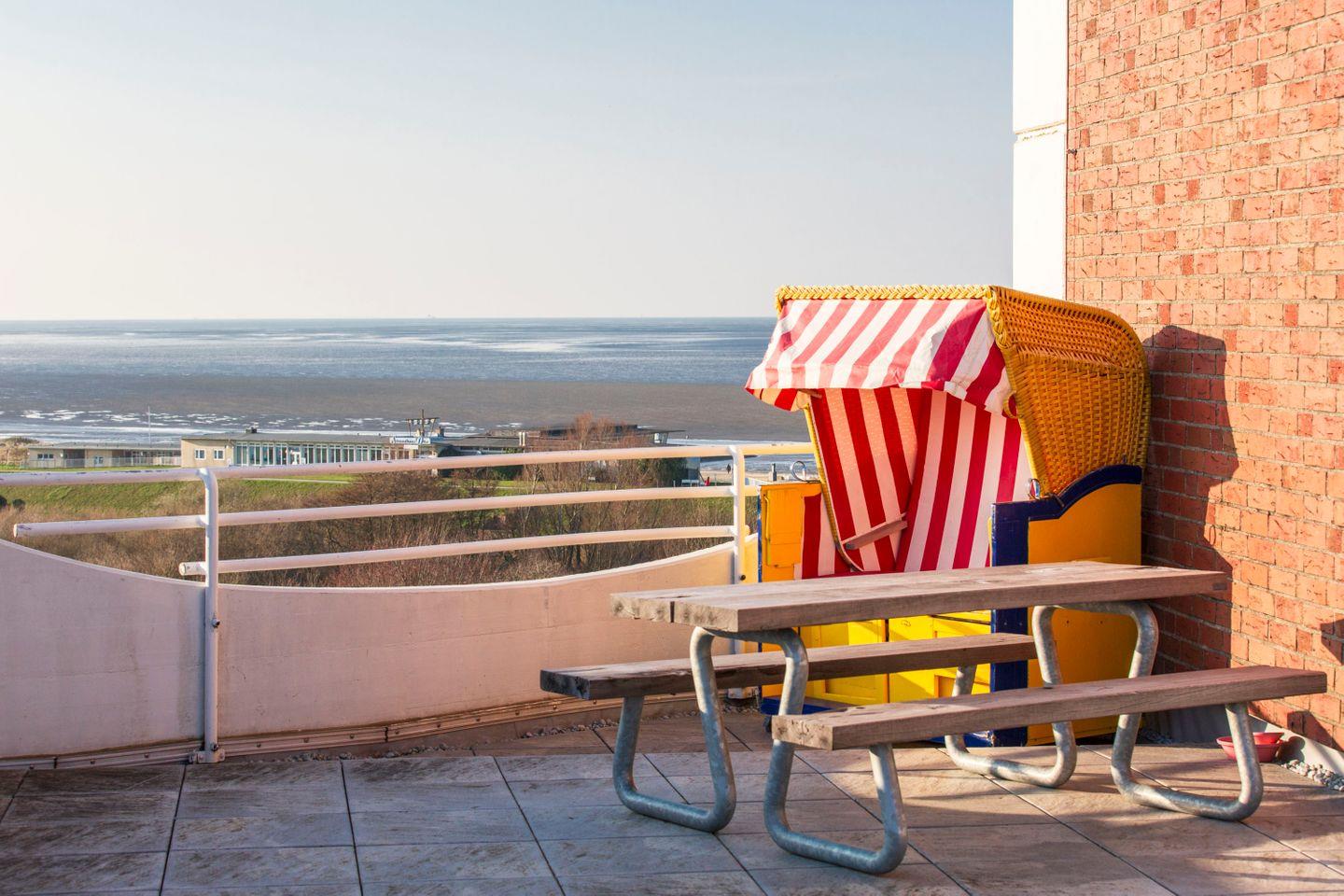Neben einem möblierten Balkon erwartet Sie eine große Dachterrasse, die mit einem Strandkorb und rustikalen Holzmöbeln bestückt ist. Mit Blick auf die Nordsee in Richtung Neuwerk können Sie hier den Urlaubstag in geselliger Runde ausklingen lassen. Ein absolutes Highlight.