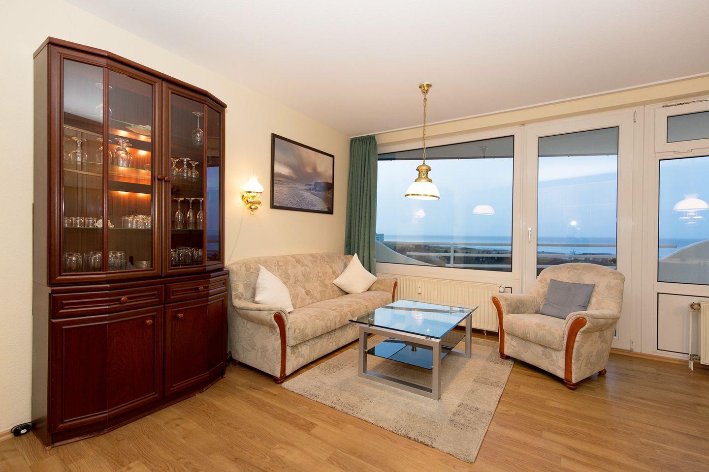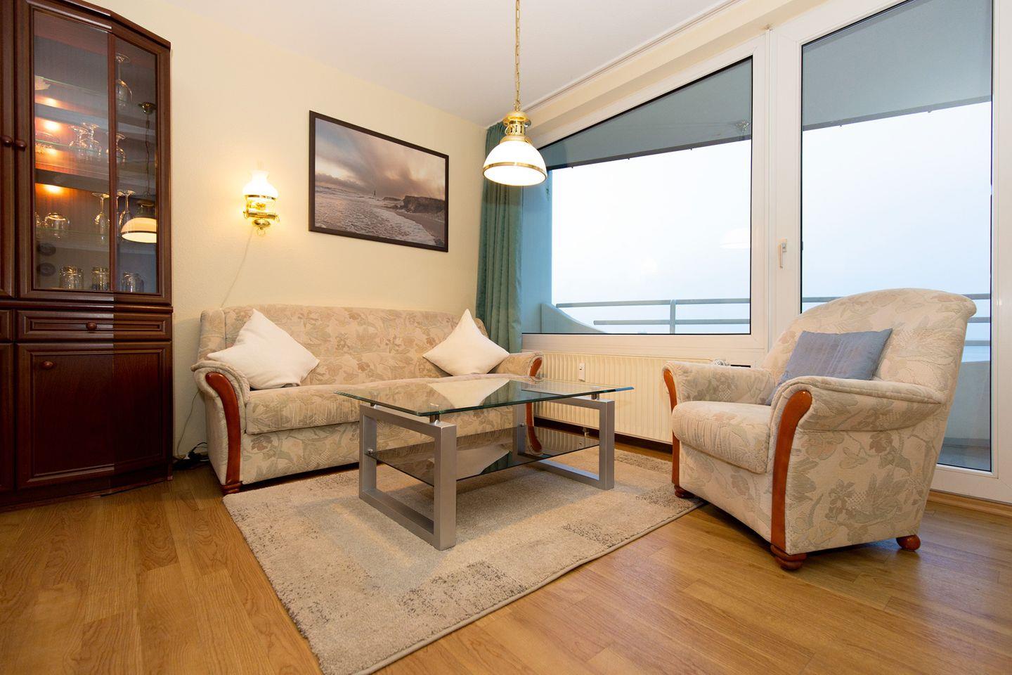 Haus "Lord Nelson", Typ 4, App.-Nr. "806", bis 2 Personen, 8. Etage, ca. 40 qm Größe, zum Weltnaturerbe Wattenmeer (Meerblick Richtung Neuwerk), Wohnbereich mit Schrankbett (einzeln klappbar), Dusche/WC, kleine Küchenzeile mit Abstellmöglichkeit unter einer Dachschräge, Kabel-TV, kostenloser W-Lan Zugang, Balkon, Haustiere nicht erlaubt, Nichtraucherwohnung, Tiefgaragenstellplatz.
