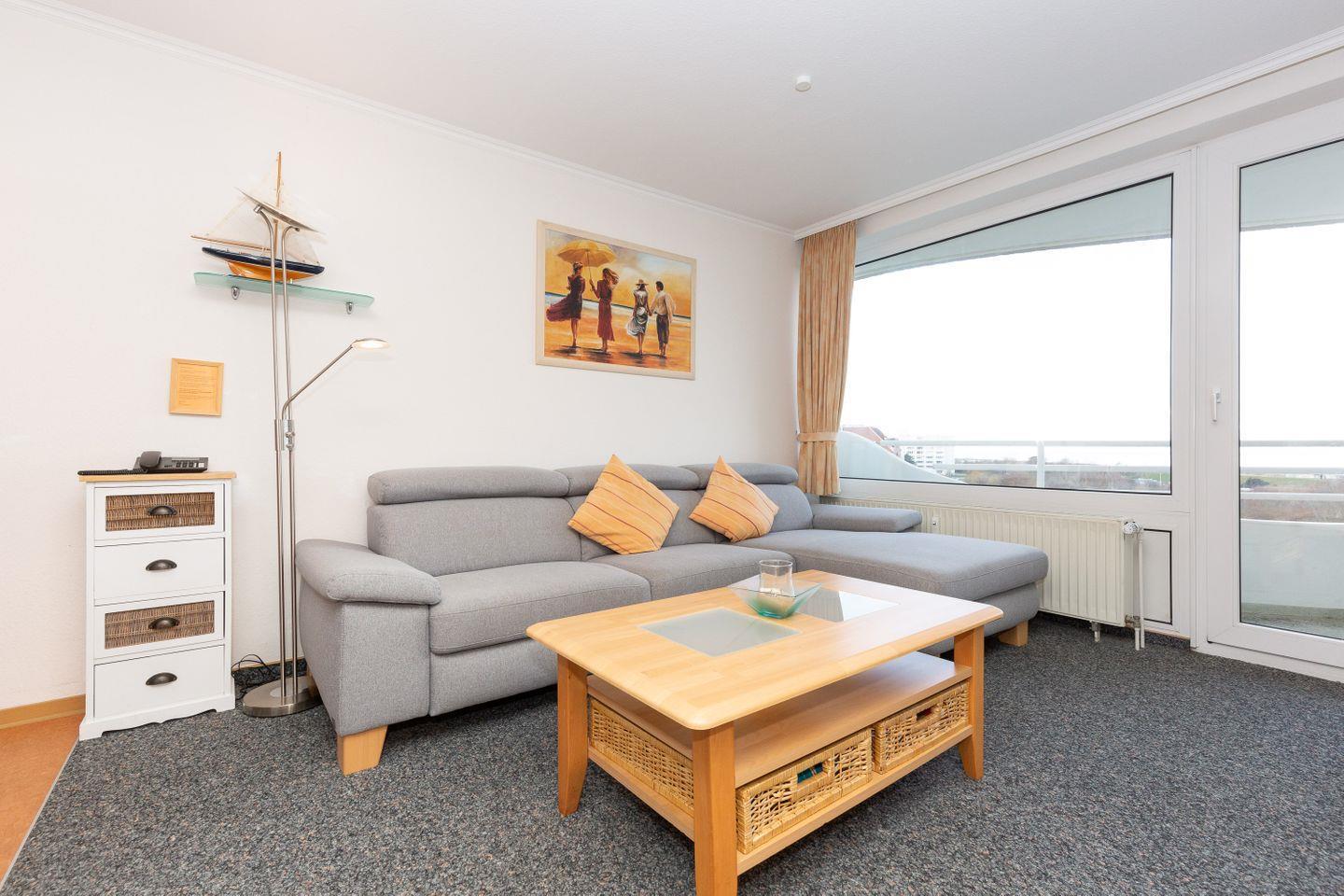 Haus "Lord Nelson", Typ 2, Appartement-Nr. "505", bis 4 Personen, 5. Etage, ca. 40 qm Wohnungsgröße, Weltnaturerbe Wattenmeer (mit Meerblick Richtung Neuwerk), Wohnbereich mit Schrankbett (einzeln klappbar), separates kleines Kinderzimmer mit Etagenbett, Dusche/WC, Küchenzeile mit Mikrowelle und Geschirrspüler, 4-Platten-Ceranfeld, Balkon, Telefon, Kabel-TV, Nichtraucher, Außenstellplatz, Haustiere sind nicht erlaubt, Strandkorb im Sommer 2026.