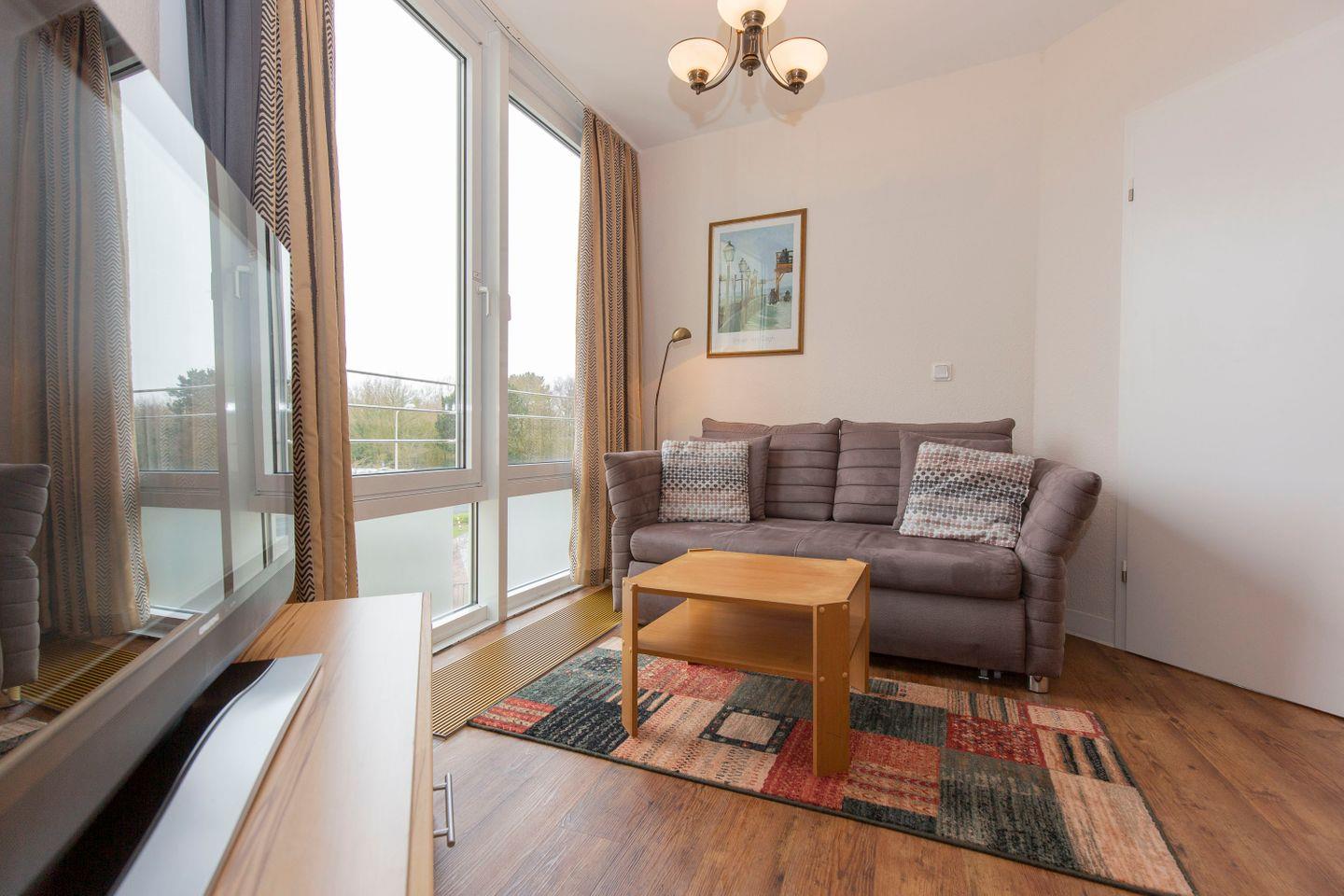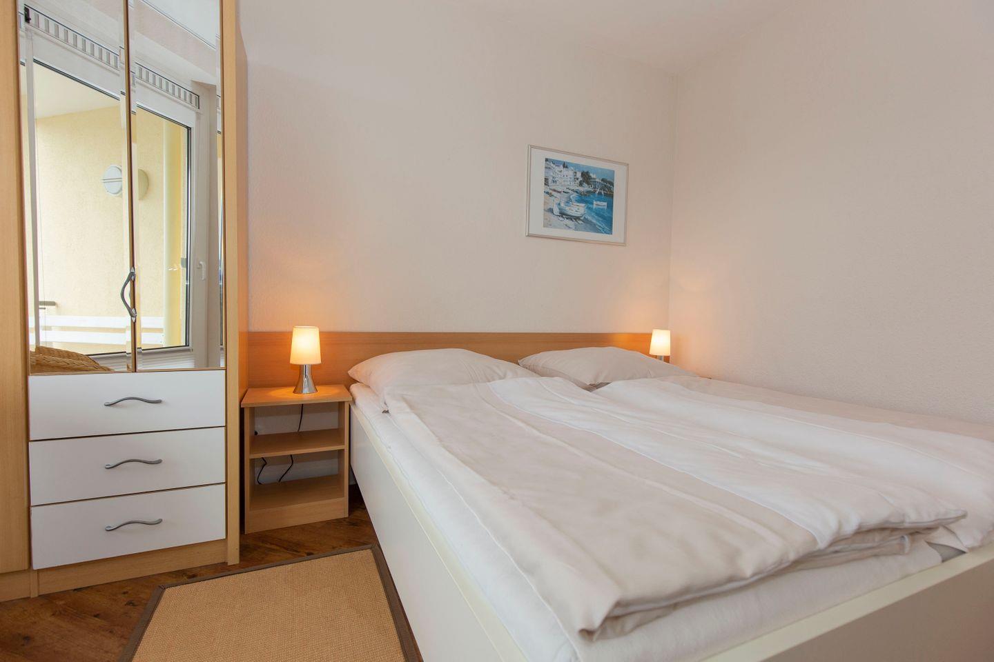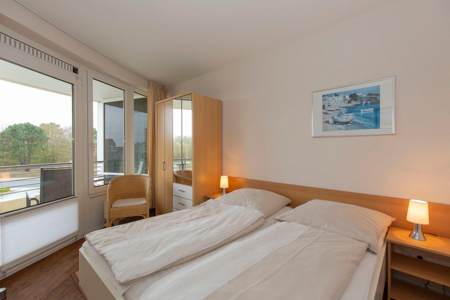 Haus "Kurpark-Residenz", Typ A, App.-Nr. "119", bis 3 Personen, 1.OG, ca. 38 m² Größe, Westseite, Wohnzimmer mit Schlafcouch, separates Schlafzimmer mit Doppelbett, Dusche/WC, Küchenzeile mit Backofen, Loggia, SAT-TV,WLAN im App., Tiefgaragenstellplatz, Nichtraucher, Haustiere sind nicht gestattet, Strandkorb im Sommer 2026.
