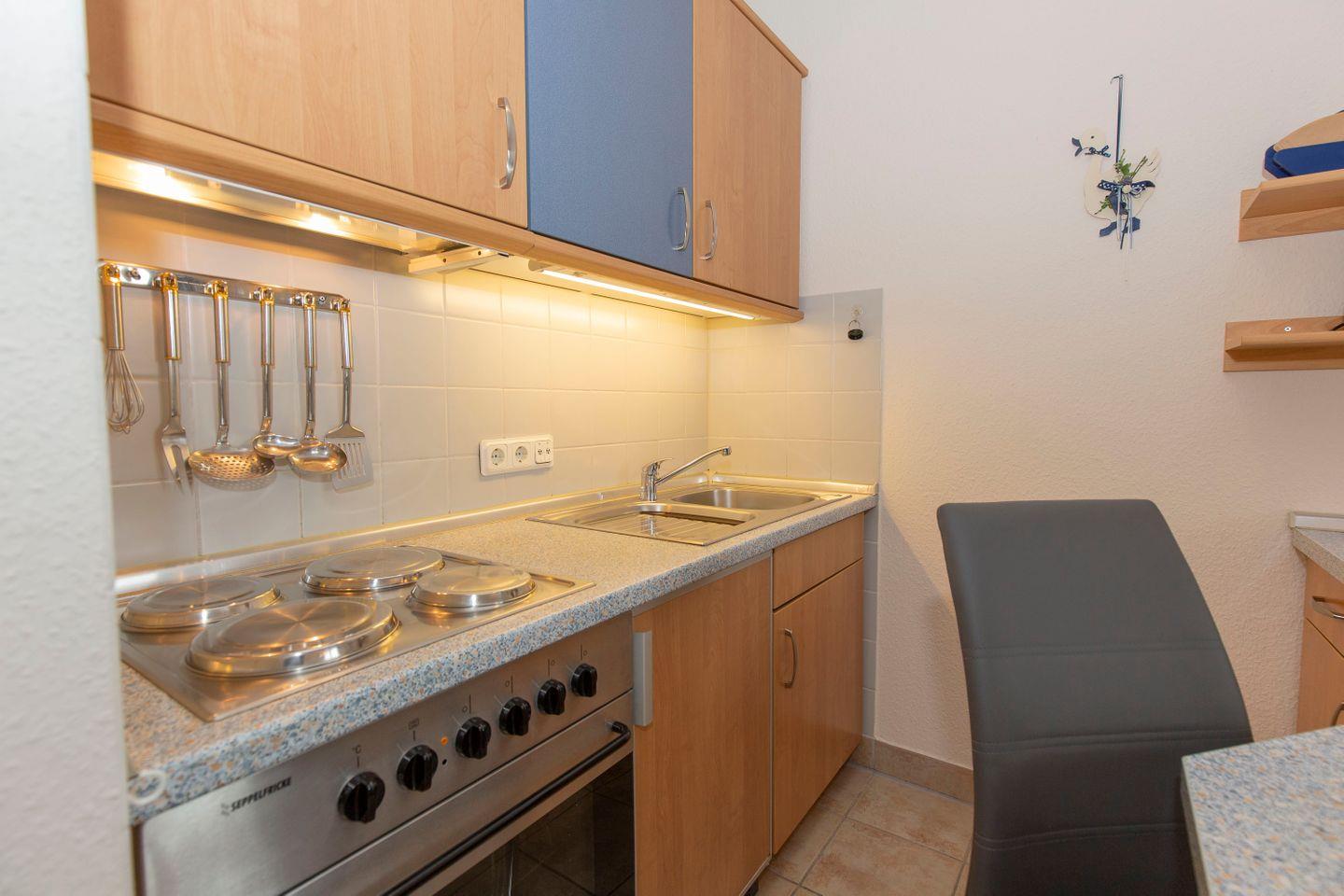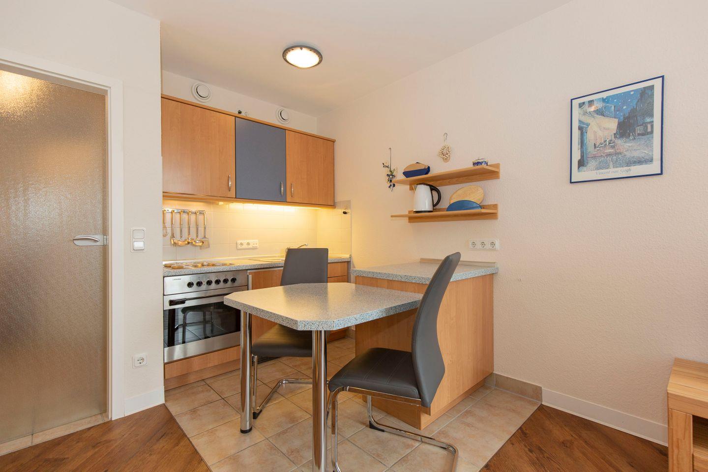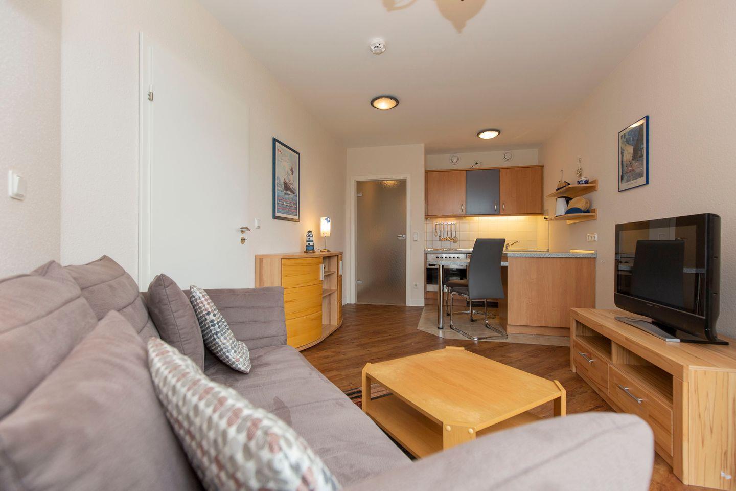 Haus "Kurpark-Residenz", Typ A, App.-Nr. "119", bis 3 Personen, 1.OG, ca. 38 m² Größe, Westseite, Wohnzimmer mit Schlafcouch, separates Schlafzimmer mit Doppelbett, Dusche/WC, Küchenzeile mit Backofen, Loggia, SAT-TV,WLAN im App., Tiefgaragenstellplatz, Nichtraucher, Haustiere sind nicht gestattet, Strandkorb im Sommer 2026.