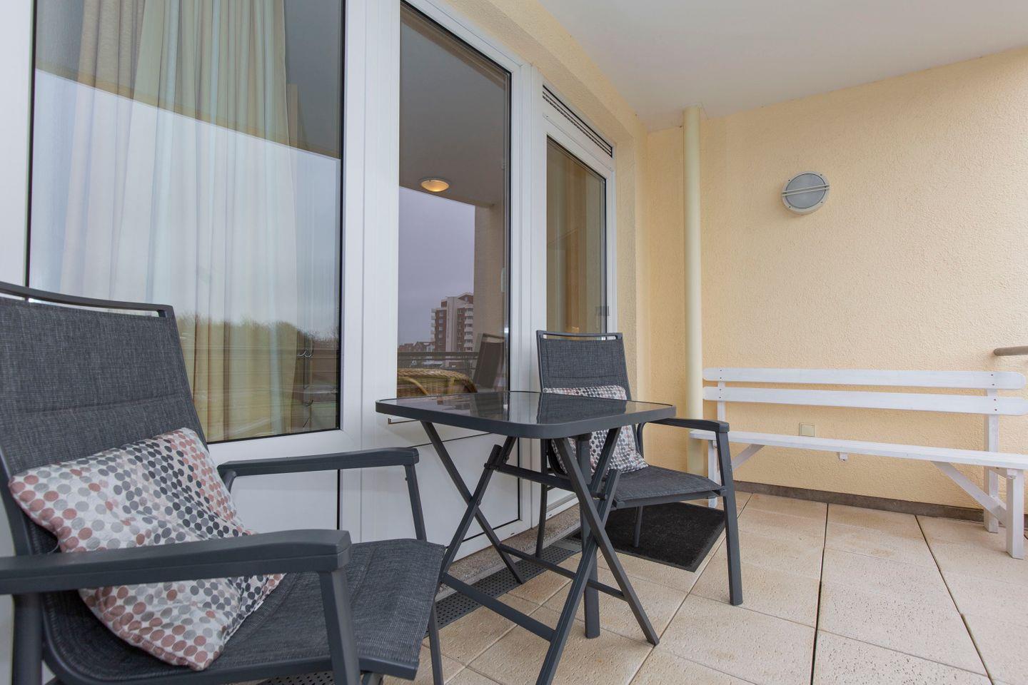 Die möblierte Loggia ist ein schöner Ort, um unter freiem Himmel bei einem leckeren Frühstück perfekt in den Tag zu starten. Die Urlaubsgäste können hier jederzeit die frische Nordseeluft genießen.