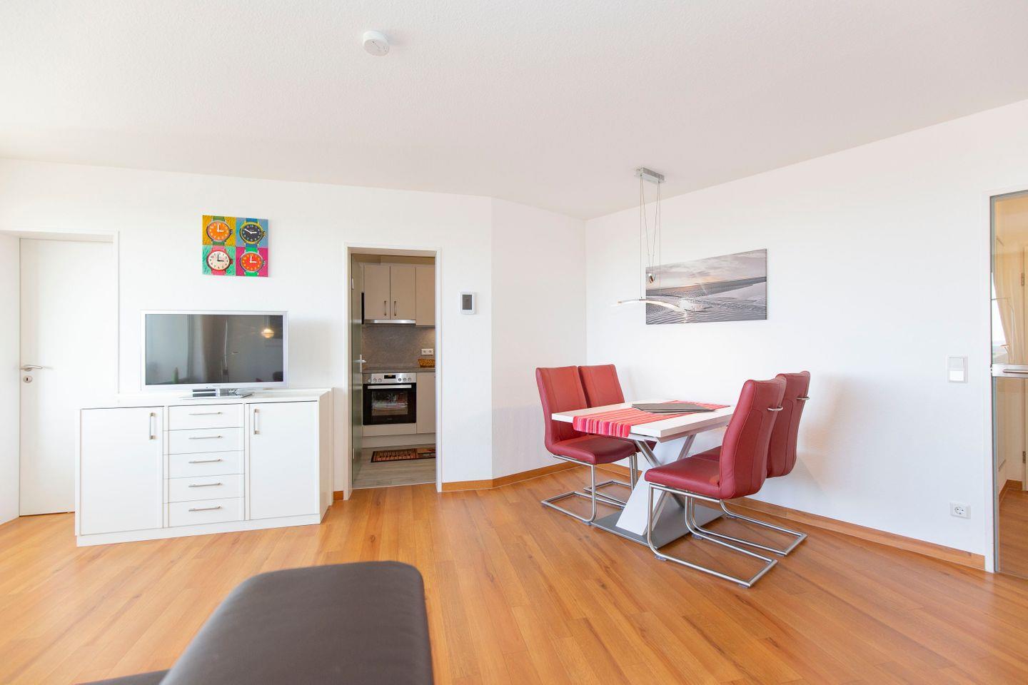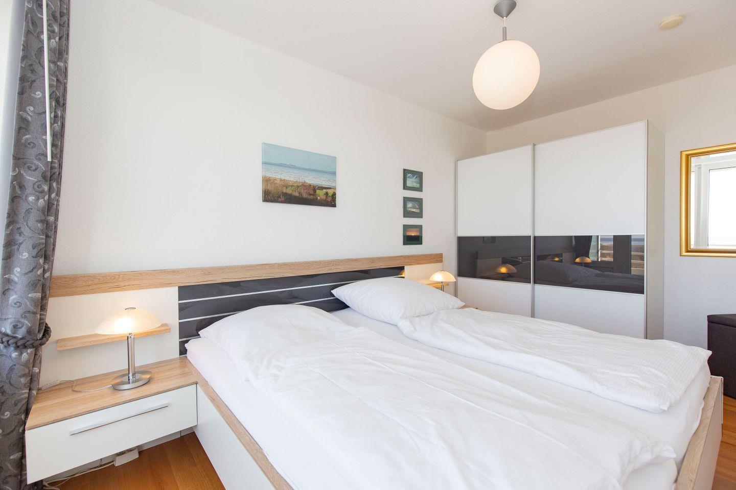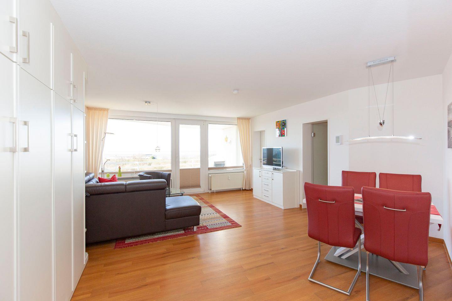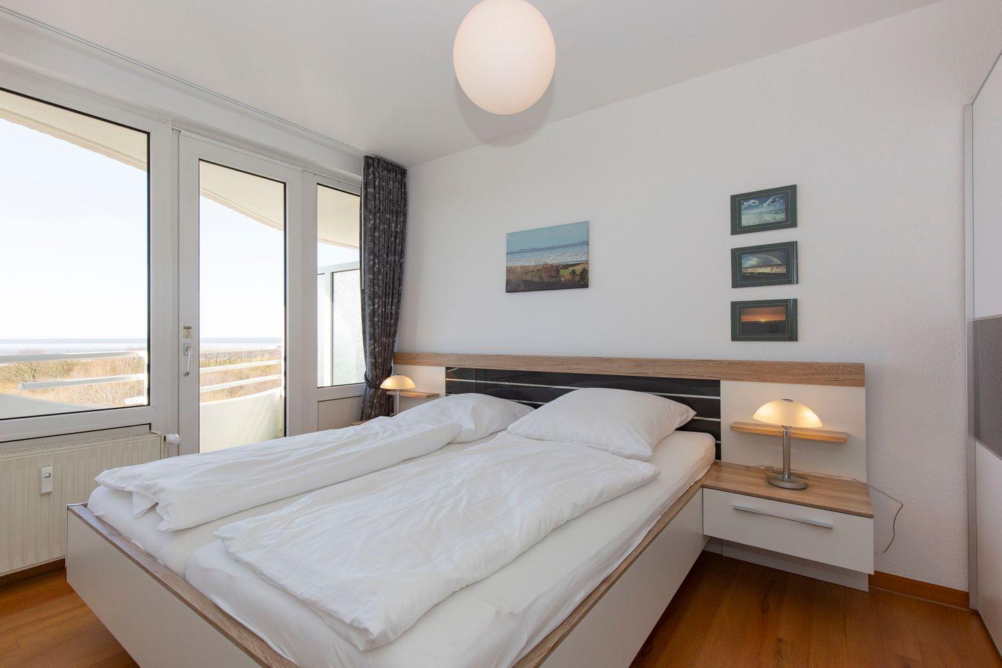 Haus "Lord Nelson", bis 4 Pers.,Typ 6, App. Nr. 503, 5. Etage, ca. 66 qm, Blick Richtung Weltnaturerbe Wattenmeer, Meerblick, Schlafzimmer mit Doppelbett, Wohnbereich mit Schrankbett (einzeln klappbar), Dusche/WC und Bidet, Gäste/WC, separate Küche mit Geschirrspüler und Mikrowelle, Balkon, Telefon, Kabel-TV, Radio-CD-Player mit i-Pod-Docking und USB-Anschluss, kostenl. W-Lan Zugang im App., Haustiere sind nicht erlaubt, Tiefgaragenstellplatz, Strandkorb im Sommer 2026.
