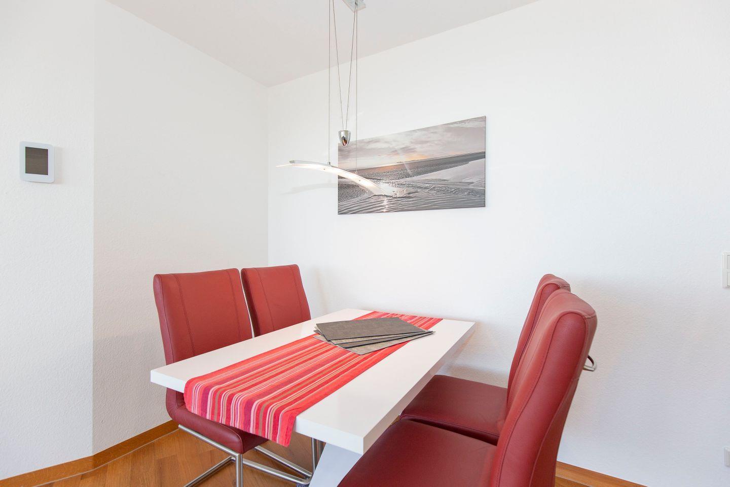 Auf 66 m² bietet die stilvoll eingerichtete 2-Zimmer-Ferienwohnung bis zu vier Urlaubsgästen Platz. Hier erwarten Sie großzügige Räume, eine hochwertige Ausstattung und ein wunderschöner Meerblick. Das Zentrum der FeWo ist der Wohnbereich, in dem Ledermöbel und ein Farbkonzept aus Schwarz, Weiß und Rot ein stilvolles Ambiente kreieren. Ein weiteres Highlight ist die Top-Lage in Cuxhaven-Döse. Der Strand ist nur wenige Gehminuten entfernt. Das Wahrzeichen Cuxhavens, die Kugelbake, können Sie bei einem kurzen Spaziergang besuchen und Sie haben die optimale Ausgangslage für Radtouren entlang der Strandpromenade.