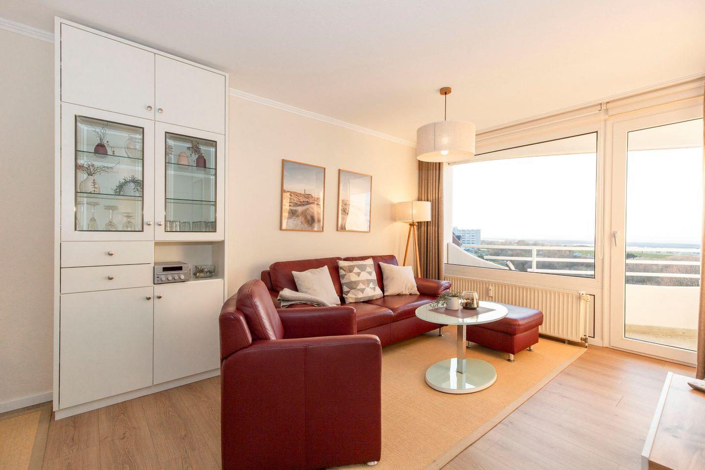 Haus "Lord Nelson", Typ 2, App.-Nr. 606, bis 3 Pers., 6.Etage, ca. 40 qm Wohnungsgröße, Weltnaturerbe Wattenmeer (Meerblick Richtung Neuwerk), Wohnbereich mit Schrankbett (einzeln klappbar), sep. Schlafzimmer mit Einzelbett, Dusche/WC, Küchenzeile mit Mikrowelle und Geschirrspüler, Telefon, Balkon, Kabel-TV, W-Lan über eigenen Router, Garagenstellplatz, Haustiere nicht erlaubt, Nichtraucherwohnung, Strandkorb im Sommer 2026, Tiefgaragenstellplatz.