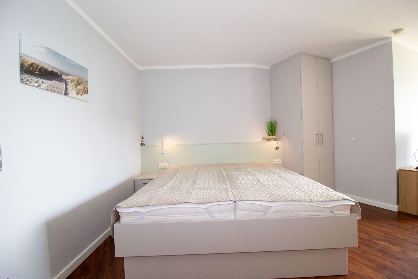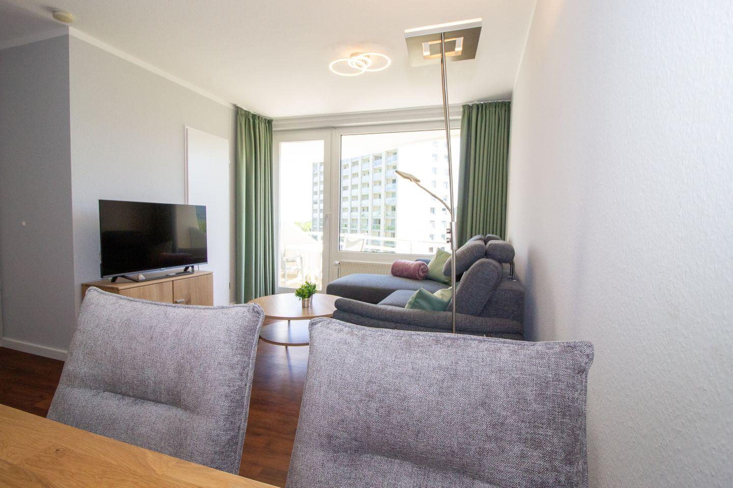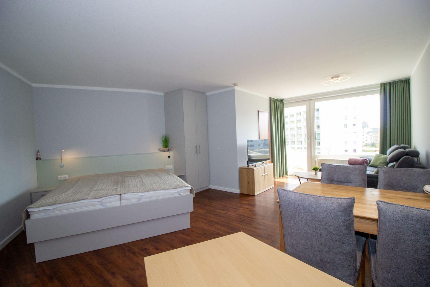 Haus "Lord Nelson", Typ 2, App.-Nr. 417, bis 2 Personen, ca. 40 qm Größe, Weltschifffahrtsweg, seitlicher Meerblick Richtung Elbe, Wohnbereich mit feststehendem Bett, separates Zimmer aktuell unmöbliert, Dusche/WC, Küchenzeile mit Geschirrspüler, Mikrowelle, 4-Platten-Ceranfeld, Laminat, Balkon, Kabel-TV, Nichtraucherwohnung, Strandkorb im Sommer 2026, Tiefgaragenstellplatz.