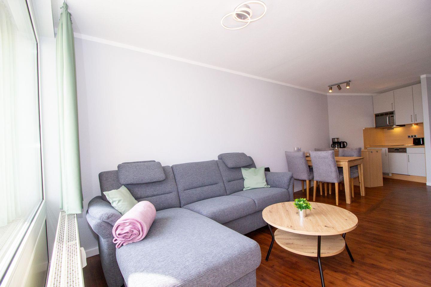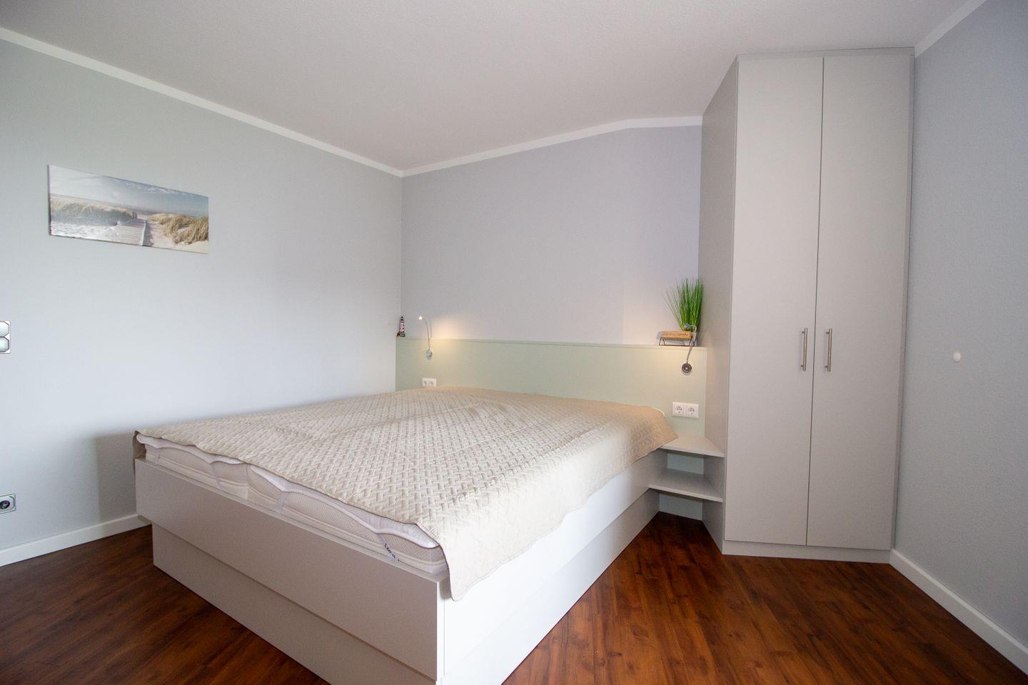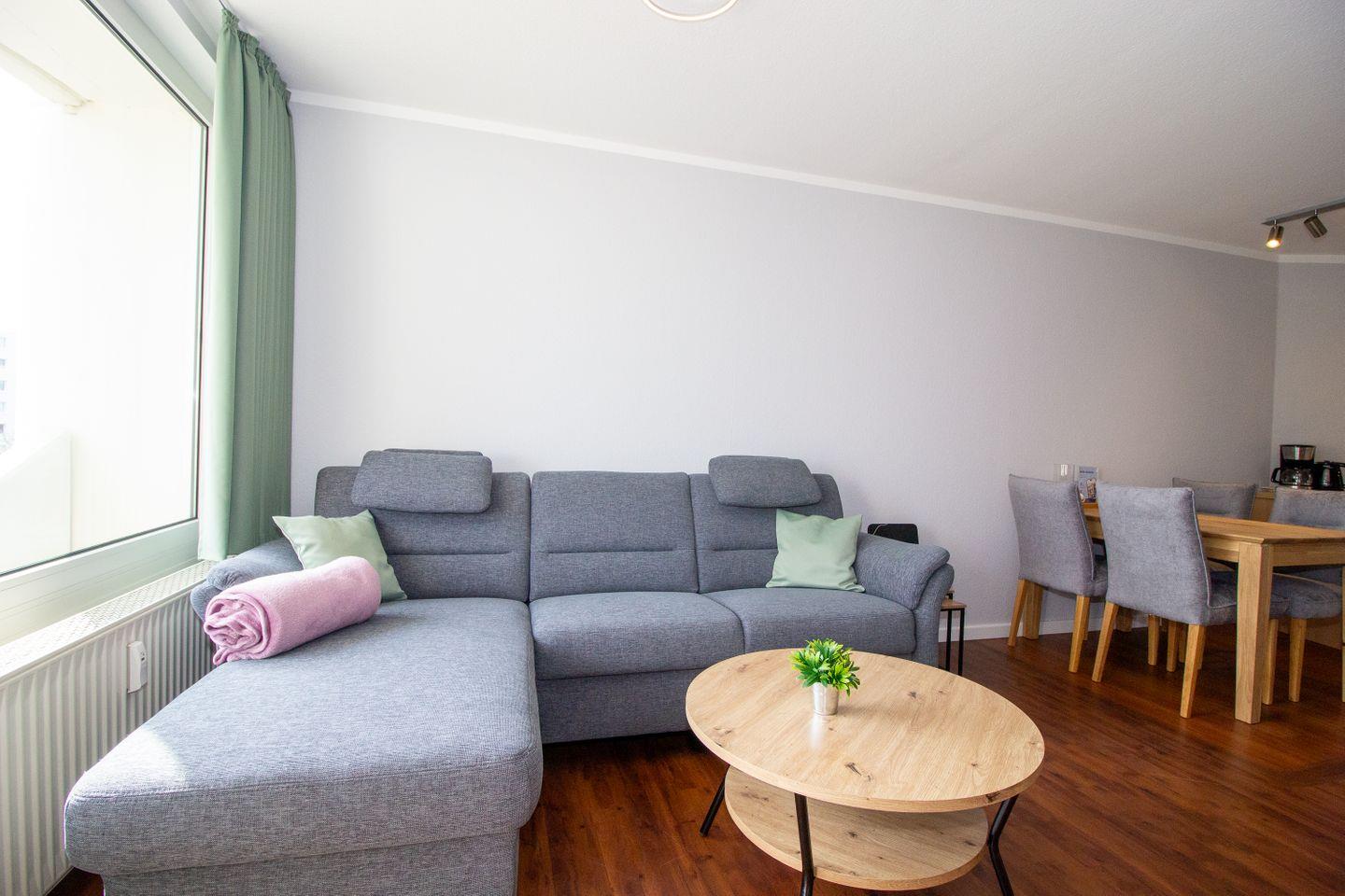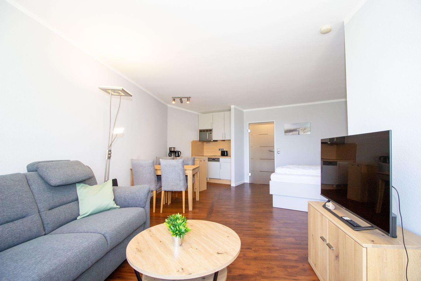 Haus "Lord Nelson", Typ 2, App.-Nr. 417, bis 2 Personen, ca. 40 qm Größe, Weltschifffahrtsweg, seitlicher Meerblick Richtung Elbe, Wohnbereich mit feststehendem Bett, separates Zimmer aktuell unmöbliert, Dusche/WC, Küchenzeile mit Geschirrspüler, Mikrowelle, 4-Platten-Ceranfeld, Laminat, Balkon, Kabel-TV, Nichtraucherwohnung, Strandkorb im Sommer 2026, Tiefgaragenstellplatz.