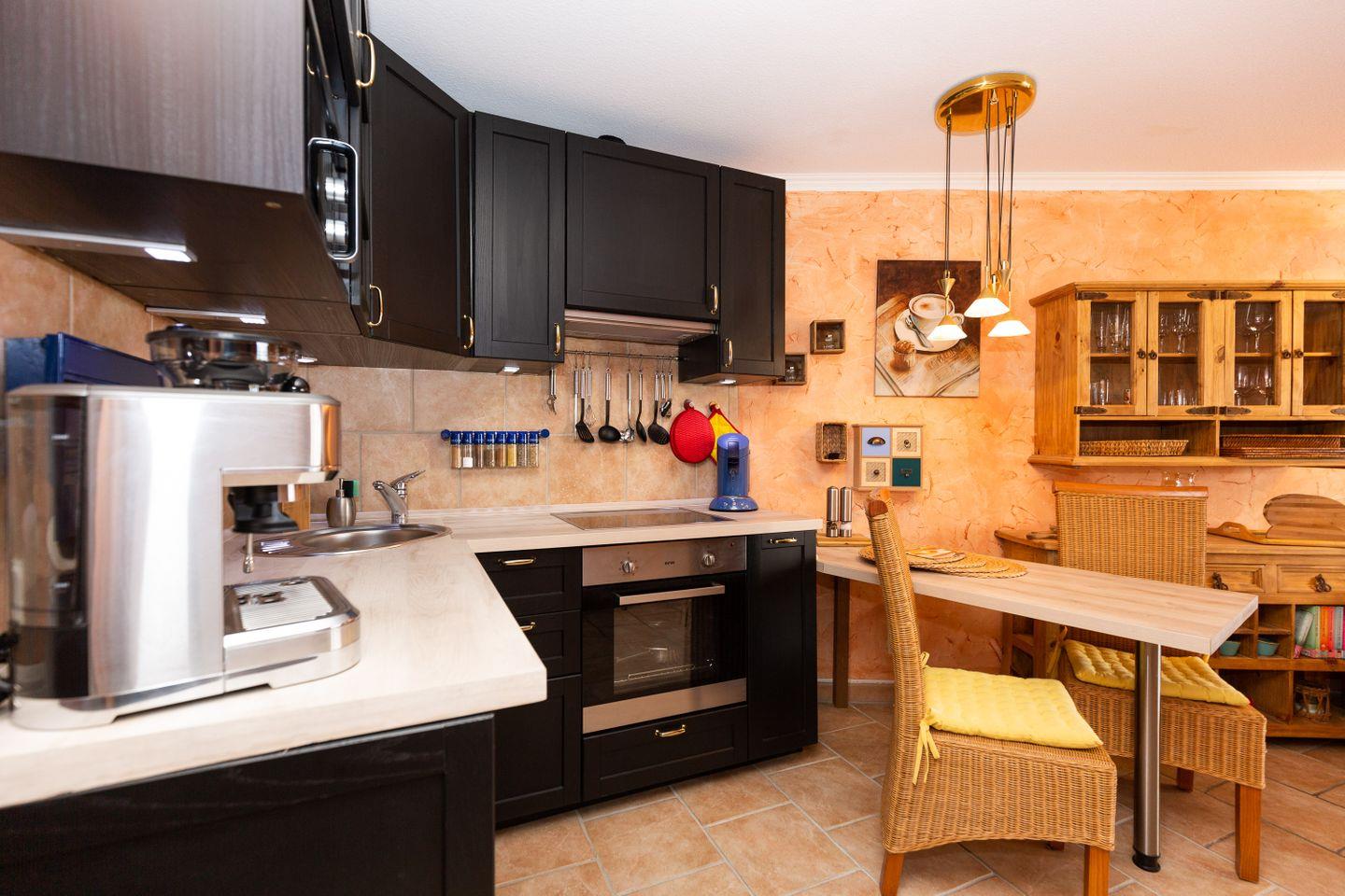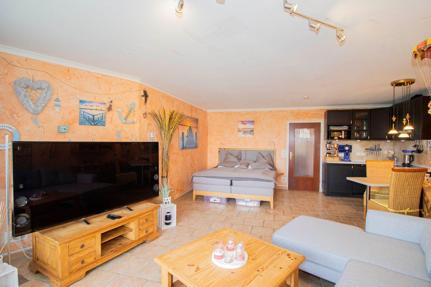 Die Ferienwohnung für 2 Personen (hundefreundlich) bietet helle warme Farben: Hier herrscht ein mediterraner Mix aus terrakottafarbenden Bodenfließen, einer lachsfarbenden Wandgestaltung und einer hellgrauen gemütlichen Couch. Hier fühlen Sie sich ein wenig wie am Mittelmeer, obwohl Sie sich in Cuxhaven befinden.