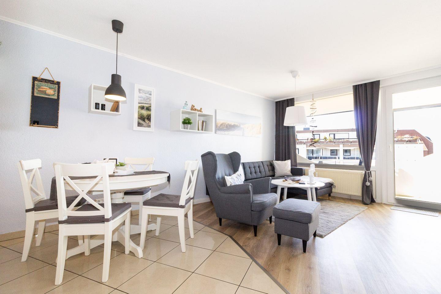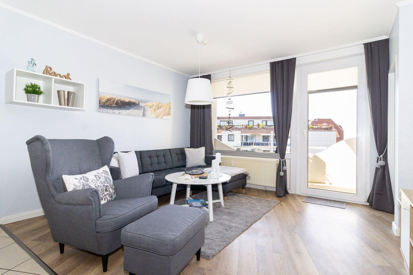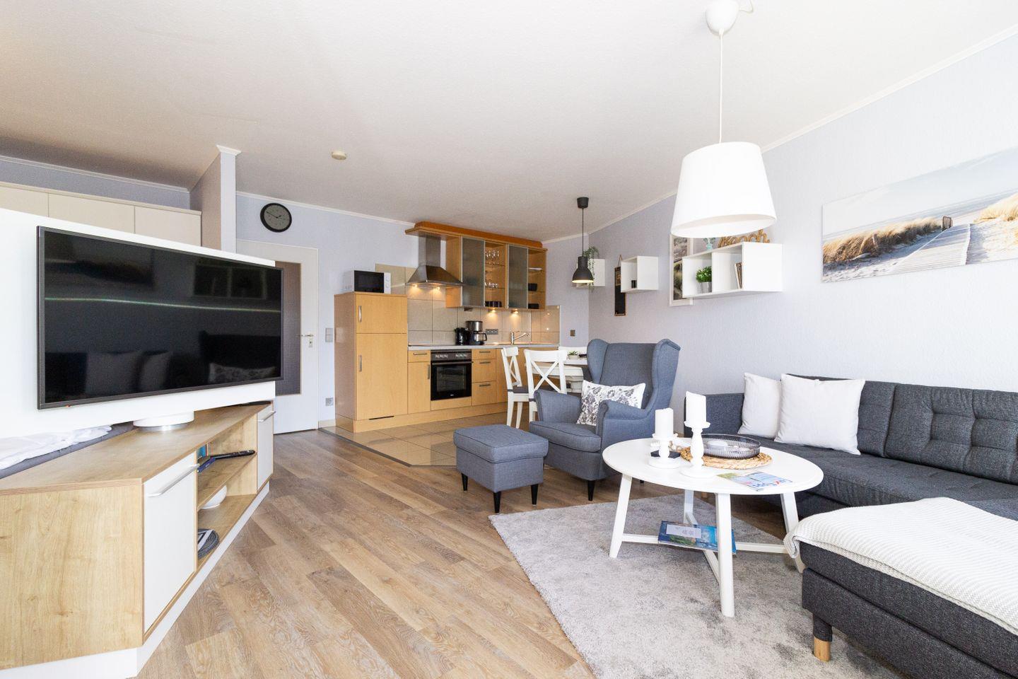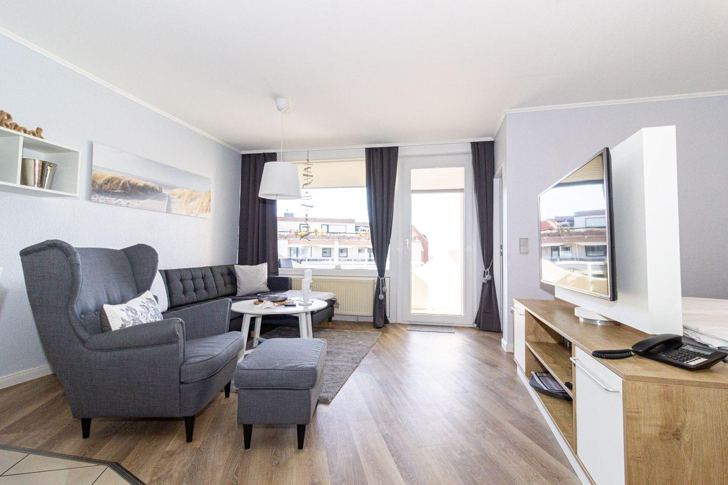 Haus "Trafalgar", Typ C, App.-Nr. "326", bis 4 Personen, 3. Etage, ca. 55 qm, Westseite (Meerblick), Wohn/Schlafraum mit Doppelbett (durchgehende Matratze), separates Schlafzimmer mit zwei Einzelbetten, Küchenzeile mit Ceranfeld, Backofen, Geschirrspüler und Mikrowelle, Dusche/WC, Nichtraucherwohnung ,Balkon, Telefon, WLAN im App., Flatscreen-TV (Kabel), Nichtraucherwohnung, Tiefgaragenstellplatz, keine Haustiere erlaubt, Strandkorb im Sommer 2026