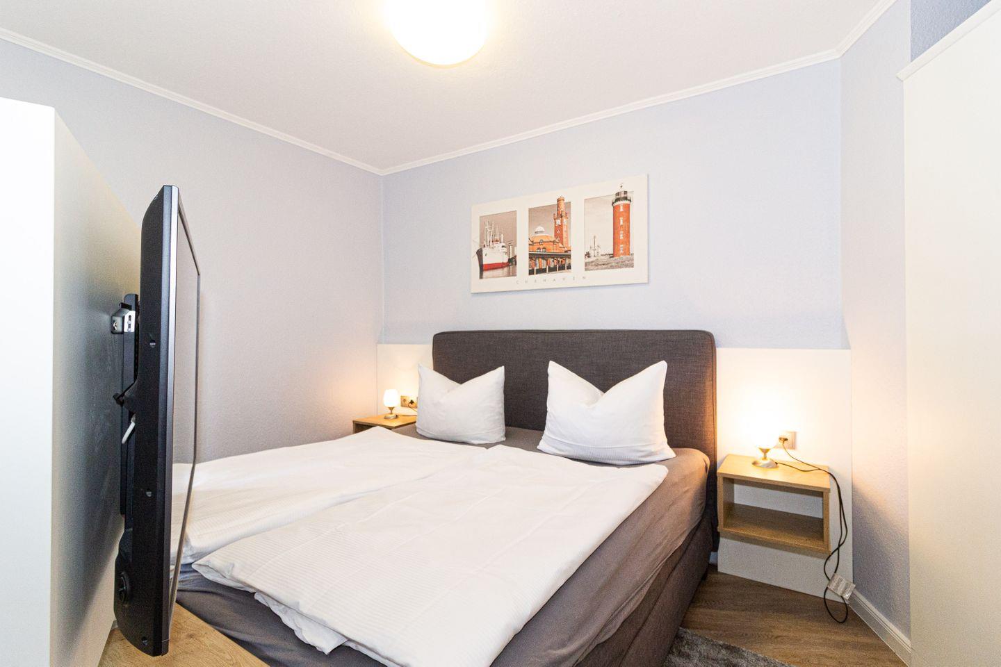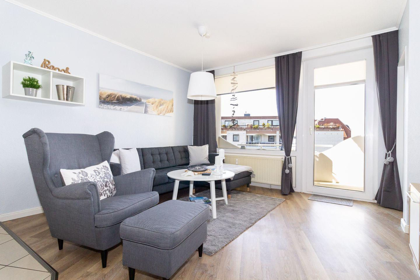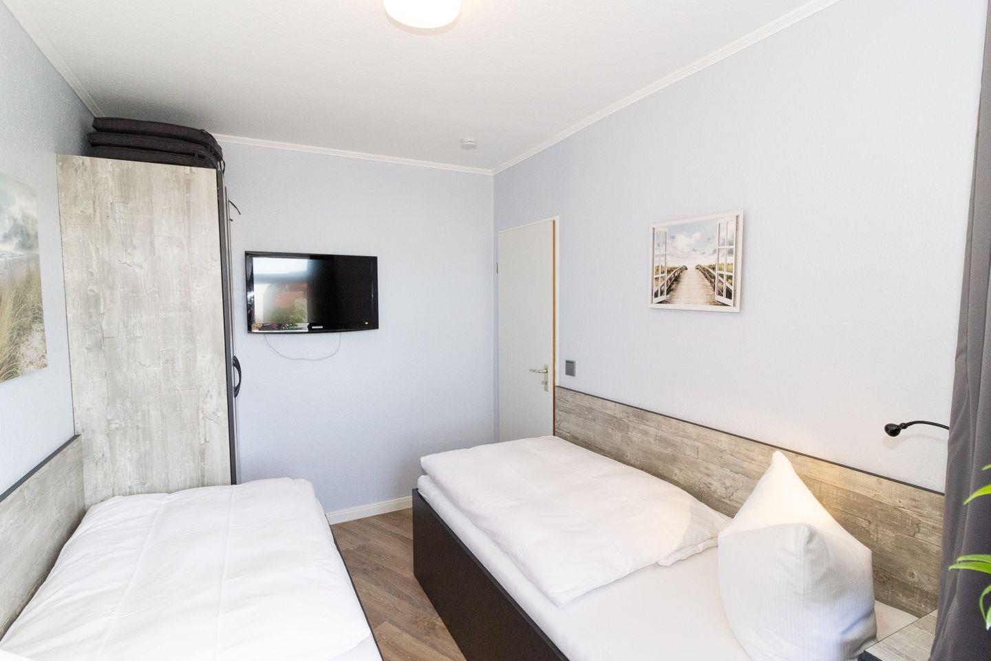 Haus "Trafalgar", Typ C, App.-Nr. "326", bis 4 Personen, 3. Etage, ca. 55 qm, Westseite (Meerblick), Wohn/Schlafraum mit Doppelbett (durchgehende Matratze), separates Schlafzimmer mit zwei Einzelbetten, Küchenzeile mit Ceranfeld, Backofen, Geschirrspüler und Mikrowelle, Dusche/WC, Nichtraucherwohnung ,Balkon, Telefon, WLAN im App., Flatscreen-TV (Kabel), Nichtraucherwohnung, Tiefgaragenstellplatz, keine Haustiere erlaubt, Strandkorb im Sommer 2026