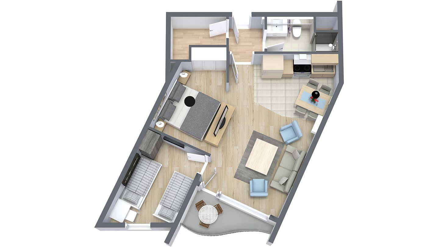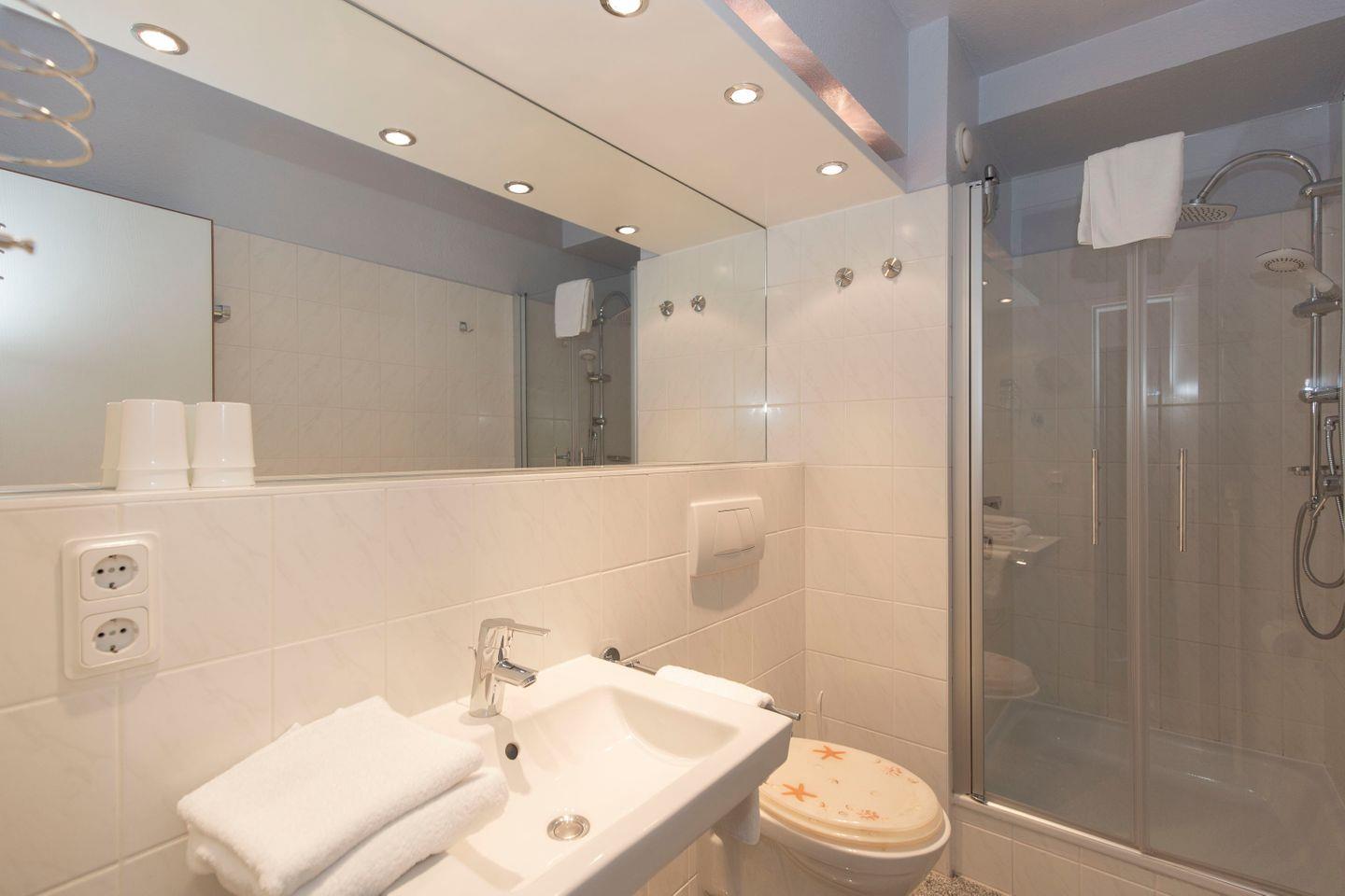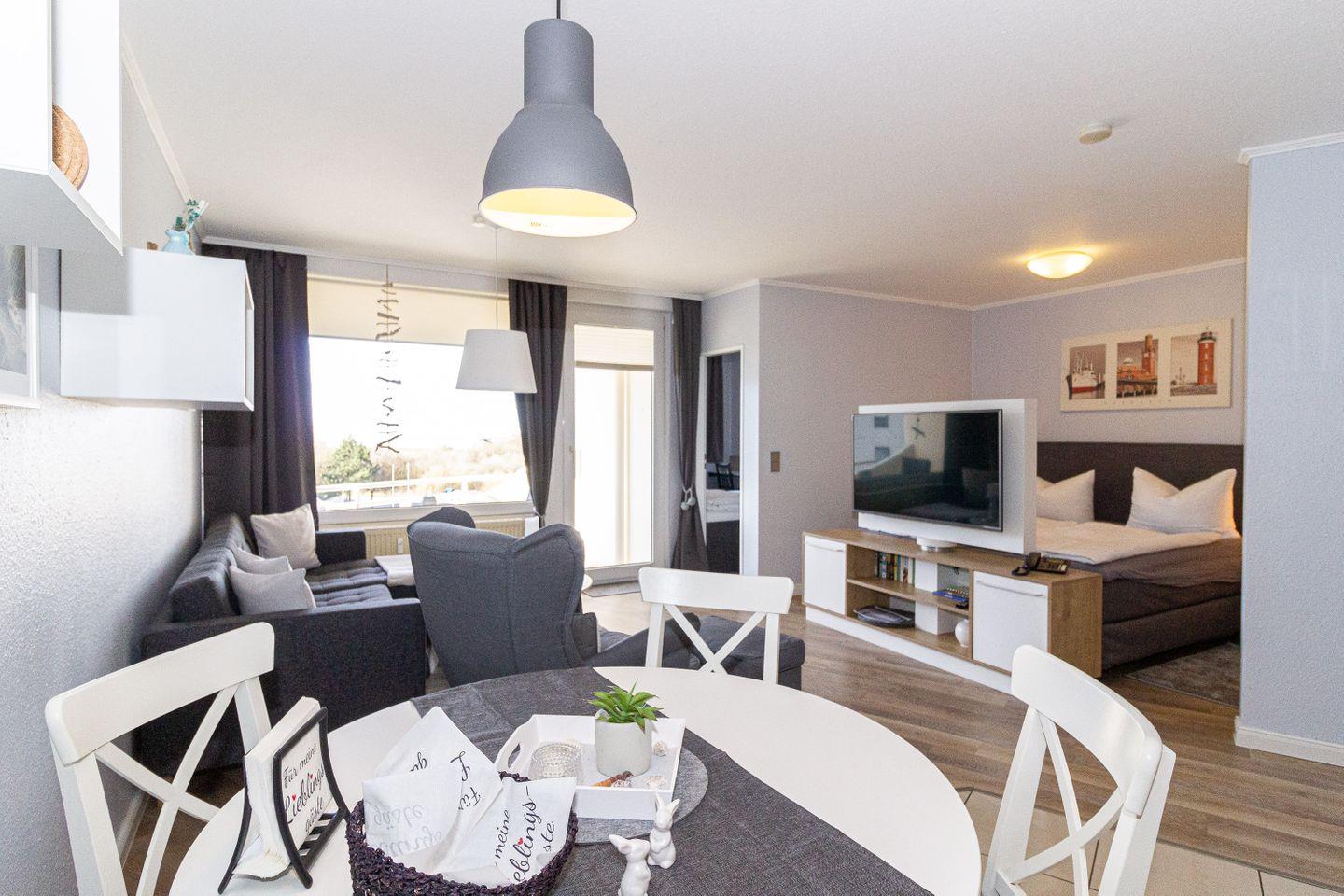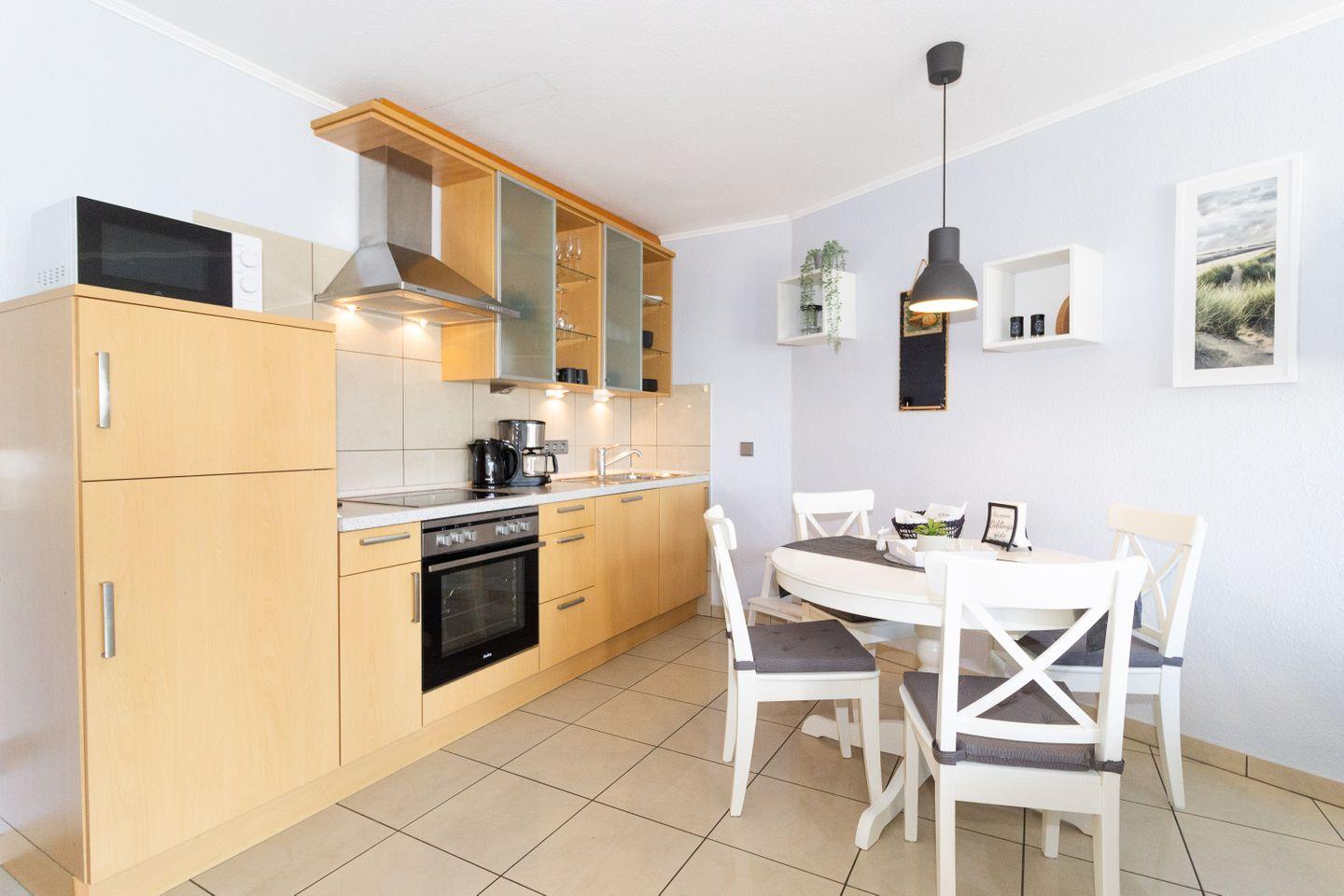 Haus "Trafalgar", Typ C, App.-Nr. "326", bis 4 Personen, 3. Etage, ca. 55 qm, Westseite (Meerblick), Wohn/Schlafraum mit Doppelbett (durchgehende Matratze), separates Schlafzimmer mit zwei Einzelbetten, Küchenzeile mit Ceranfeld, Backofen, Geschirrspüler und Mikrowelle, Dusche/WC, Nichtraucherwohnung ,Balkon, Telefon, WLAN im App., Flatscreen-TV (Kabel), Nichtraucherwohnung, Tiefgaragenstellplatz, keine Haustiere erlaubt, Strandkorb im Sommer 2026