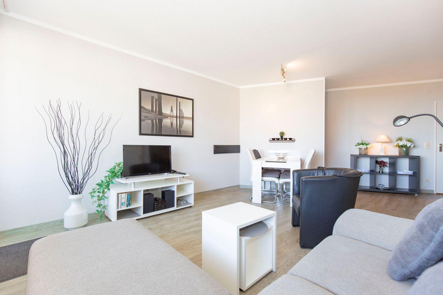 Die 2-Zimmer-Ferienwohnung punktet mit moderner, stilvoller Einrichtung und einem stimmigen Farbkonzept in Schwarz- Weiß- und Grautönen. Das zu Hause auf Zeit garantiert Wohlfühlatmosphäre und bietet auf 55 m² Platz für bis zu 4 Urlaubsgäste - optimal für Familien oder Paare. Ein Highlight ist neben dem Balkon mit Meerblick die kostenlose Nutzung des Wellnessbereichs im Haus Trafalgar.