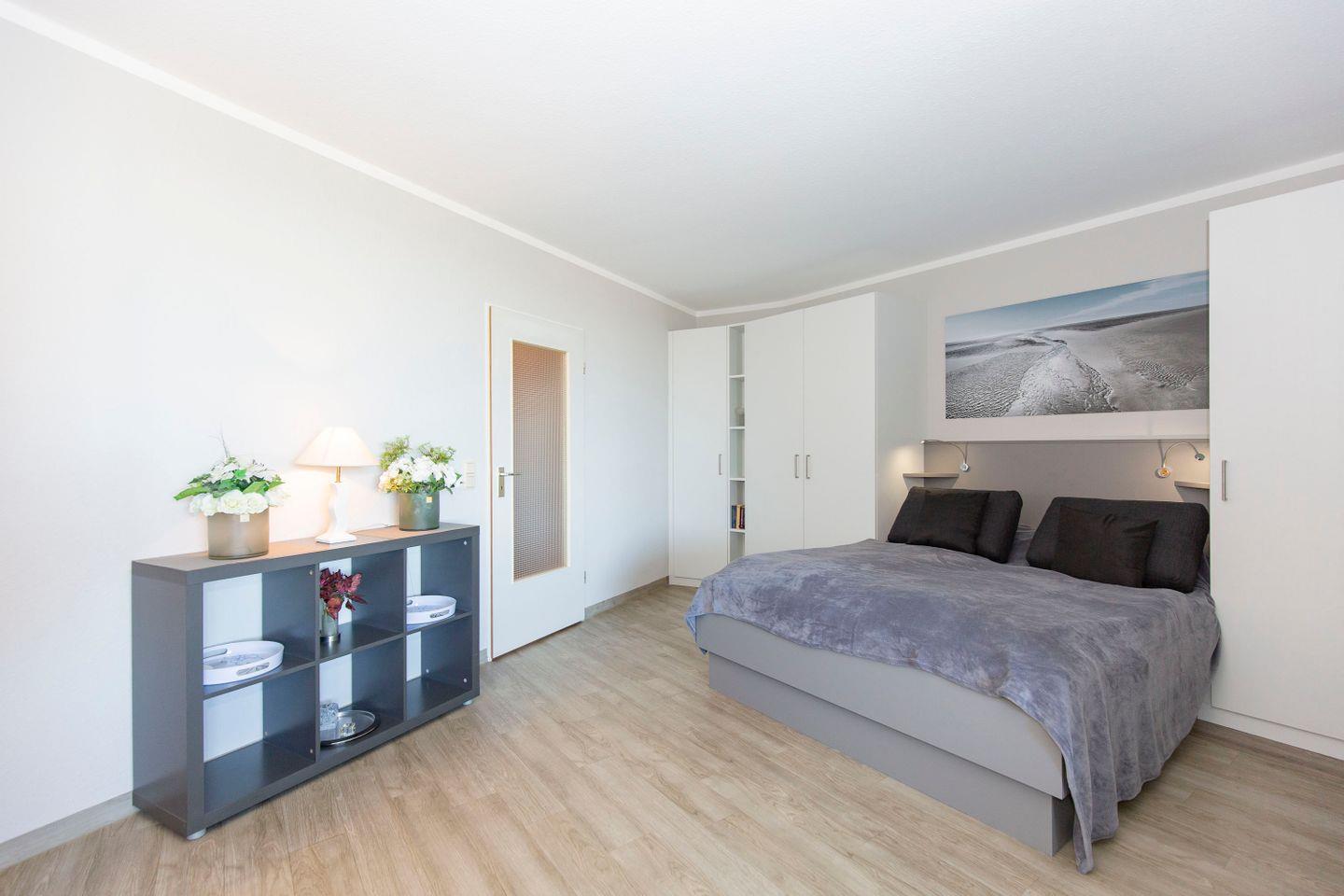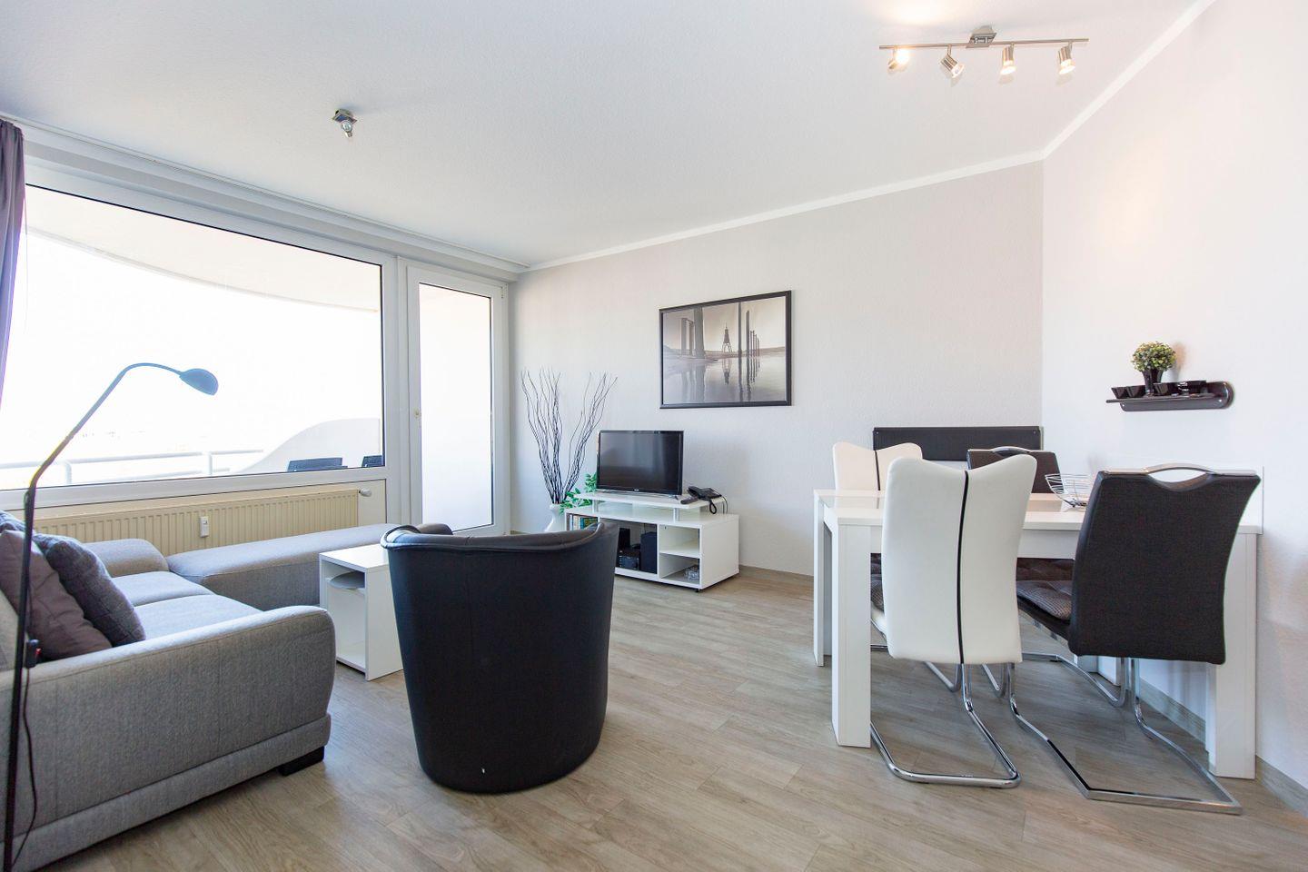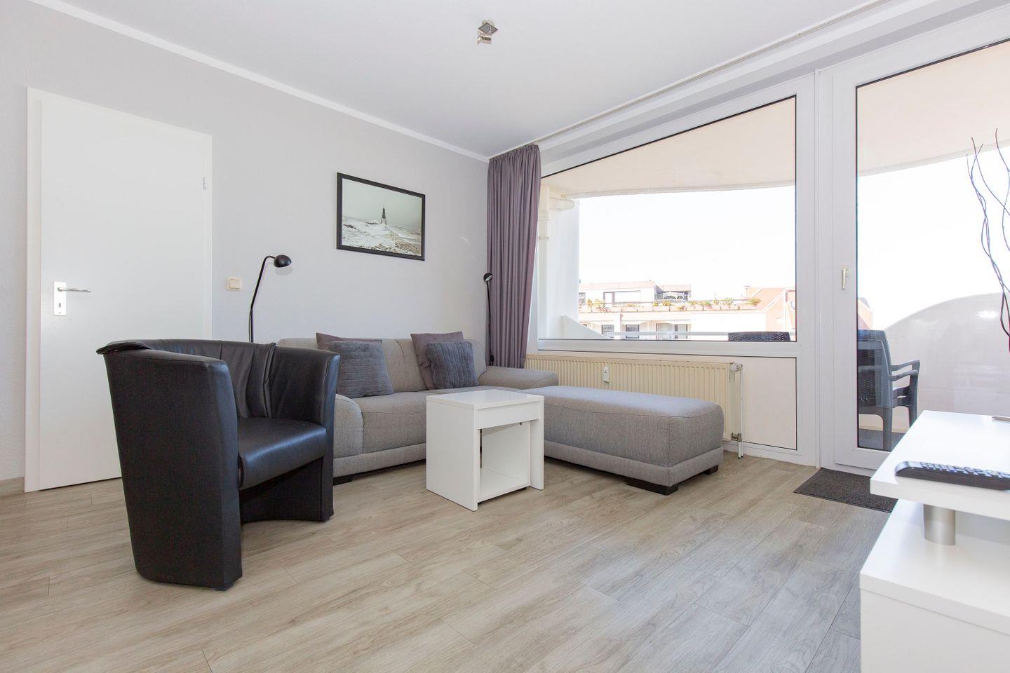 Haus "Trafalgar", Typ C, Appartement-Nr. 325, bis 4 Personen, 3.Etage, ca. 55 qm, Westseite (Meerblick), Wohn/Schlafraum mit Doppelbett, separates Schlafzimmer mit 2 Einzelbetten, Küchenzeile mit Mikrowelle, 4-Platten-Ceranfeld, Geschirrspüler, Dusche/WC, Balkon, Kabel-TV, WLAN im App., Tiefgaragenstellplatz, Nichtraucherappartement, keine Haustiere erlaubt, Strandkorb im Sommer 2026.