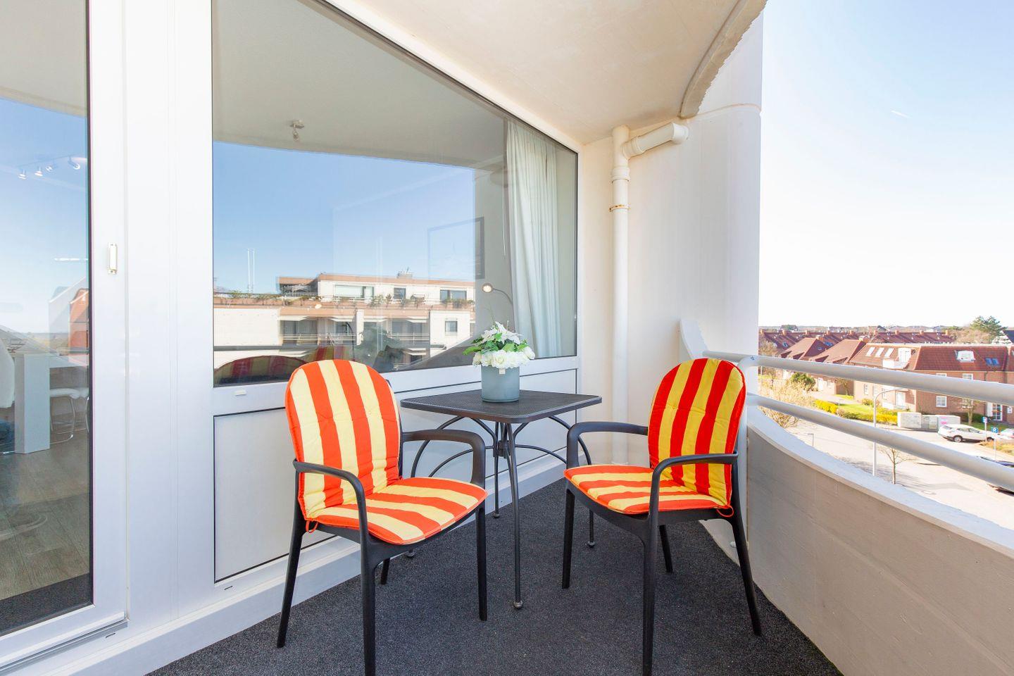 Auf dem Balkon finden Sie vier schwarze Stühle und einen Tisch. Mit Blick auf das Wattenmeer ist der Balkon der perfekte Ort unter freiem Himmel, um den Nordsee Urlaub zu genießen.