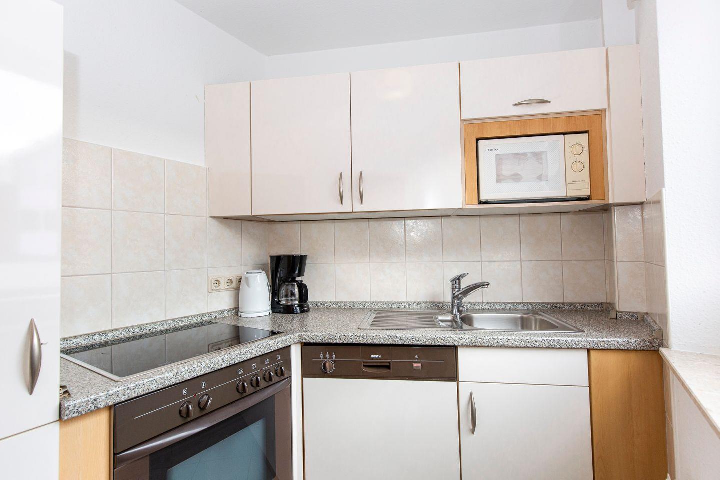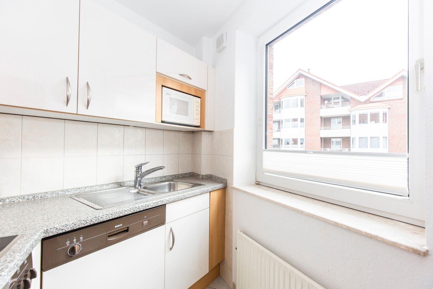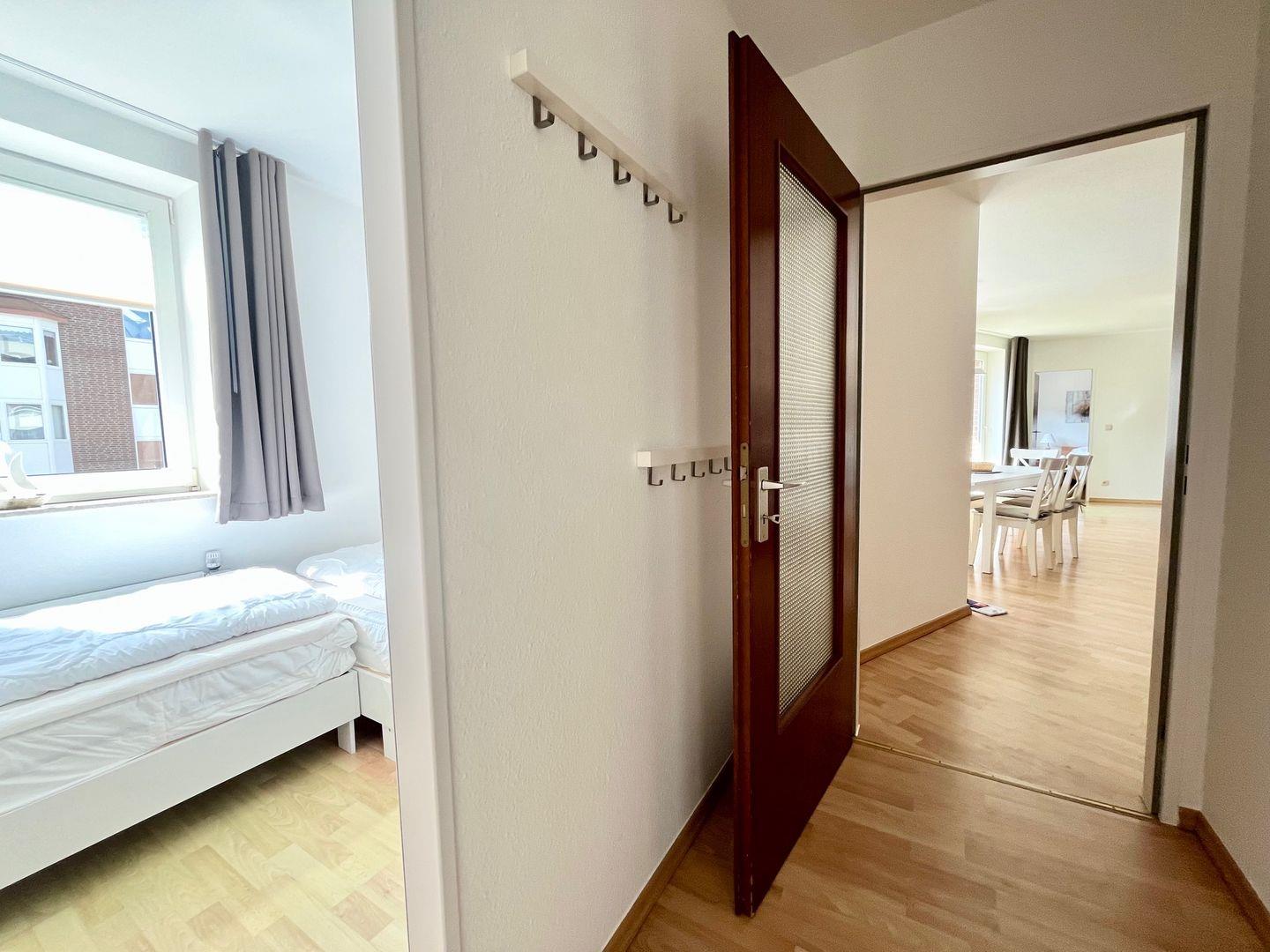 Haus "Lord Nelson", Typ 6, Appartement-Nr. "110", bis 6 Personen, 1. Etage, ca. 66 qm Größe, Südseite (ohne Meerblick/Richtung Trafalgar), Schlafzimmer mit Doppelbett, 2. Schlafzimmer mit zwei Einzelbetten, Wohnbereich mit Schrankbett (einzeln klappbar), Dusche/WC, sep. Küche mit Backofen, Geschirrspüler und Mikrowelle, Nichtraucher App. ,Balkon (Südseite), Flachbildschirm, kostenl. W-Lan Zugang im App., Haustiere sind auf Anfrage gestattet, Außenstellplatz, Strandkorb im Sommer 2026.