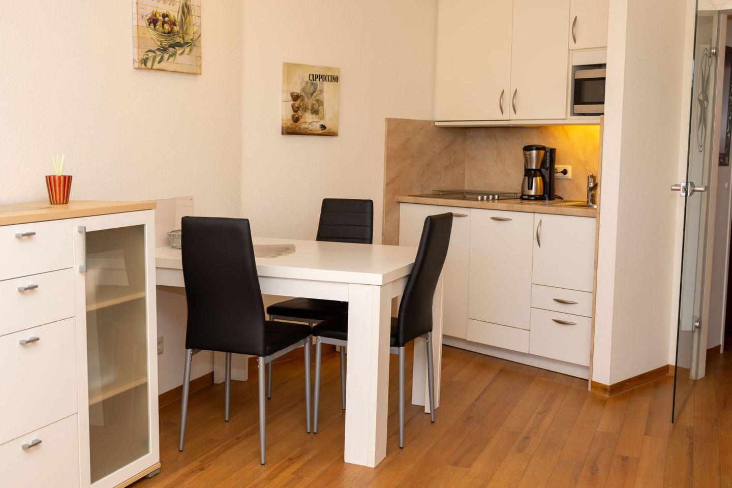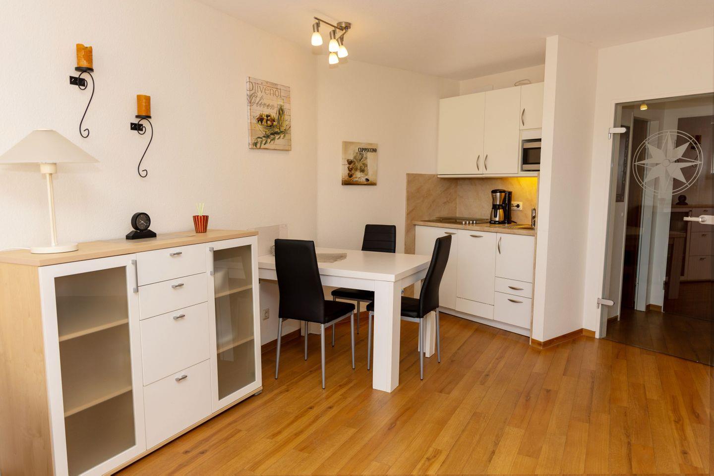 Haus "Lord Nelson", Typ 2, App-Nr. "115", bis 3 Personen, 1. Etage, Ostseite (ohne Meerblick/Richtung Elbe), Wohnbereich mit Schrankbett, separates kleines Kinderzimmer mit Einzelbett, Dusche/WC, Küchenzeile mit Mikrowelle/Grillfunktion, Geschirrspüler, Senseo-Padmaschine, Minibackofen und Ceranfeld, ca. 40 qm Wohnungsgröße, Nichtraucher App., Balkon, Telefon, Kabel-TV, kostenl. W-Lan Zugang im App., Haustiere sind auf Anfrage gestattet, Tiefgaragenstellplatz, Strandkorb im Sommer 2026