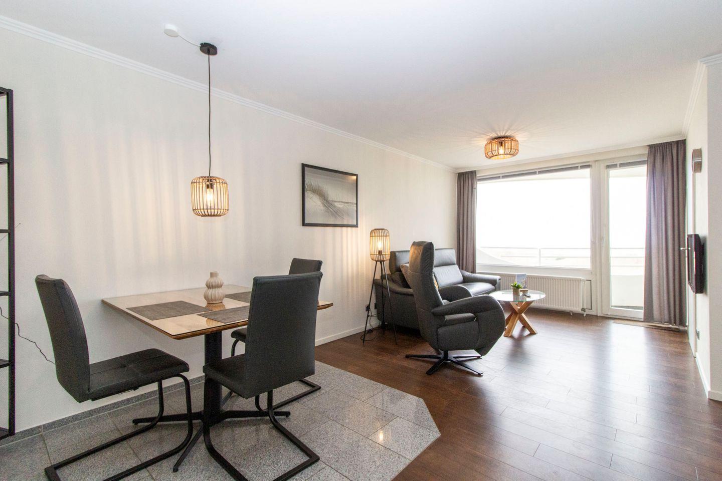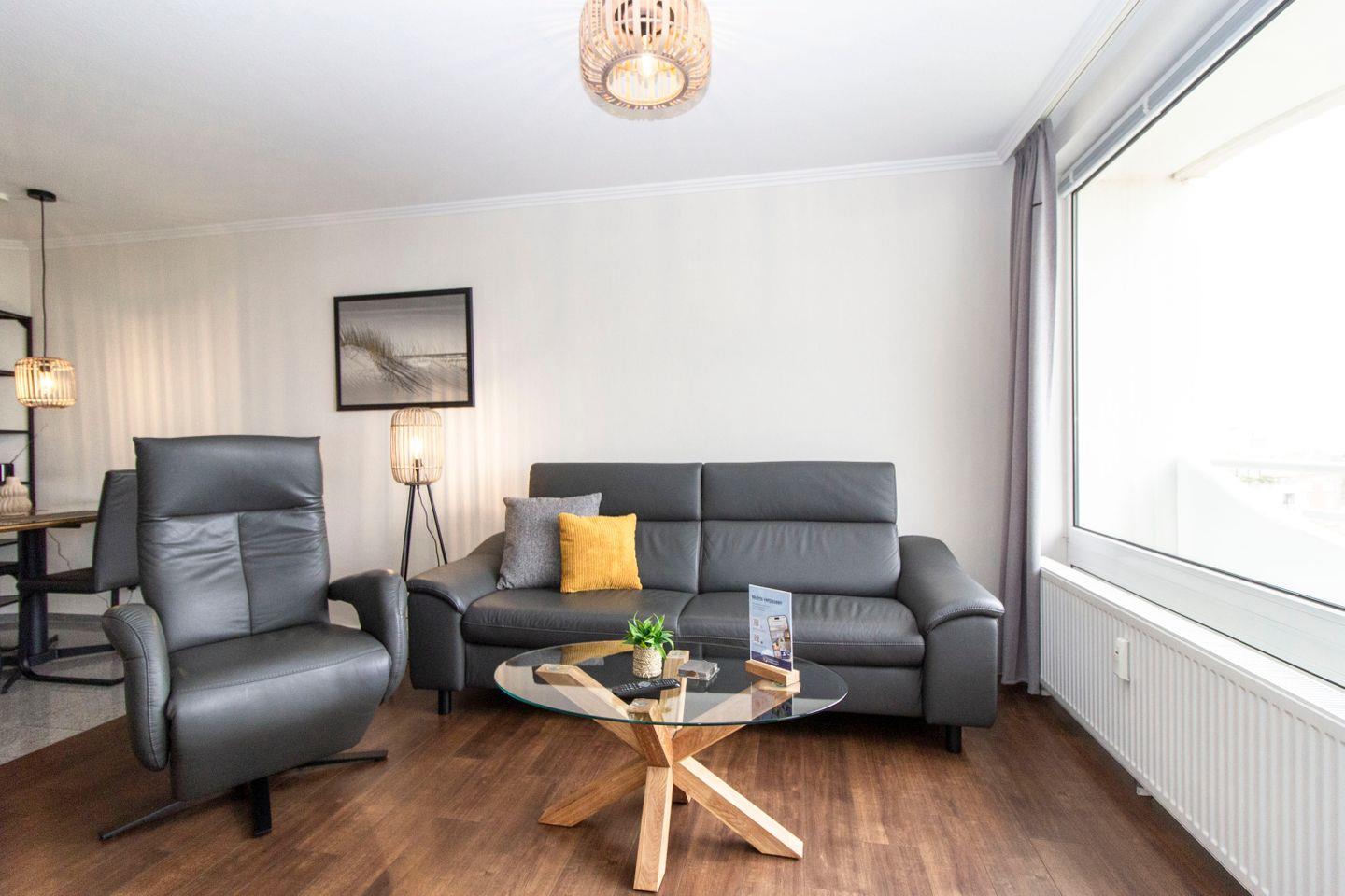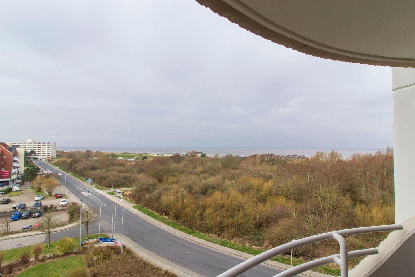 Haus "Lord Nelson", Typ 2, App.-Nr. 604, bis 3 Pers., 6.Etage, ca. 40 qm Wohnungsgröße, Weltnaturerbe Wattenmeer (Meerblick Richtung Neuwerk), Wohnbereich mit Schrankbett, separates Schlafzimmer mit Einzelbett und 2. Fernseher, Dusche/WC, Küchenzeile mit Geschirrspüler und Mikrowelle, Balkon, Kabel-TV, Außenstellplatz, Haustiere nicht erlaubt, WLAN im App, Nichtraucherwohnung, Strandkorb im Sommer 2026.