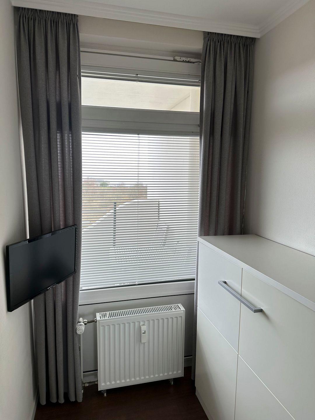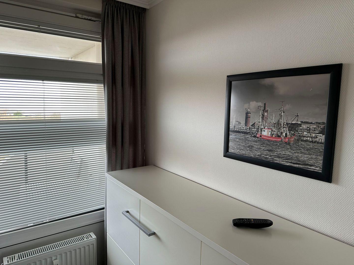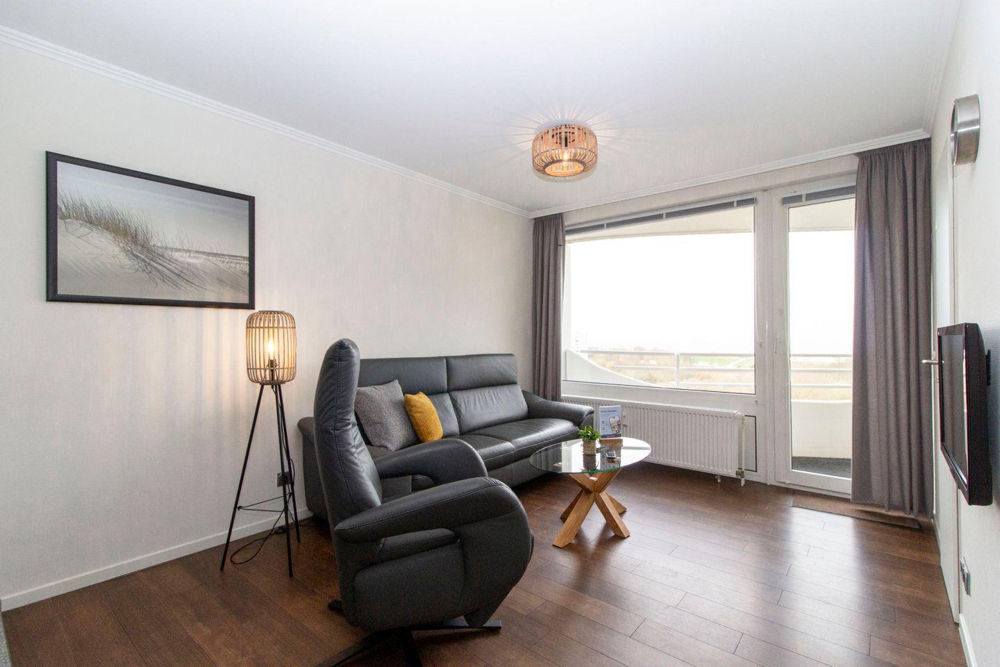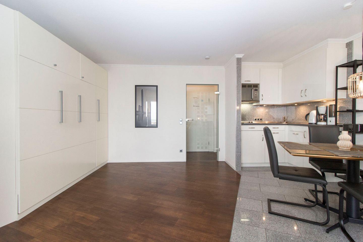 Haus "Lord Nelson", Typ 2, App.-Nr. 604, bis 3 Pers., 6.Etage, ca. 40 qm Wohnungsgröße, Weltnaturerbe Wattenmeer (Meerblick Richtung Neuwerk), Wohnbereich mit Schrankbett, separates Schlafzimmer mit Einzelbett und 2. Fernseher, Dusche/WC, Küchenzeile mit Geschirrspüler und Mikrowelle, Balkon, Kabel-TV, Außenstellplatz, Haustiere nicht erlaubt, WLAN im App, Nichtraucherwohnung, Strandkorb im Sommer 2026.