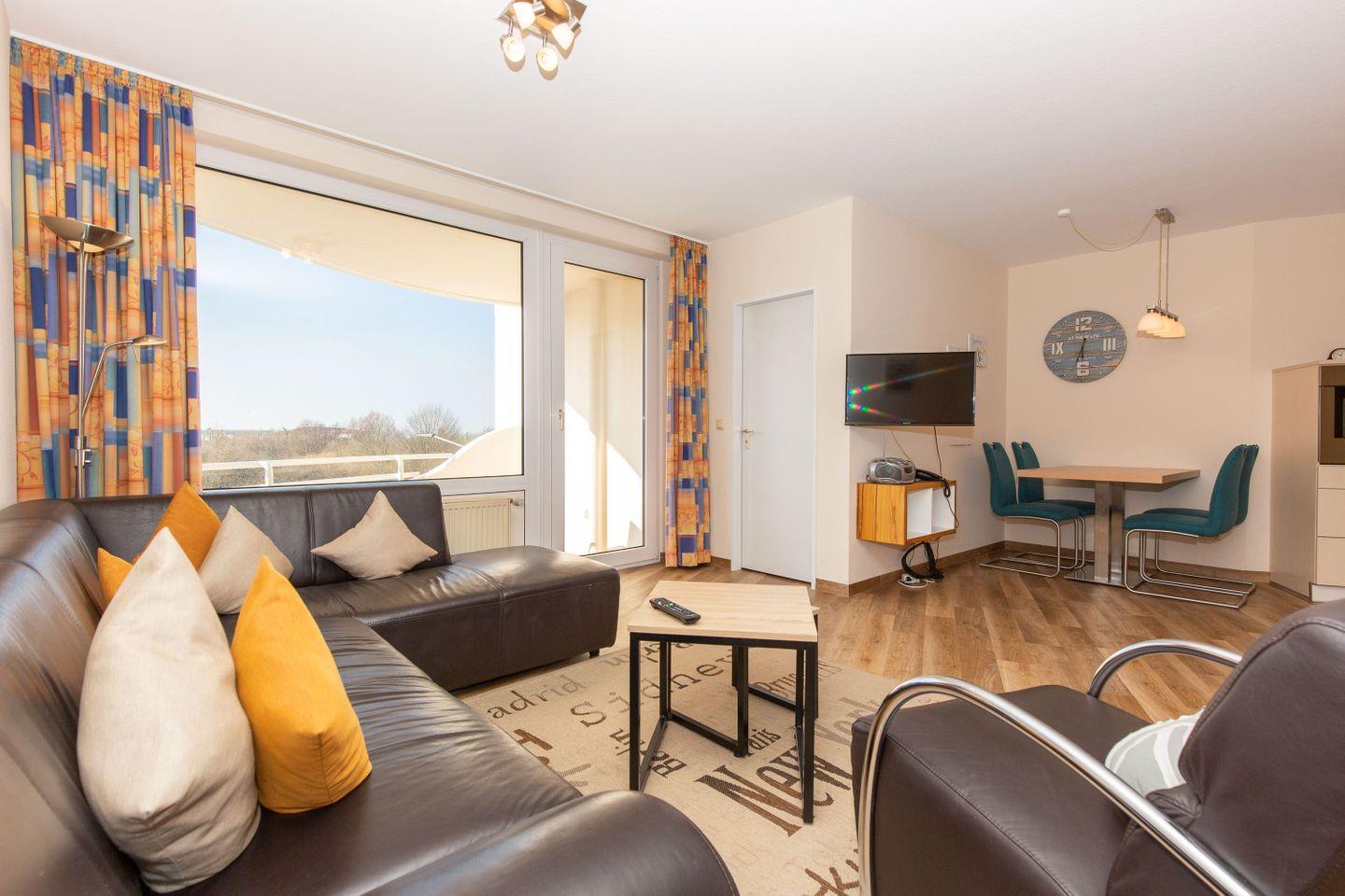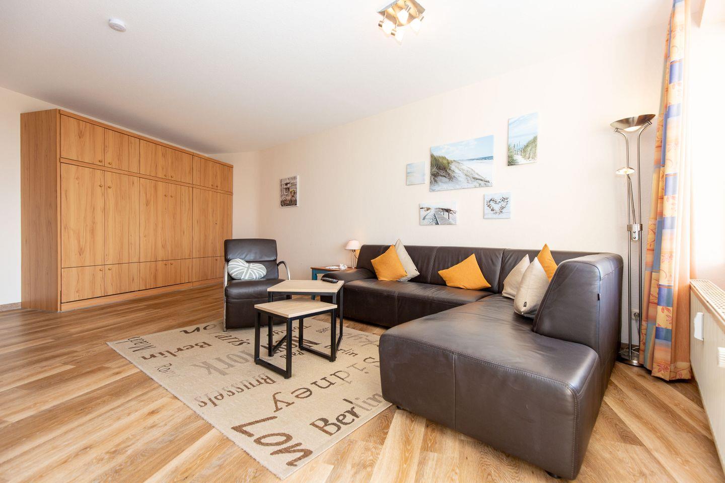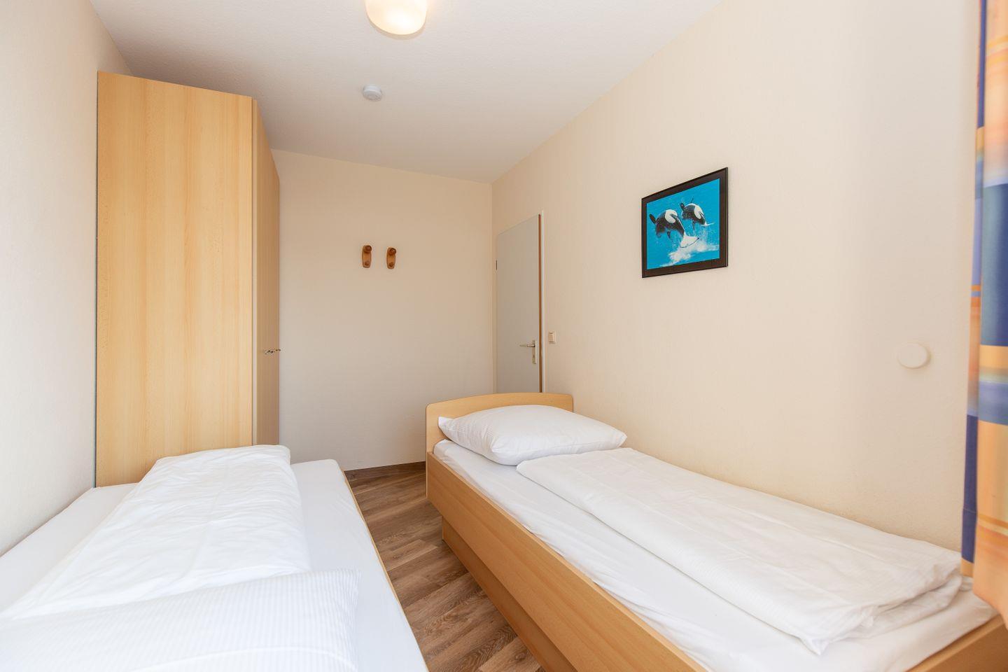 Haus "Trafalgar", TypC, App.-Nr. 222 bis 4 Pers., 2.Etage, ca. 55qm, Westseite, Wohn/Schlafbereich mit Schrankbett, Schlafzimmer mit zwei zusammenstehenden Einzelbetten, Küchenzeile mit Backofen, Geschirrspüler und Mikrowelle, Dusche/WC, Balkon, Kabel-TV, W-Lan Zugang im App, Telefon, Tiefgaragenstellplatz, Strandkorb im Sommer 2026