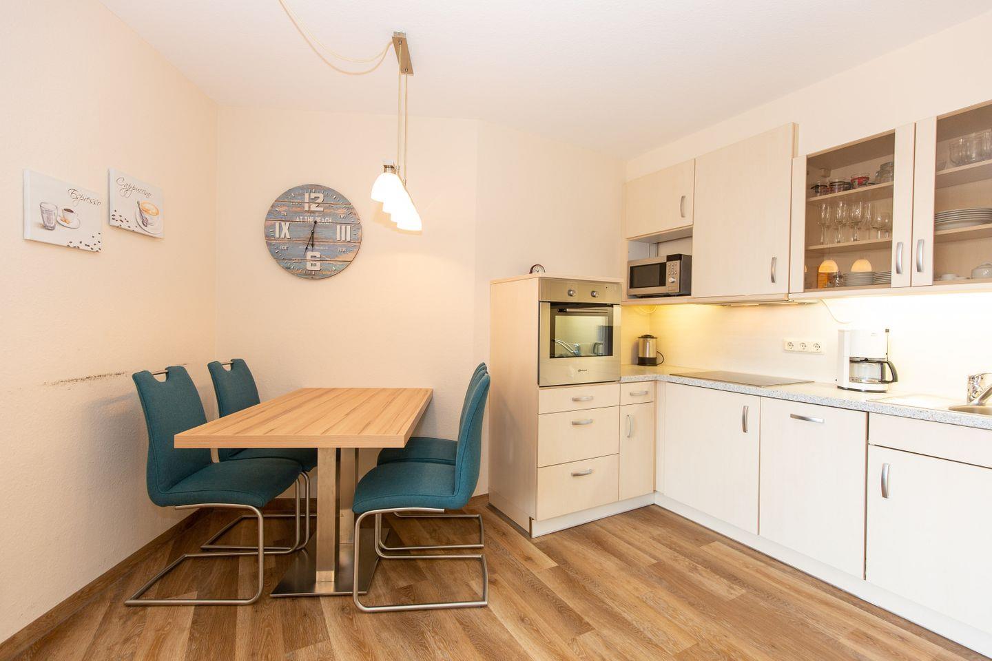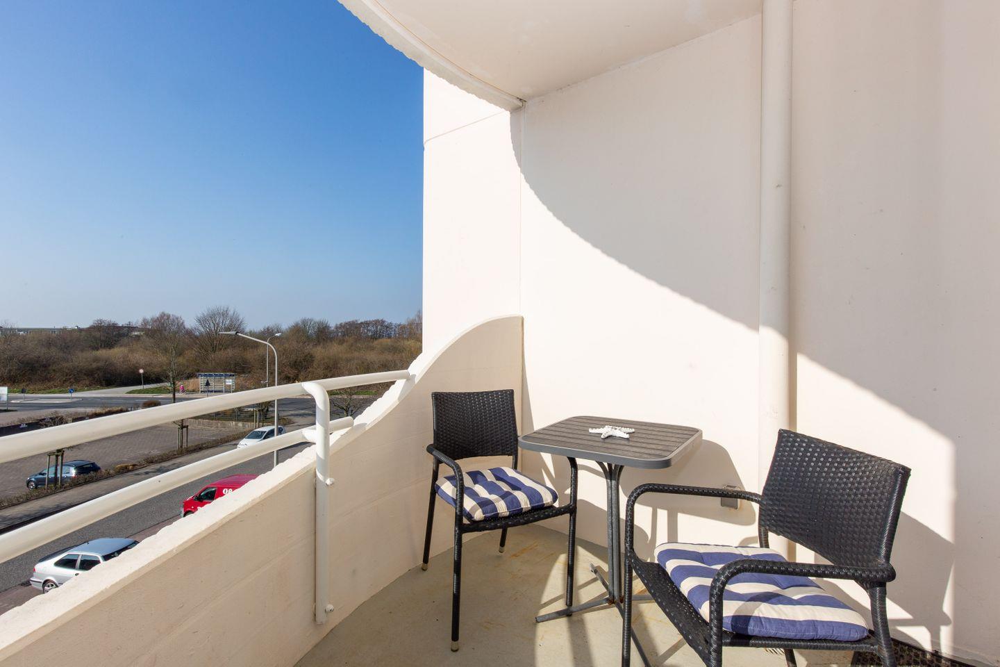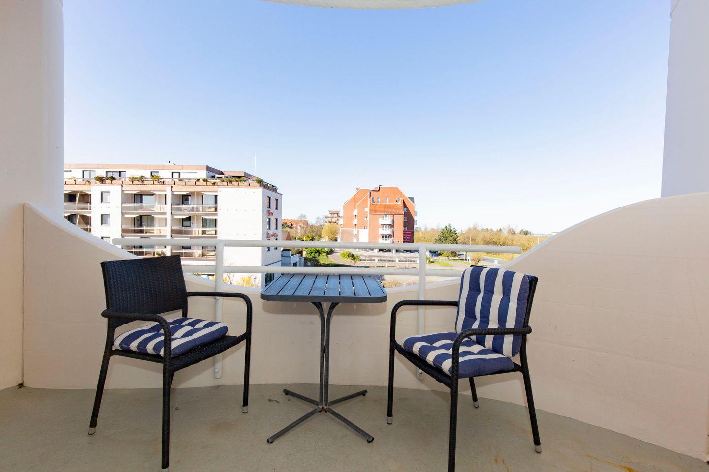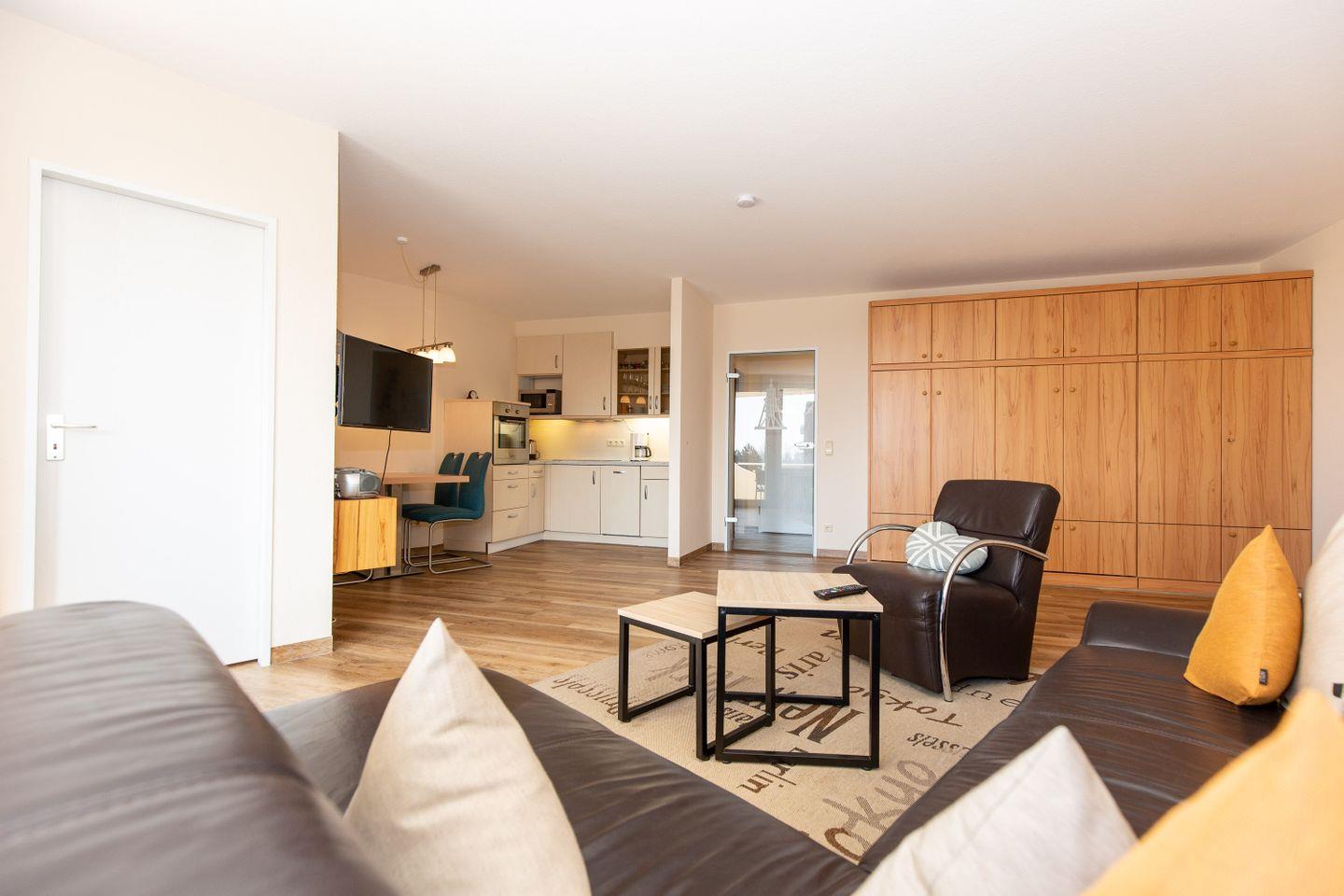 Haus "Trafalgar", TypC, App.-Nr. 222 bis 4 Pers., 2.Etage, ca. 55qm, Westseite, Wohn/Schlafbereich mit Schrankbett, Schlafzimmer mit zwei zusammenstehenden Einzelbetten, Küchenzeile mit Backofen, Geschirrspüler und Mikrowelle, Dusche/WC, Balkon, Kabel-TV, W-Lan Zugang im App, Telefon, Tiefgaragenstellplatz, Strandkorb im Sommer 2026