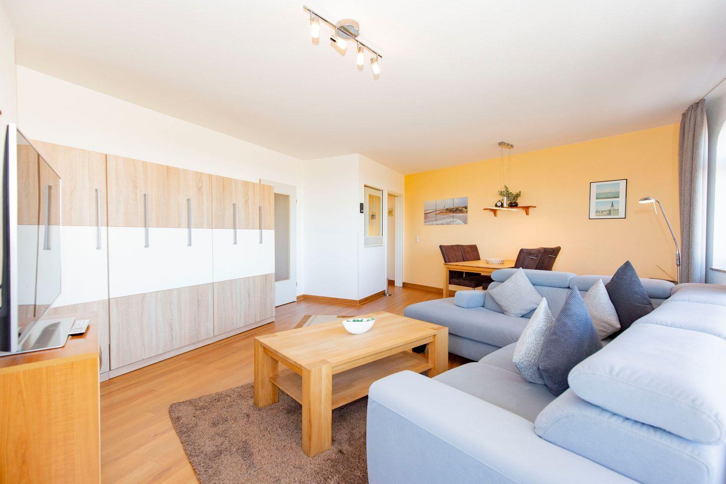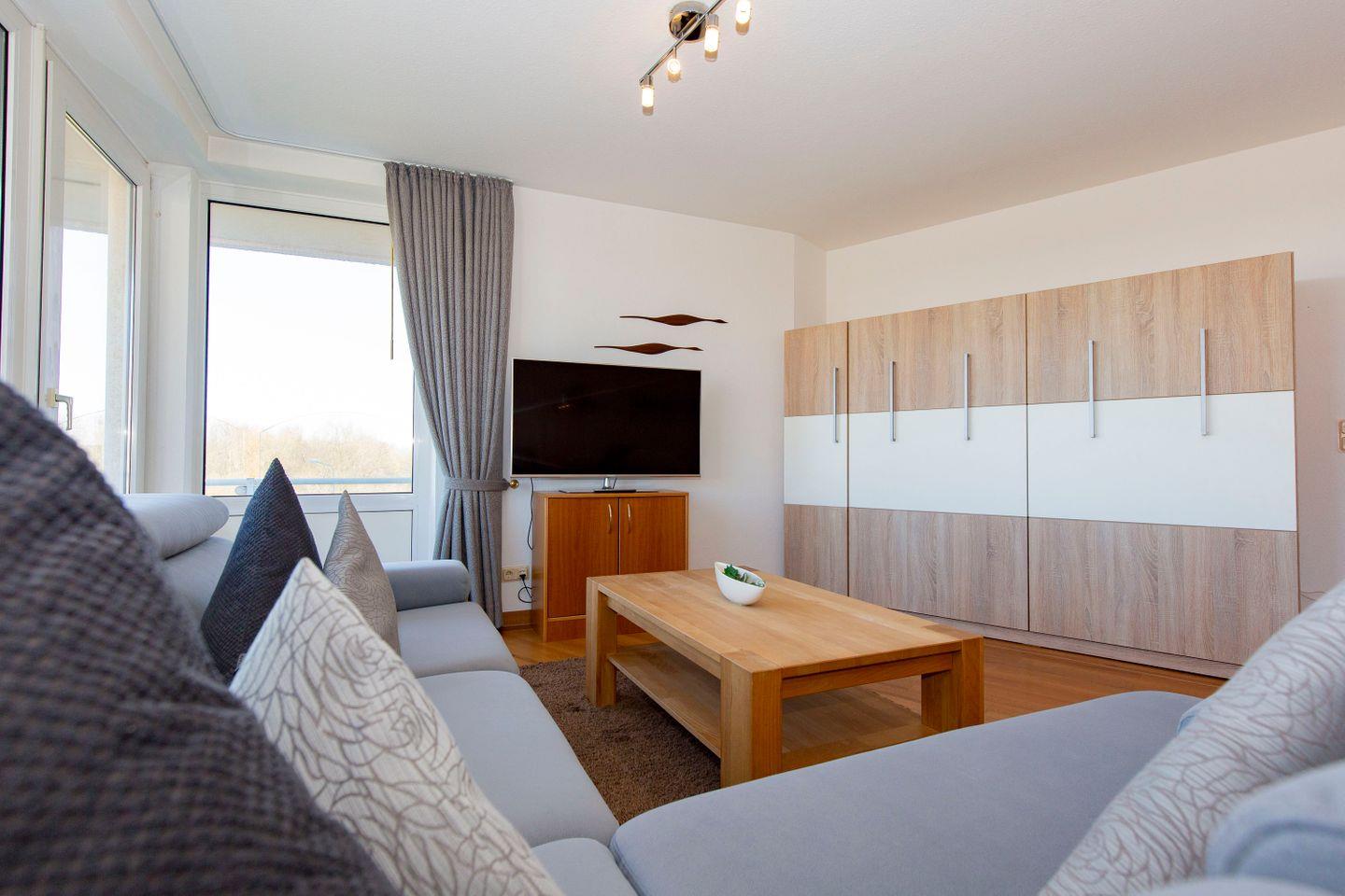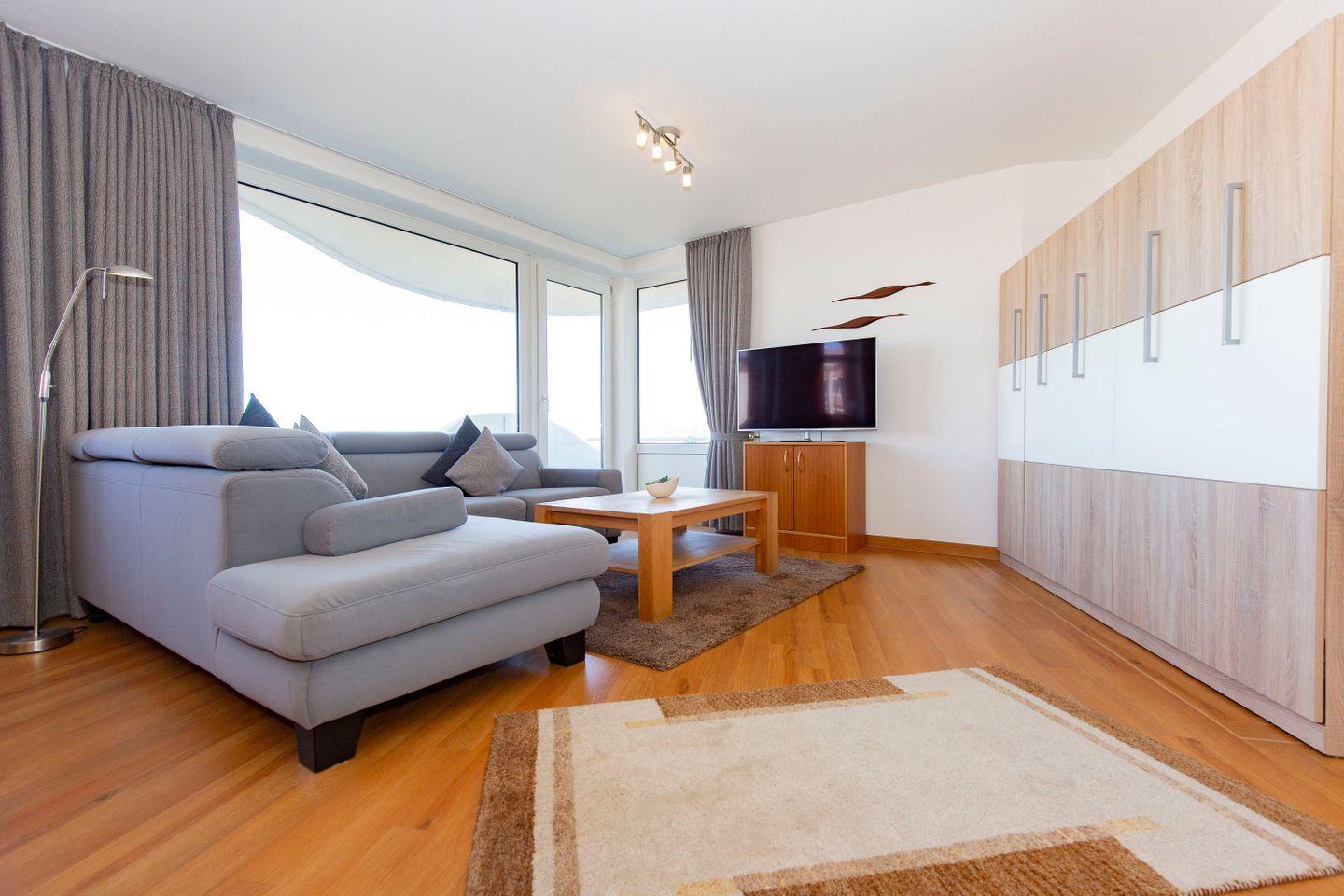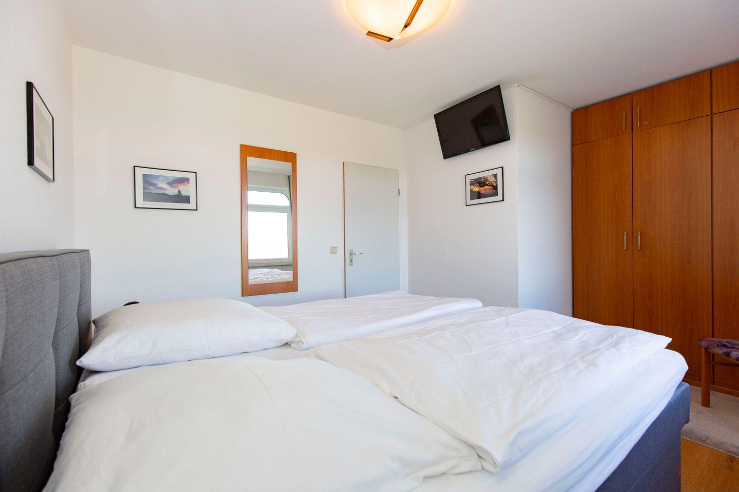Haus "Trafalgar", Typ D, Appartement-Nr. 221 bis 4 Pers., 2.Etage, ca. 66 qm, Nord/Westseite, Wohnbereich mit Schrankbett, Schlafzimmer mit Boxspringbett, 2. TV im Schlafzimmer, separate Küche mit Geschirrspüler, 4-Platten Ceranfeld und Mikrowelle, Dusche/WC, Nichtraucher-App. Balkon, Kabel-TV, W-LAN-Anschluss, Tiefgaragenstellplatz, Strandkorb im Sommer 2026.