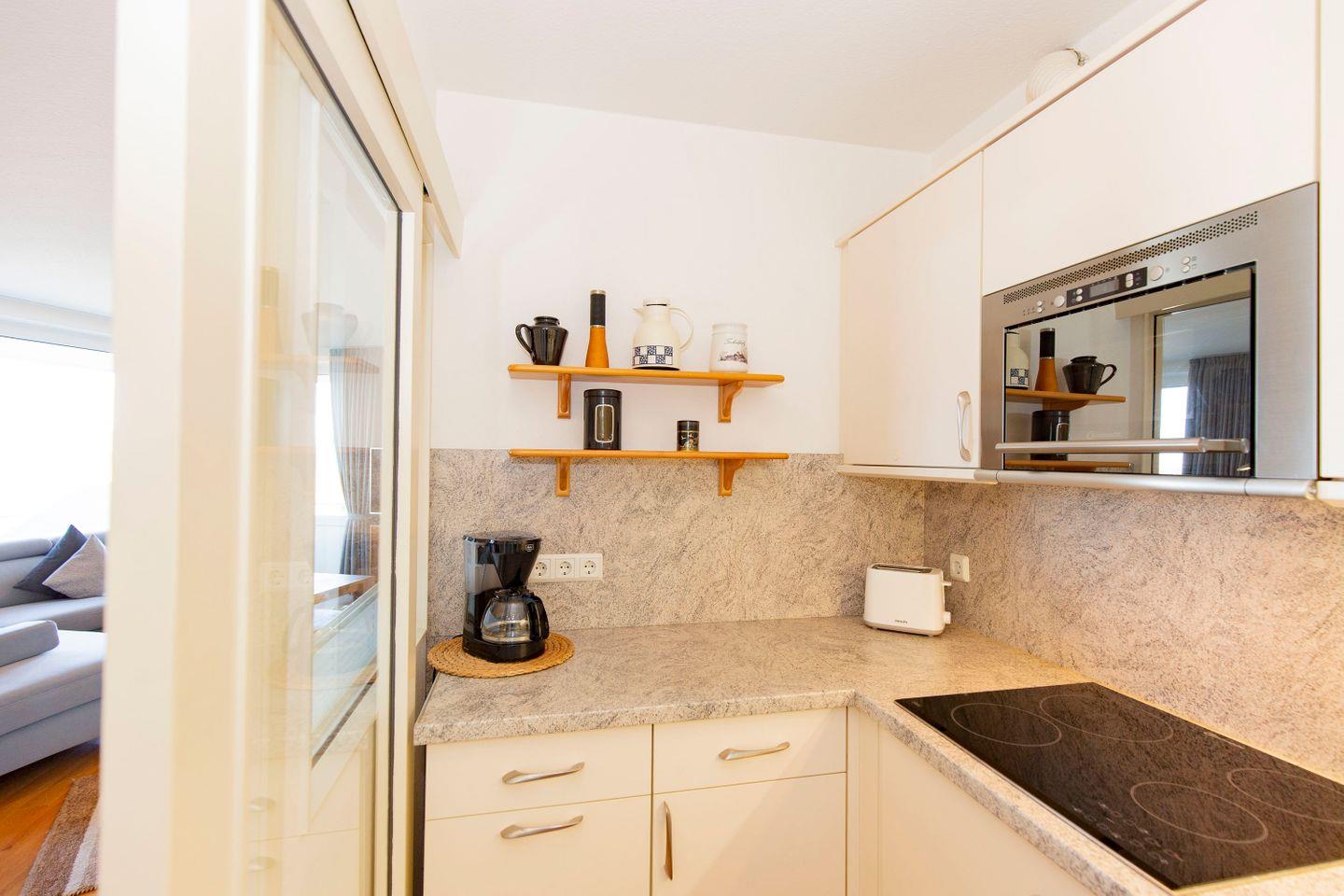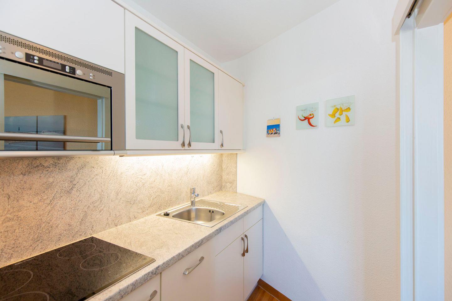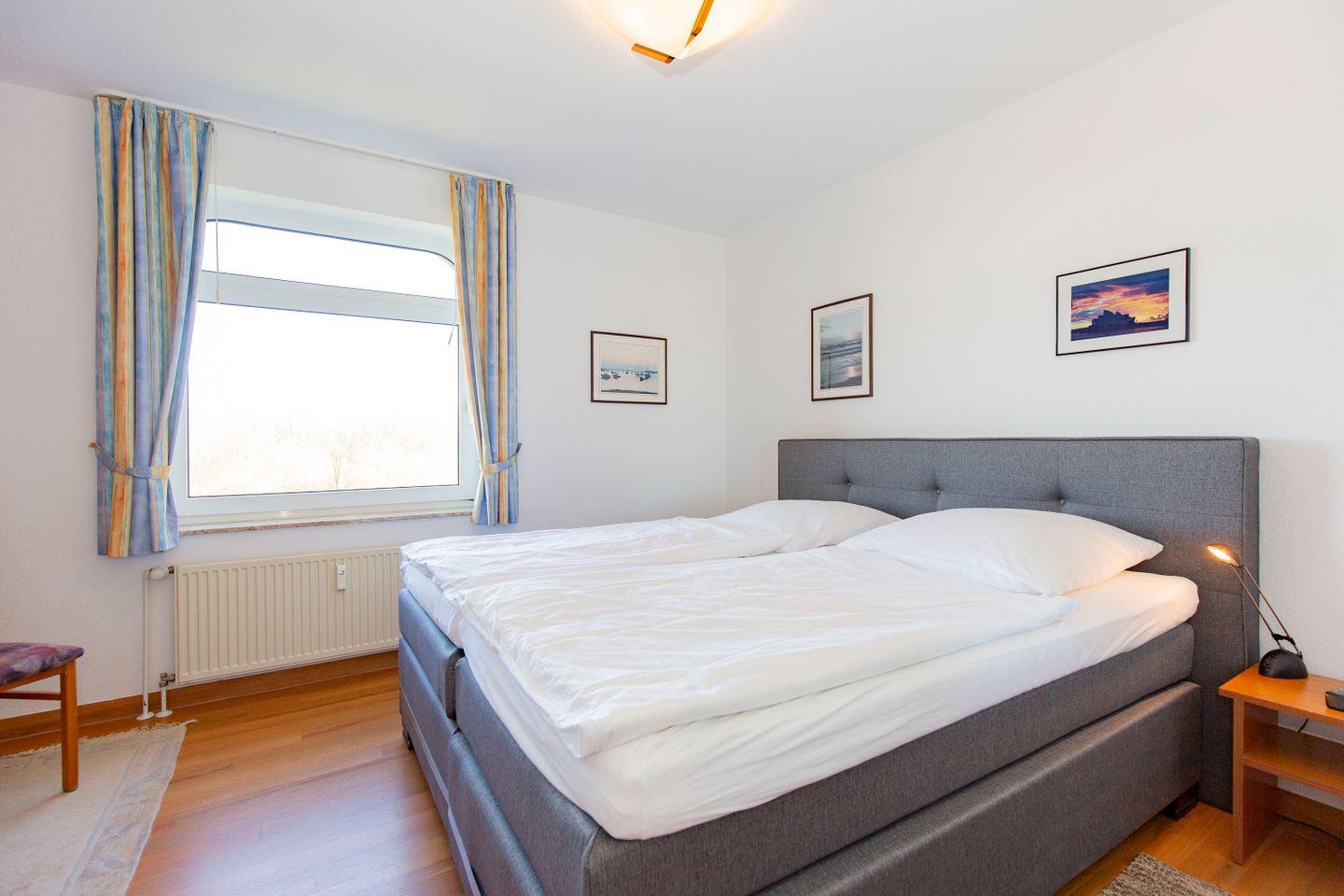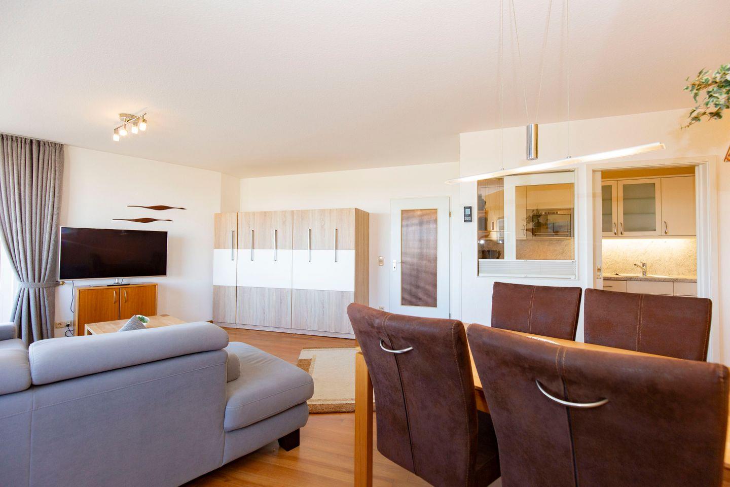Haus "Trafalgar", Typ D, Appartement-Nr. 221 bis 4 Pers., 2.Etage, ca. 66 qm, Nord/Westseite, Wohnbereich mit Schrankbett, Schlafzimmer mit Boxspringbett, 2. TV im Schlafzimmer, separate Küche mit Geschirrspüler, 4-Platten Ceranfeld und Mikrowelle, Dusche/WC, Nichtraucher-App. Balkon, Kabel-TV, W-LAN-Anschluss, Tiefgaragenstellplatz, Strandkorb im Sommer 2026.