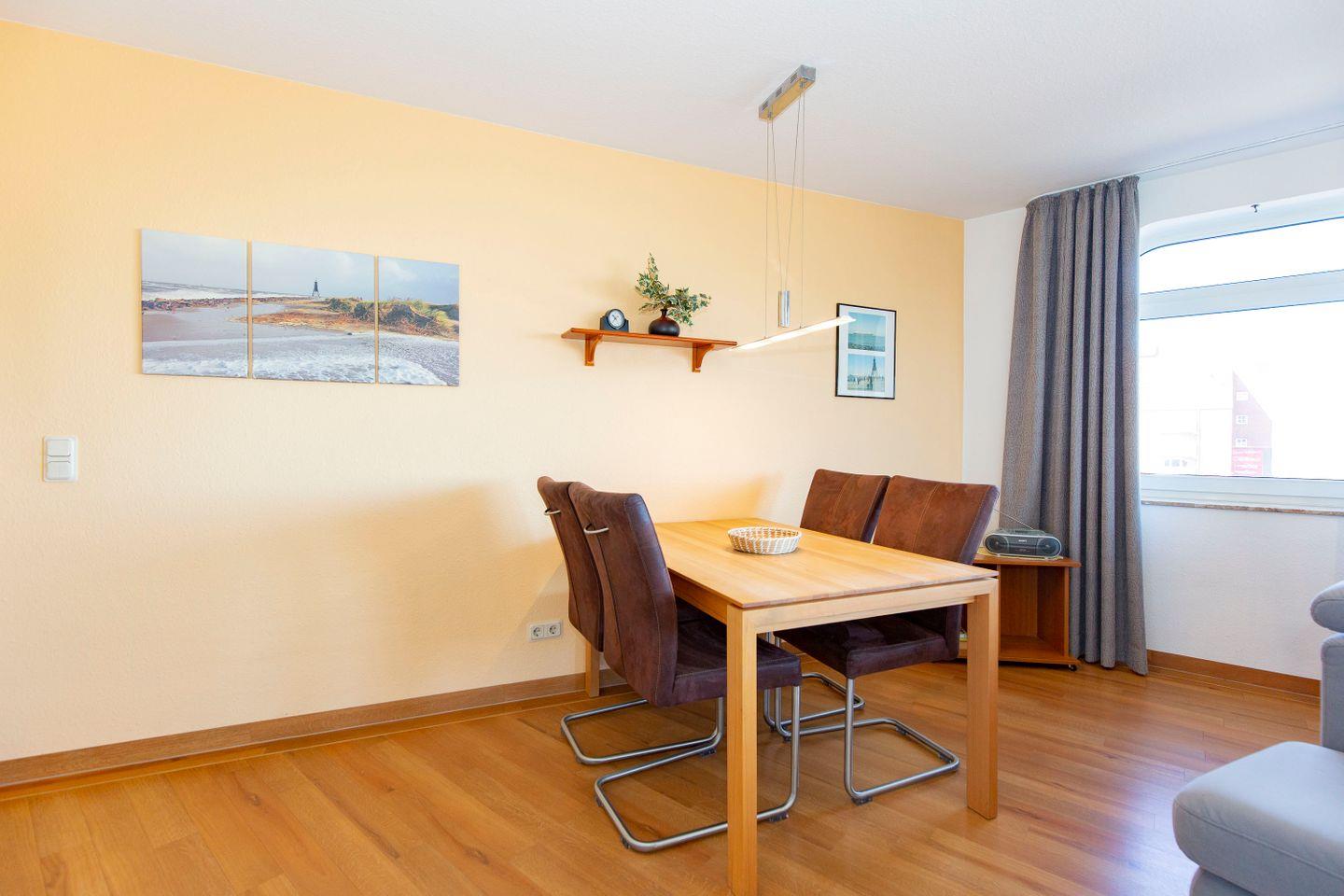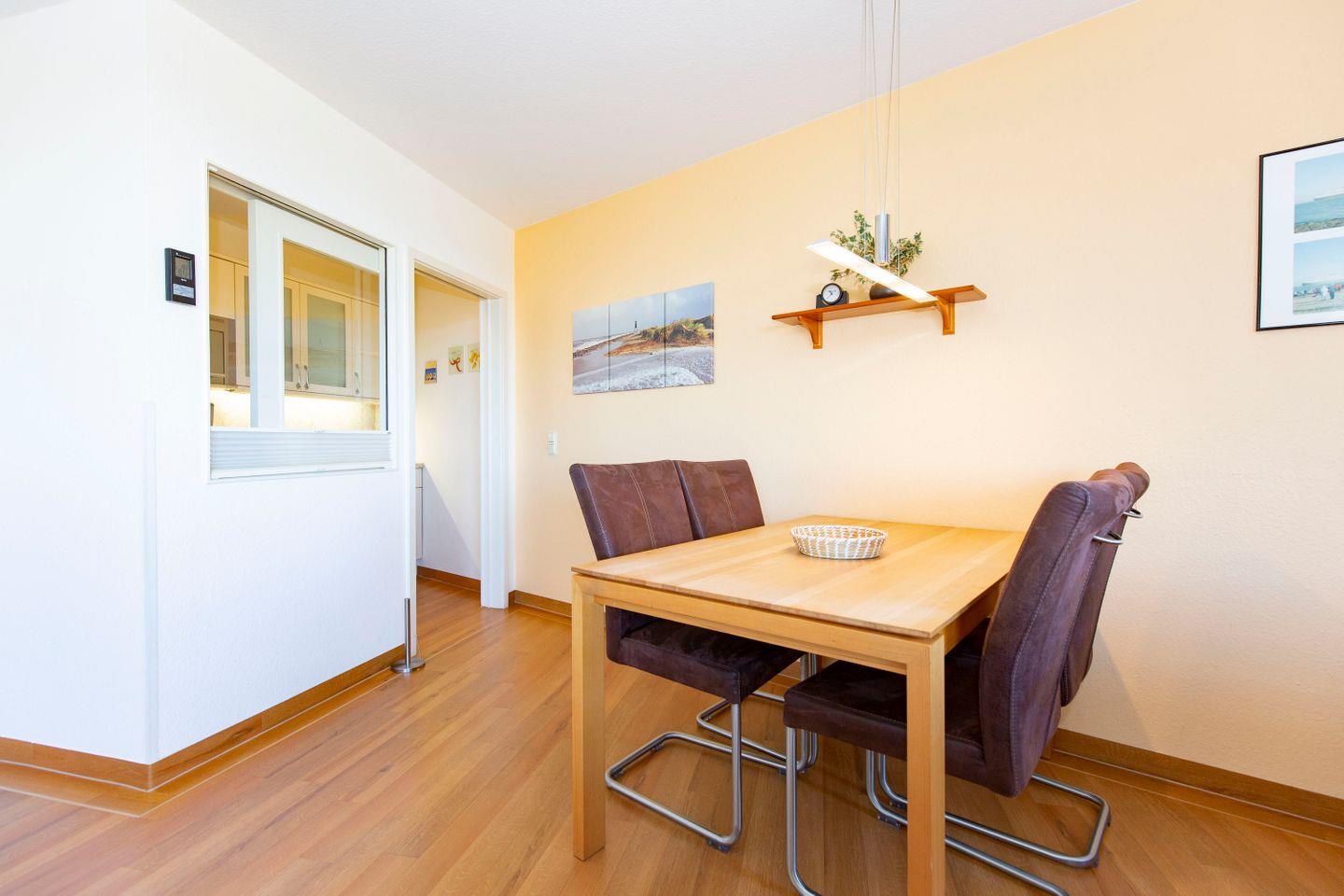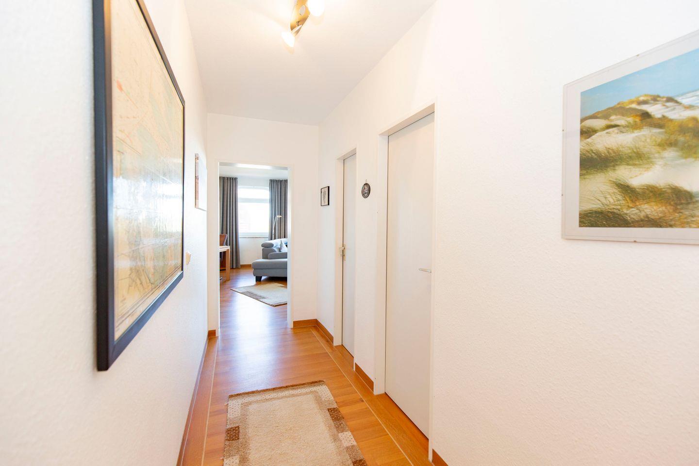Auf 66 m² finden in dieser 2-Zimmer-Ferienwohnung (Hundefreundlich) bis zu vier Personen Platz. Eine schlichte, edle Einrichtung prägt das Bild: Gepaart mit den großen Räumlichkeiten wird so eine ruhige Atmosphäre kreiert, die zu Entspannung und Erholung einlädt. Die FeWo punktet mit einem Balkon mit eingeschränkten, seitlichem Meerblick und strandnaher Lage.