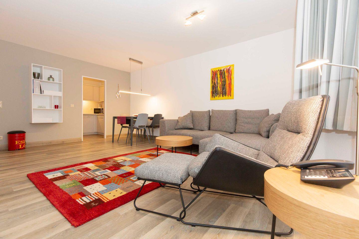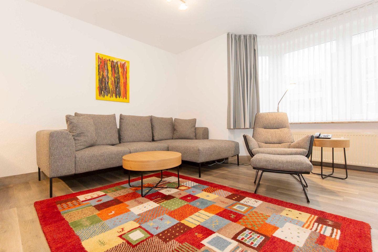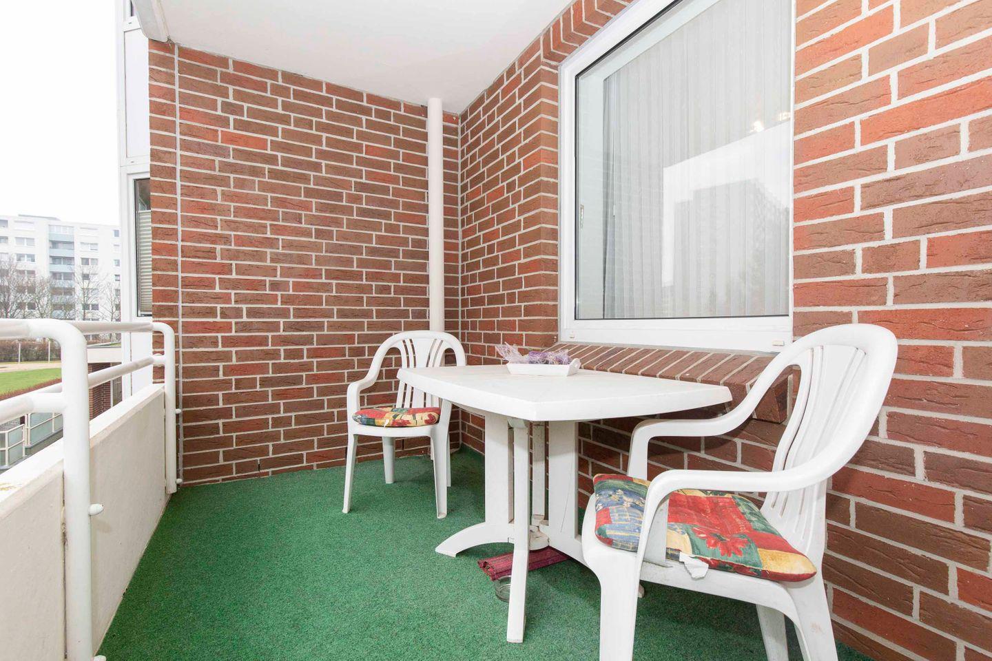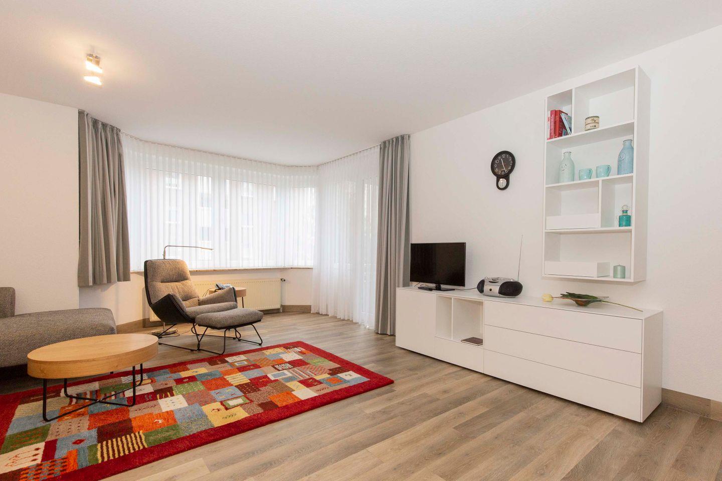 Haus "Trafalgar", Typ C, Appartement-Nr. 155, bis 2 Pers., 1. Etage, ca. 55 qm, Nordseite (ohne Meerblick), Wohnzimmer, Schlafzimmer mit Doppelbett, separate Küche mit Geschirrspüler und Mikrowelle, Dusche/WC, Nichtraucher App, Balkon, Kabel-TV, kostenl. WLAN im Appartement,Telefon, Tiefgaragenstellplatz, Haustiere sind nicht gestattet,