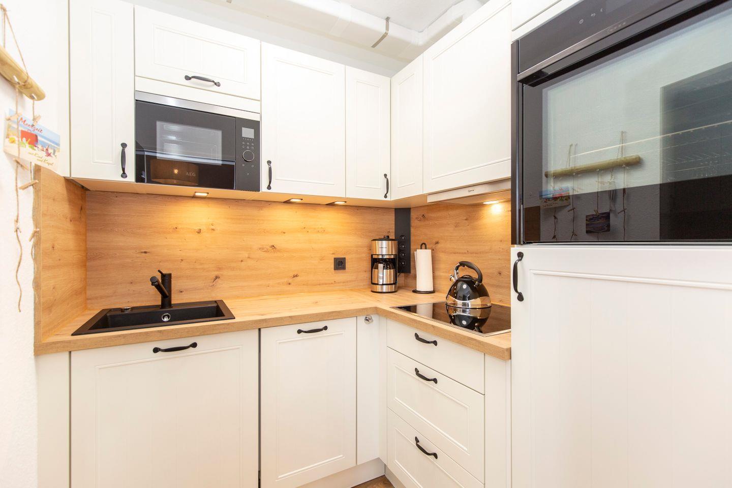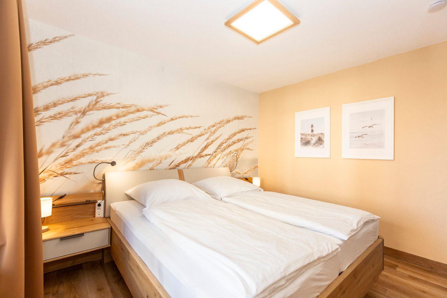 Haus "Trafalgar", Typ C, App.-Nr. 154, bis 4 Pers., 1.Etage, ca. 55 qm, Nordseite (ohne Meerblick), Schlafzimmer mit Doppelbett, Wohn/Schlafbereich mit Schrankbett, sep. Küche, Dusche/WC, Balkon, Kabel-TV, kostenl. W-Lan Zugang im App, Haustiere sind nicht gestattet, Nichtraucherwohnung, Tiefgaragenstellplatz, Strandkorb im Sommer 2025