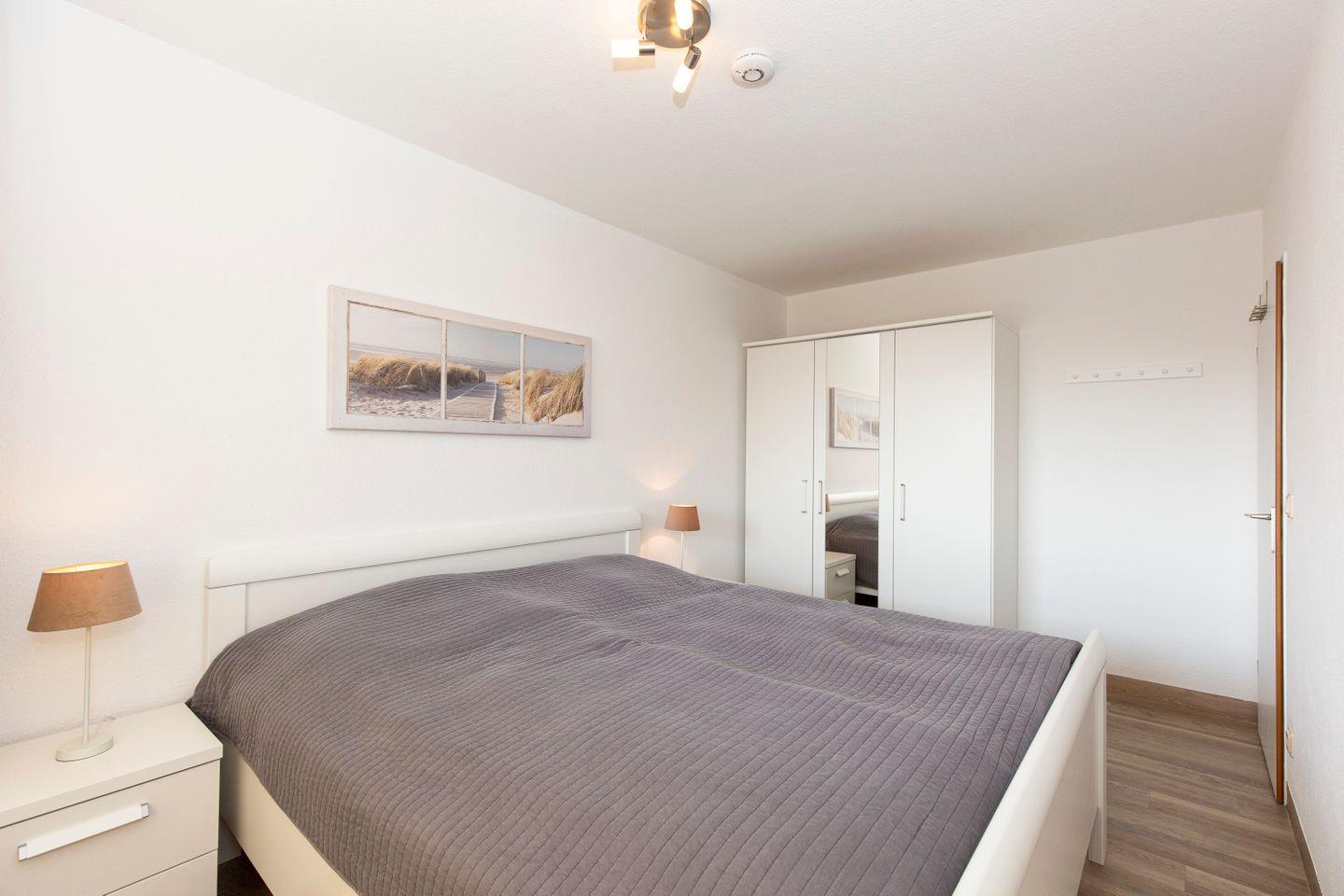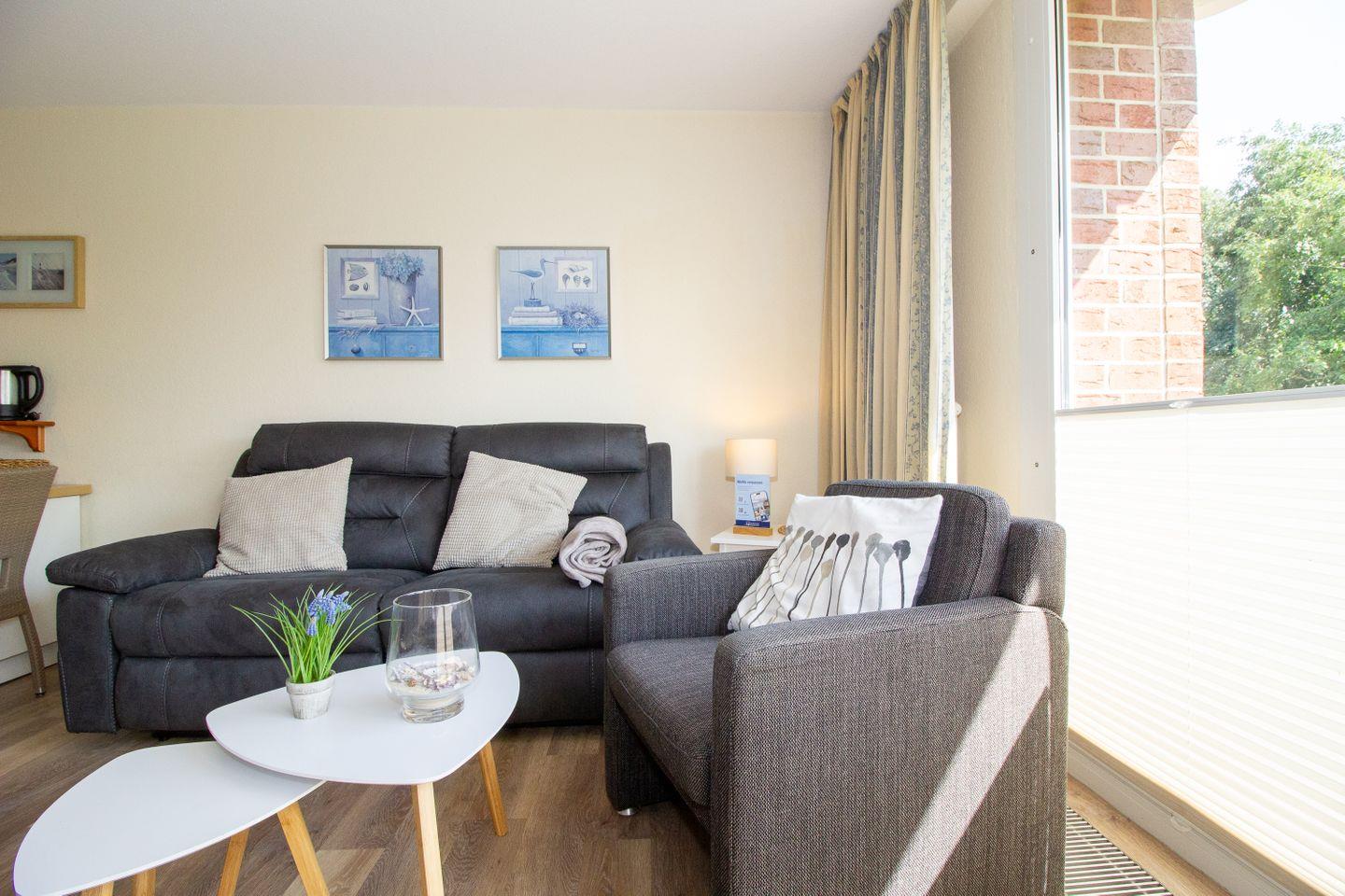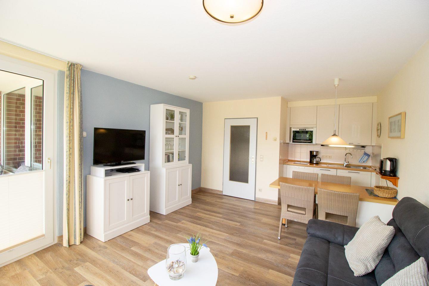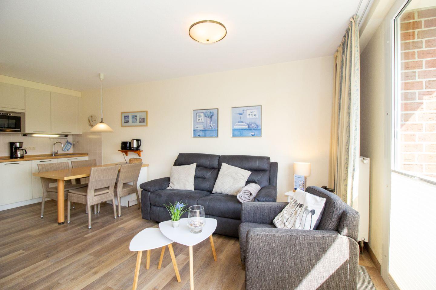 Haus "Trafalgar", Typ B, App-Nr. 145, bis 2 Pers., 1.Etage, ca. 46 qm, Südseite (ohne Meerblick), Schlafzimmer mit Doppelbett, Wohnzimmer mit Küchenzeile mit Geschirrspüler, Ceranfeld und Mikrowelle, Dusche/WC, Balkon, Kabel-TV, Telefon, WLAN-Zugang im App., Tiefgaragenstellplatz, Nichtraucherappartement, Strandkorb im Sommer 2026, 1 Hund erlaubt.