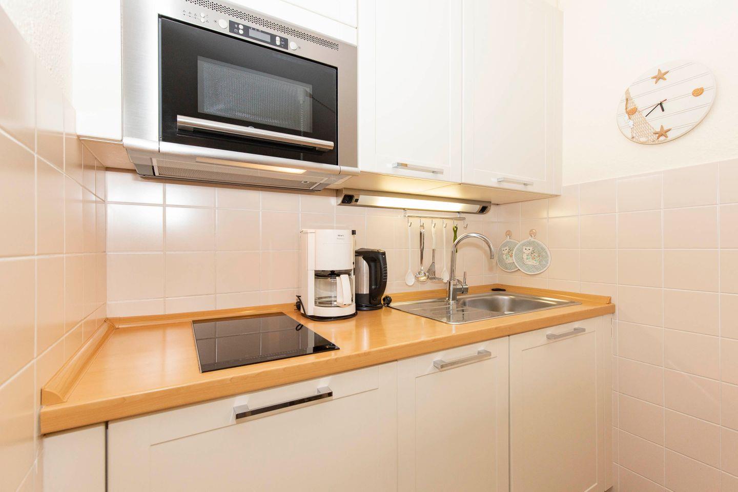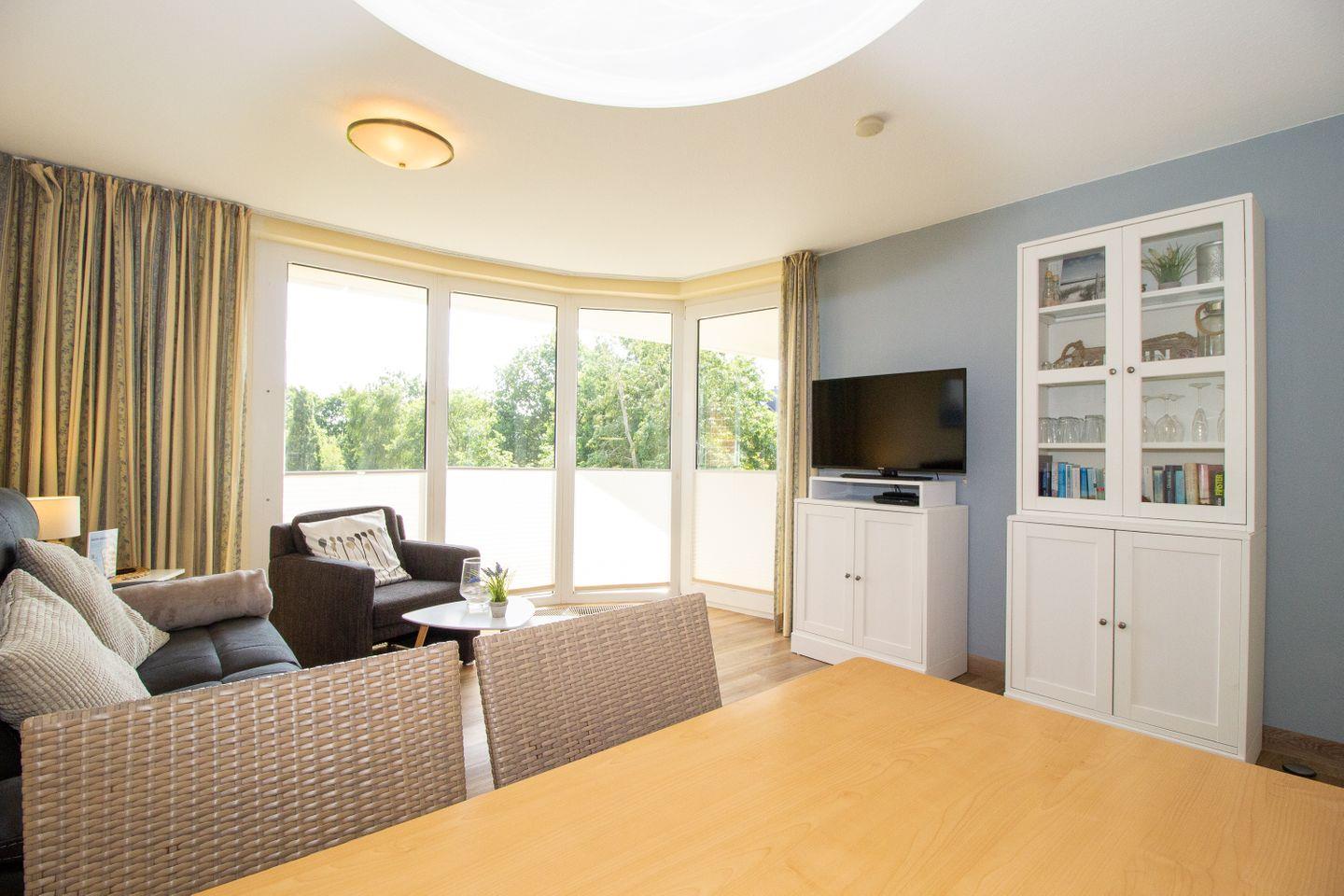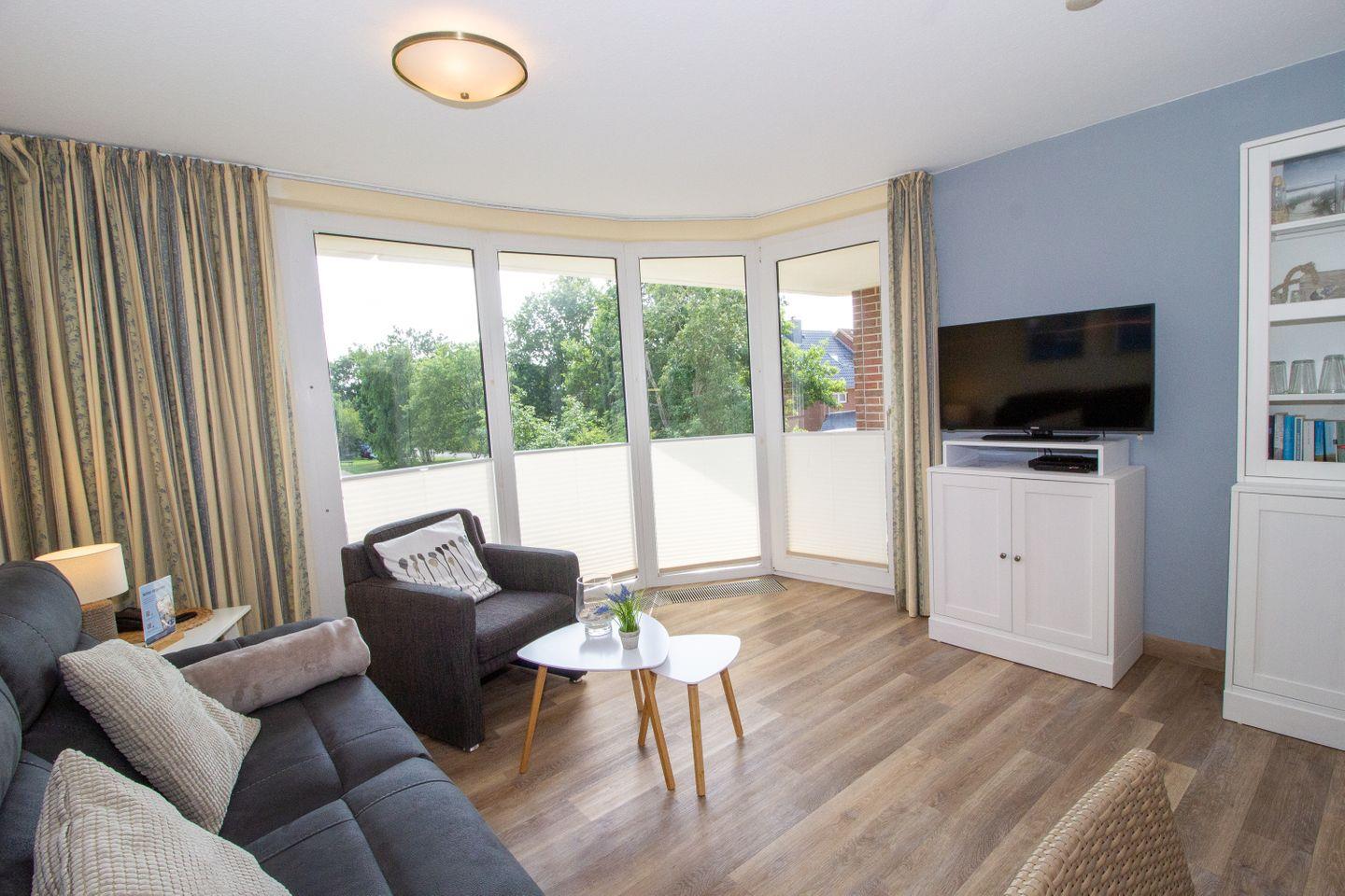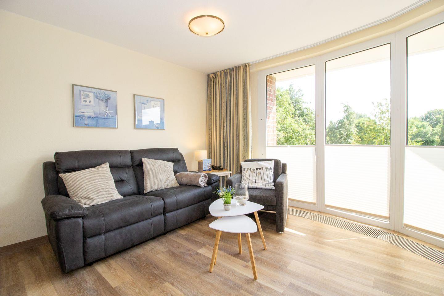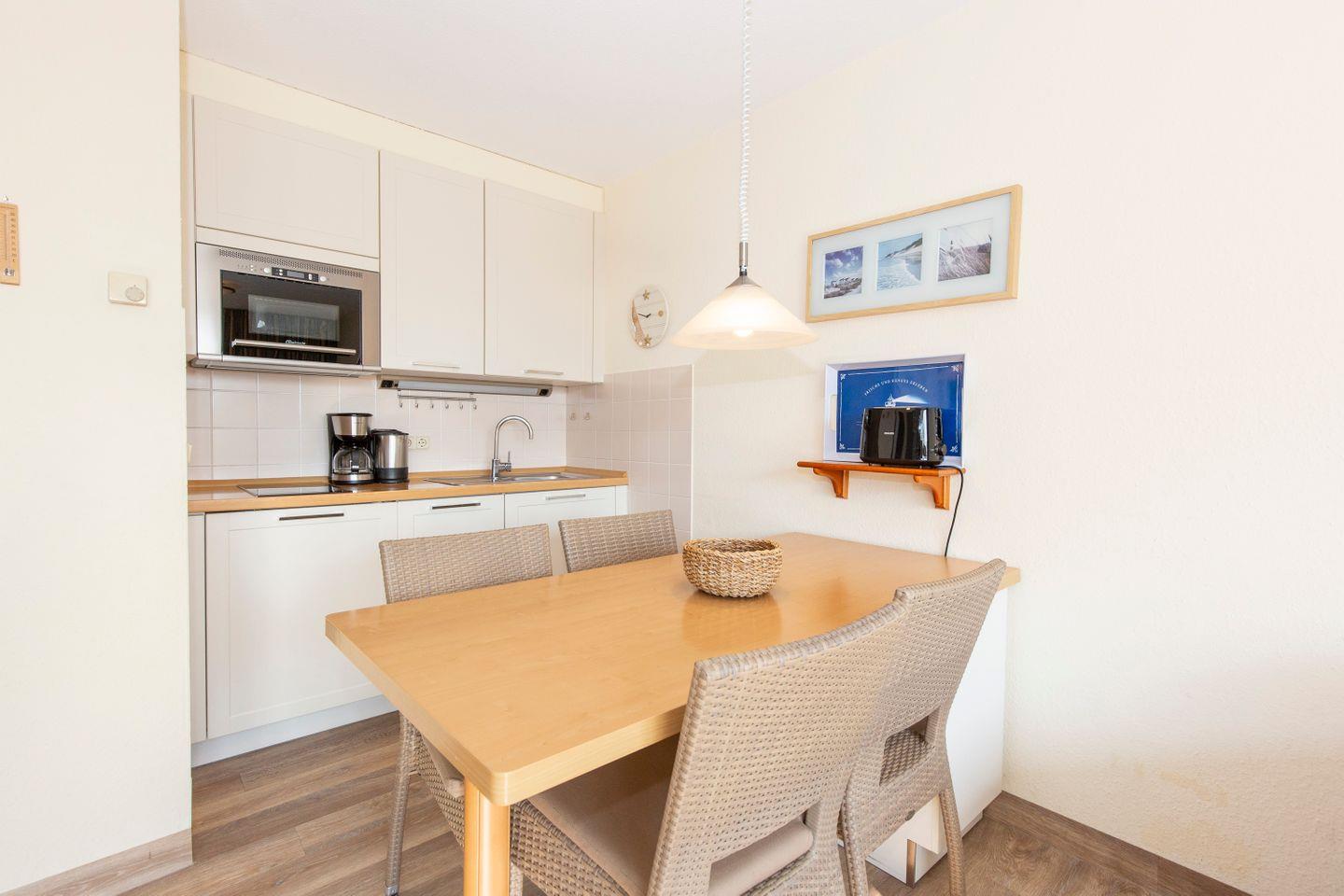 Haus "Trafalgar", Typ B, App-Nr. 145, bis 2 Pers., 1.Etage, ca. 46 qm, Südseite (ohne Meerblick), Schlafzimmer mit Doppelbett, Wohnzimmer mit Küchenzeile mit Geschirrspüler, Ceranfeld und Mikrowelle, Dusche/WC, Balkon, Kabel-TV, Telefon, WLAN-Zugang im App., Tiefgaragenstellplatz, Nichtraucherappartement, Strandkorb im Sommer 2026, 1 Hund erlaubt.