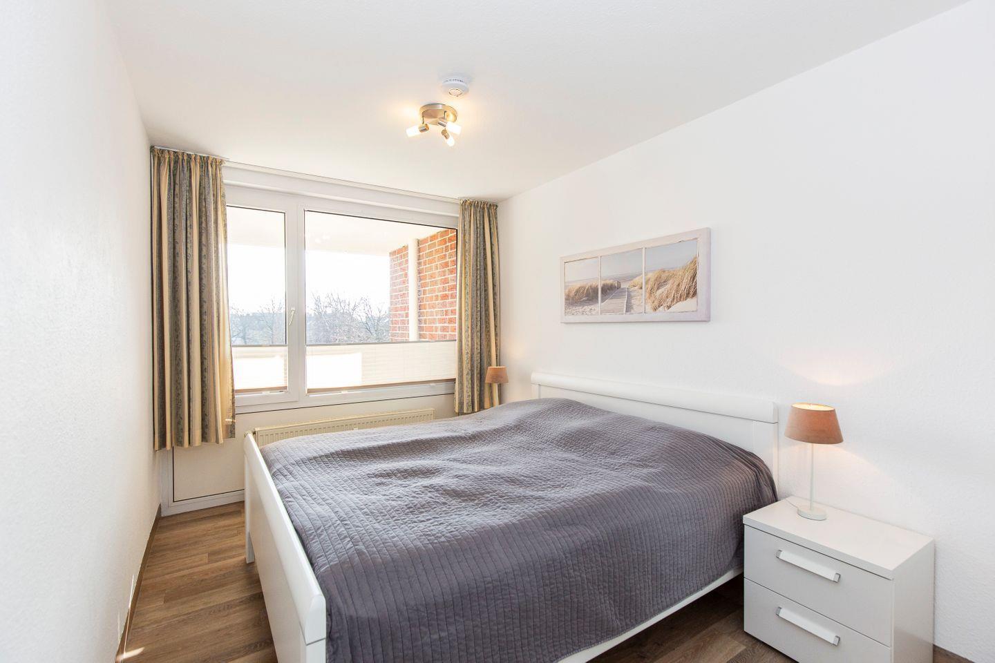 Haus "Trafalgar", Typ B, App-Nr. 145, bis 2 Pers., 1.Etage, ca. 46 qm, Südseite (ohne Meerblick), Schlafzimmer mit Doppelbett, Wohnzimmer mit Schlafcouch, Küchenzeile mit Geschirrspüler, Ceranfeld und Mikrowelle, Dusche/WC, Balkon, Kabel-TV, Telefon, kostenl. WLAN-Zugang im App.,Tiefgaragenstellplatz, Nichtraucherappartement, Strandkorb im Sommer 2025, 1 Hund erlaubt.