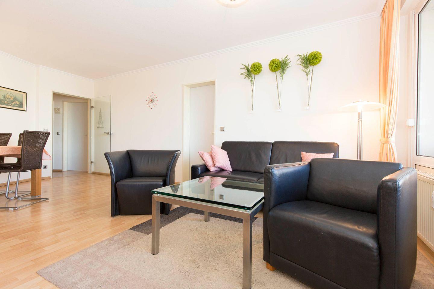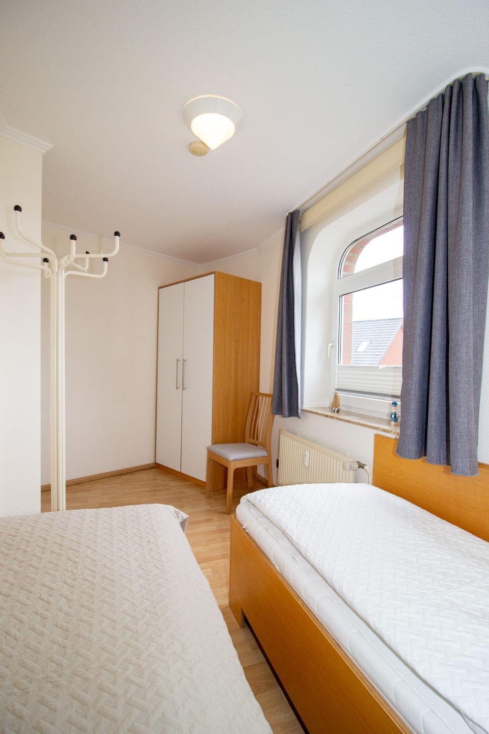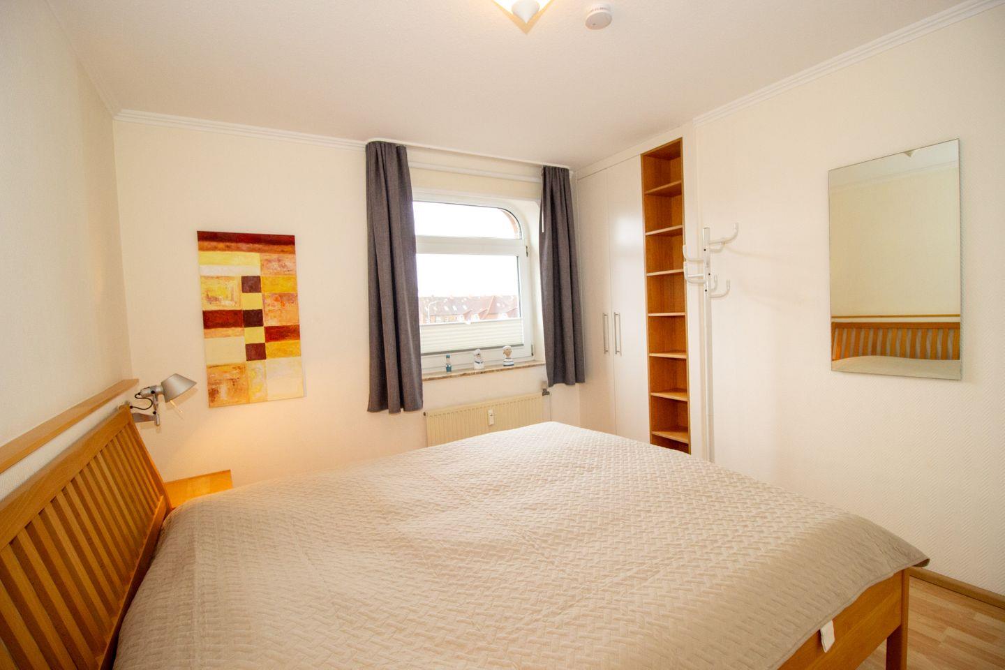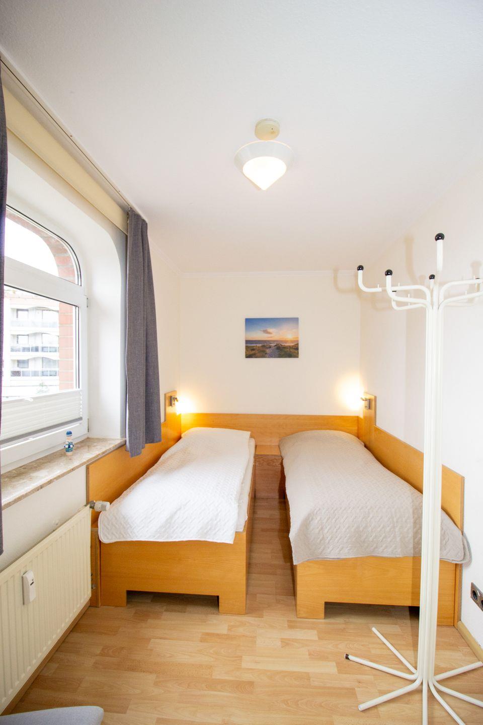 Haus "Trafalgar", Typ D, Appartement-Nr. 127, bis 4 Pers., 1.Etage, ca. 66 qm, Westseite (ohne Meerblick), Schlafzimmer mit Doppelbett, Schlafzimmer mit zwei Einzelbetten, separate Küche mit Backofen, Mikrowelle und Geschirrspüler, Dusche/WC, Balkon, Kabel-TV, Telefon, kostenl. WLAN-Zugang im App., Tiefgaragenstellplatz, Haustiere sind nicht gestattet, Nichtraucherwohnung, Strandkorb im Sommer 2026.