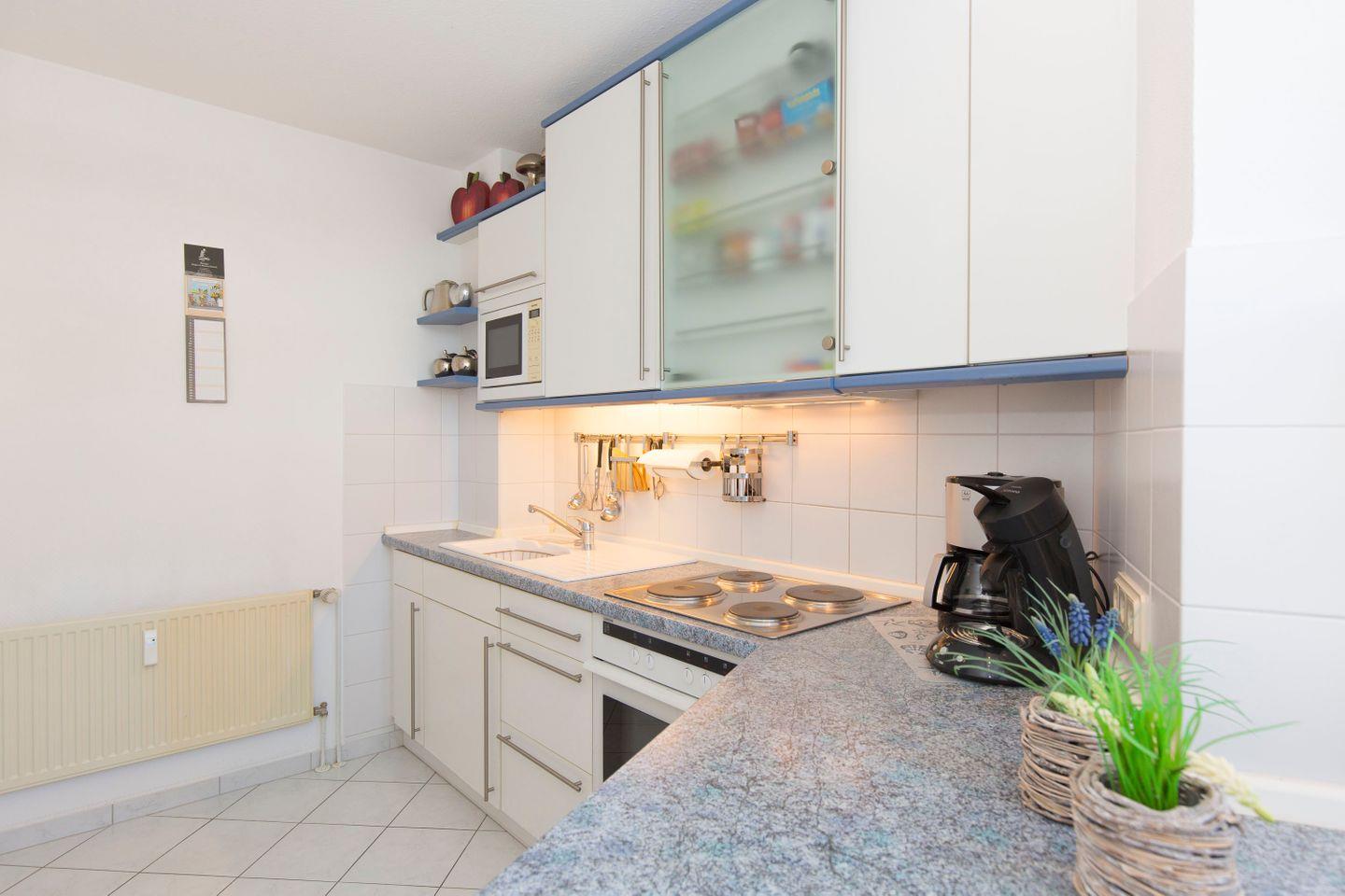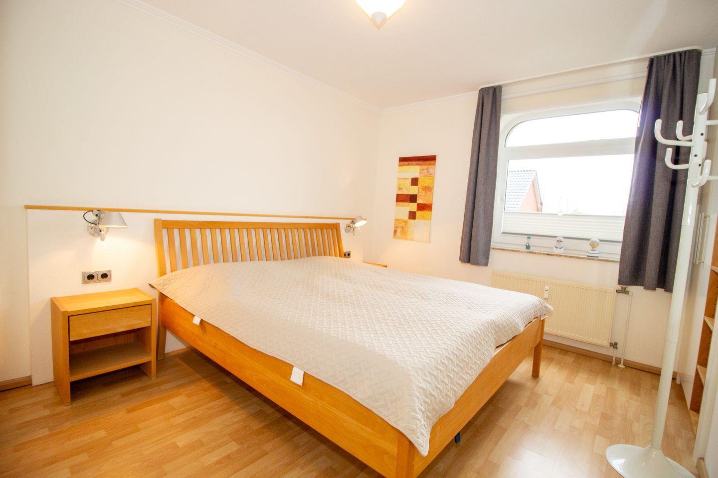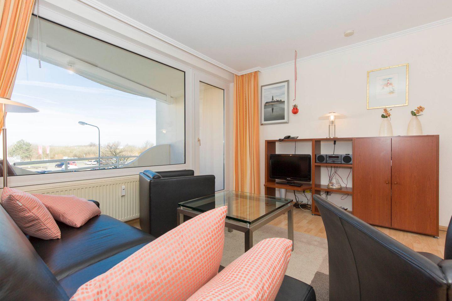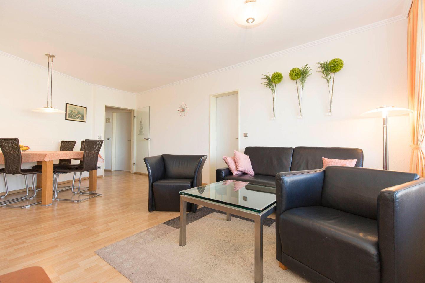 Haus "Trafalgar", Typ D, Appartement-Nr. 127, bis 4 Pers., 1.Etage, ca. 66 qm, Westseite (ohne Meerblick), Schlafzimmer mit Doppelbett, Schlafzimmer mit zwei Einzelbetten, separate Küche mit Backofen, Mikrowelle und Geschirrspüler, Dusche/WC, Balkon, Kabel-TV, Telefon, kostenl. WLAN-Zugang im App., Tiefgaragenstellplatz, Haustiere sind nicht gestattet, Nichtraucherwohnung, Strandkorb im Sommer 2026.