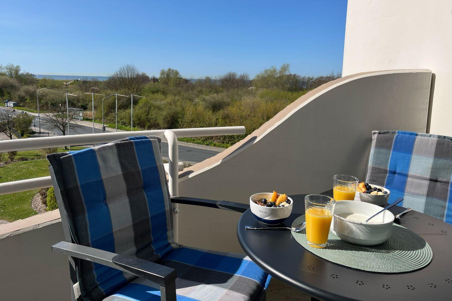Der Balkon bietet den Blick Richtung Deich/Neuwerk. Hier können Sie schon am Morgen beim Frühstück die salzige Meeresluft genießen.
