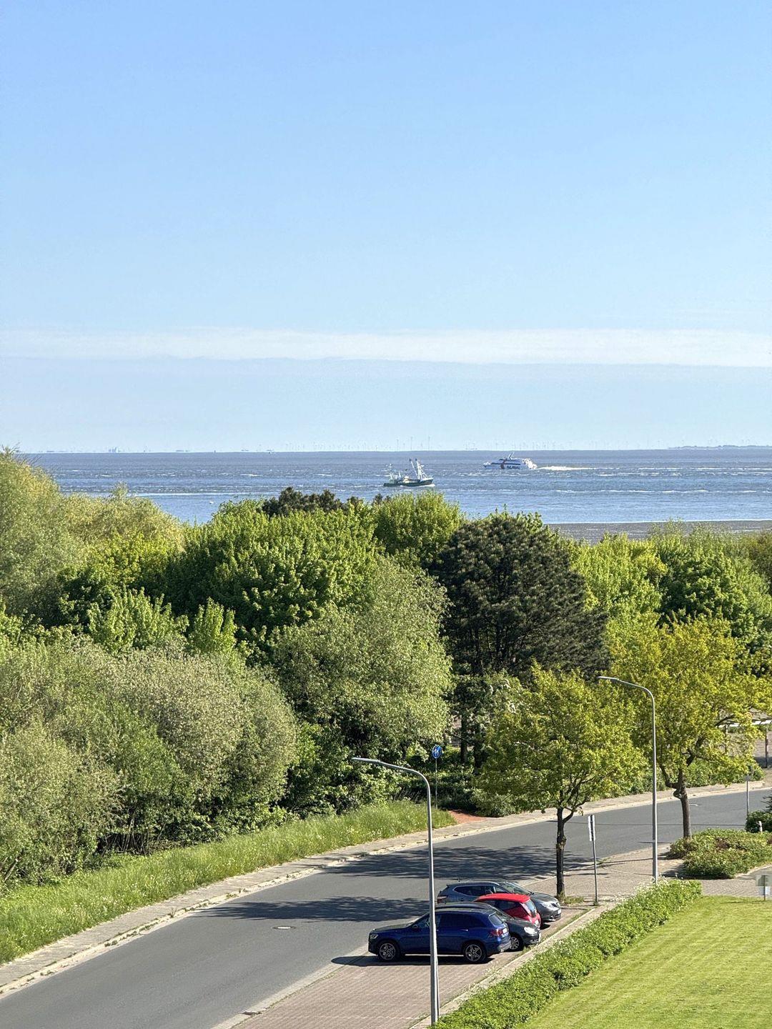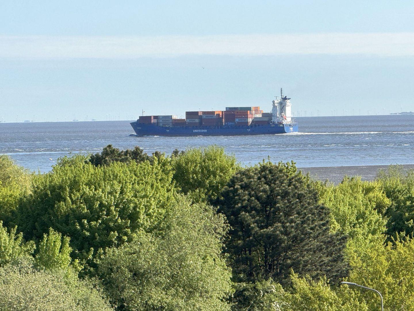 Auf dem Balkon in der 5. Etage haben Sie einen tollen Ausblick in Richtung Weltschifffahrtsweg und Elbmündung. Hier können sie beim Frühstück in der Morgensonne die großen Frachter auf ihrem Weg nach Hamburg beobachten.