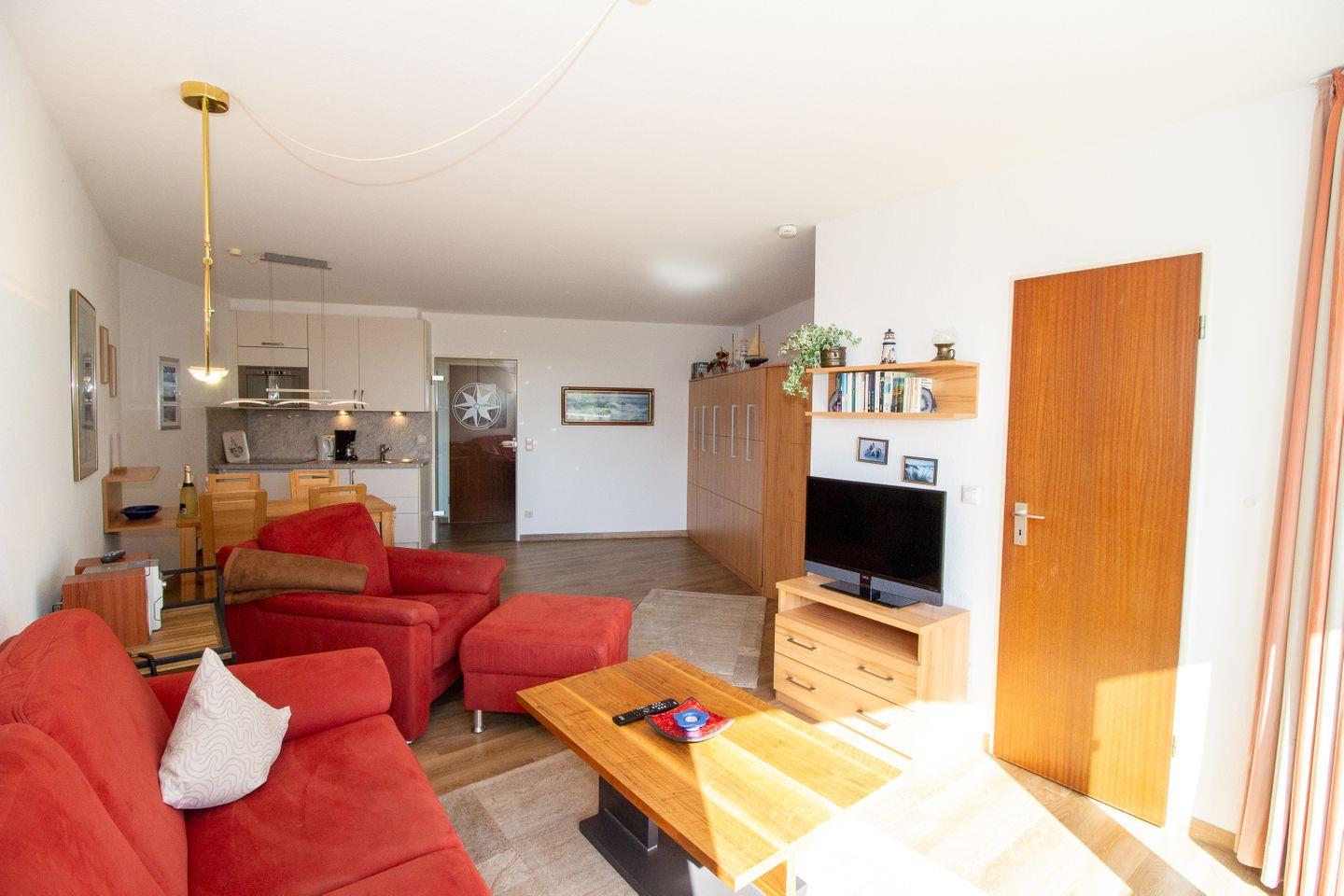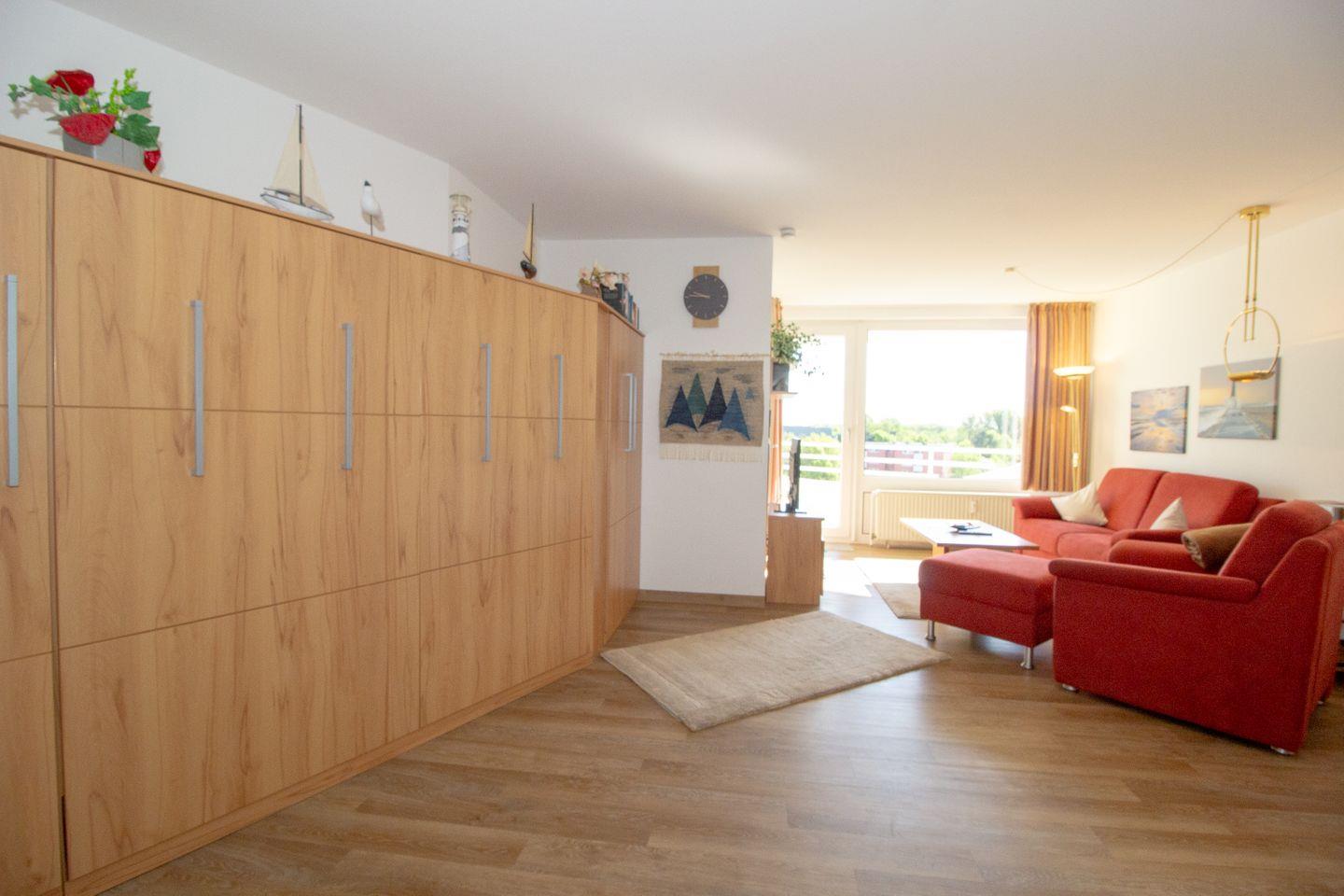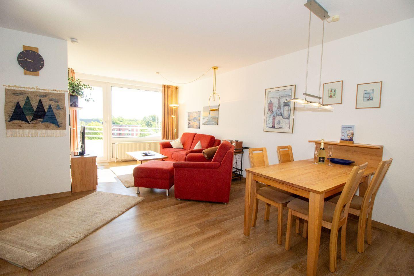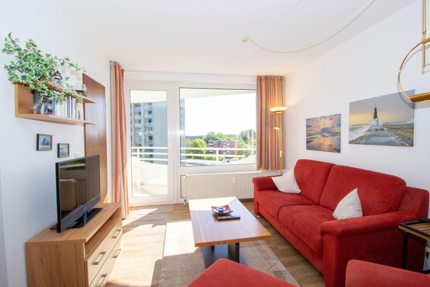 Haus "Lord Nelson", Typ 2, App.-Nr. 518, bis 4 Personen, ca. 40 qm, Richtung Weltschifffahrtsweg, seitlicher Meerblick Richtung Elbe, Wohnbereich mit Schrankbett (einzeln klappbar), separates Schlafzimmer mit Etagenbett mit hohem Einstieg, Dusche/WC, Küchenzeile mit Geschirrspüler, 4-Platten-Ceranfeld, Mikrowellen-Grillkombination, Vinyl-Design-Boden, Balkon, Telefon, Flatscreen-TV, kostenl. W-Lan Zugang im App., Radio/CD, für Haustiere zugelassen, Tiefgaragenstellplatz, Strandkorb im Sommer 2026.