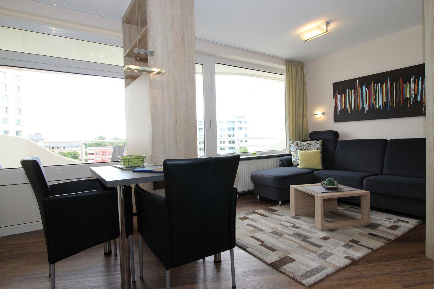 Haus "Lord Nelson", Typ 2, App.-Nr. "516", bis 2 Personen, 5. Etage, ca. 40 qm Größe, Richtung Weltschifffahrtsweg (seitlicher Meerblick Richtung Elbe), separater Schlafbereich (innenliegend) mit zwei Einzelbetten, Küchenzeile mit Geschirrspüler, Backofen und Mikrowelle, Balkon, ohne Telefon, Kabel-TV, DVD-Player, Dusche/WC, kostenl. WLAN-Zugang im App., Außenstellplatz, Strandkorb im Sommer 2025, ab 7 Nächten wird einmalig p.P. Bettwäsche gestellt, Nichtraucherwohnung, Haustiere sind nicht gestattet