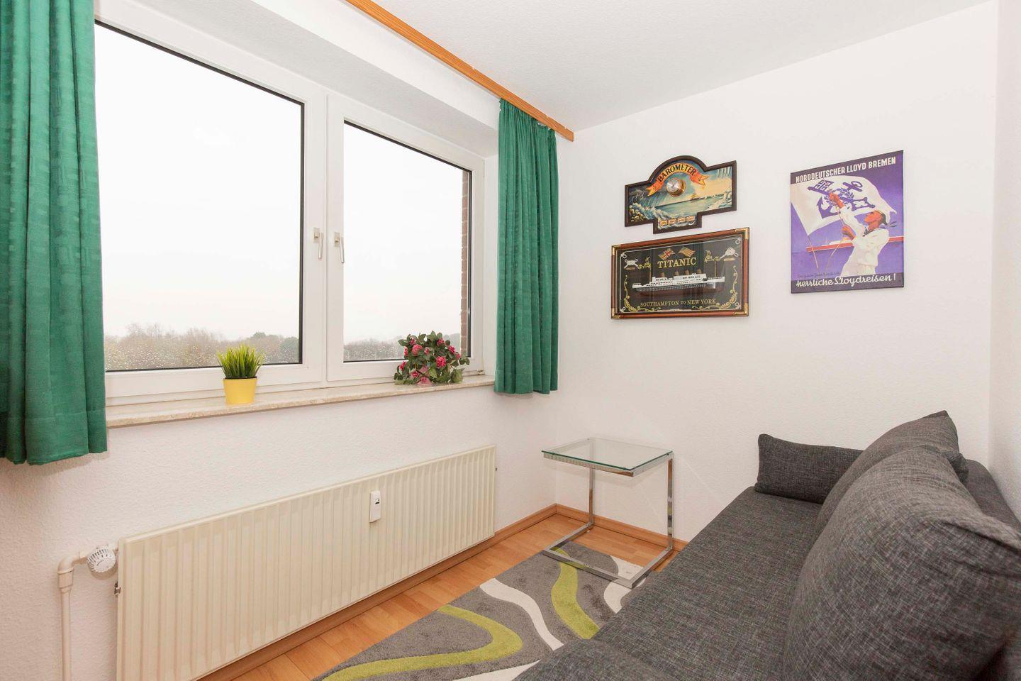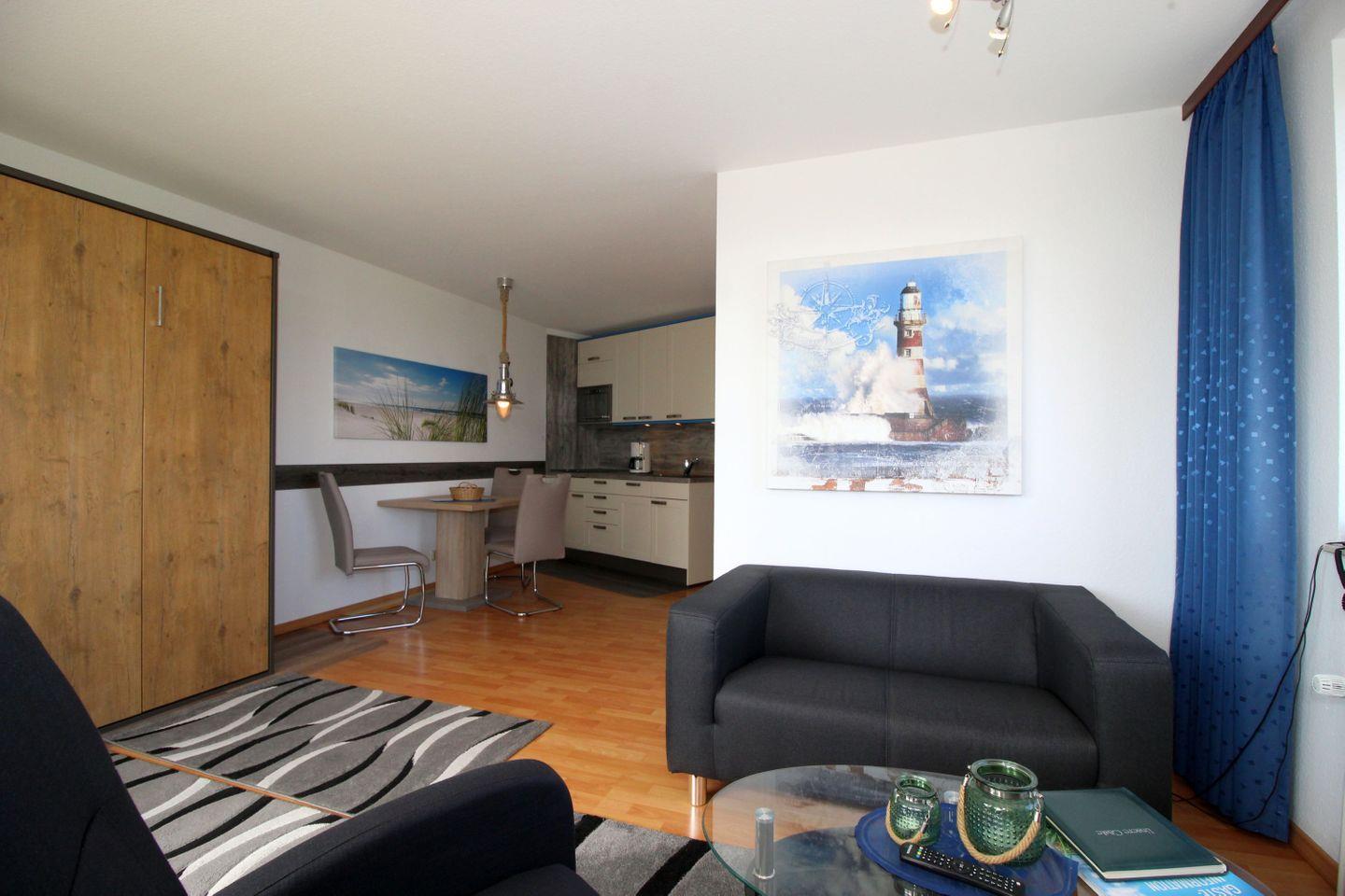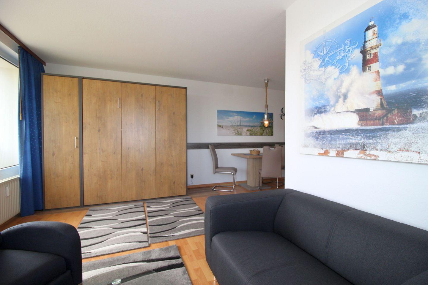 Haus "Lord Nelson", Typ 1, App.-Nr. 420, bis 2 Pers., 4. Etage, ca. 43 qm, Weltschifffahrtsweg, Meerblick Richtung Nordsee, seitlicher Meerblick Richtung Elbe , Wohnbereich mit Schrankbett, sep. kleines Schlafzimmer mit Schlafcouch, Dusche/WC, Küchenzeile mit Geschirrspüler und Mikrowelle, 2-Platten-Ceranfeld, Laminat, Balkon, Kabel-TV, Tiefgaragenstellplatz, Haustiere sind nicht erlaubt, Nichtraucher-Appartement, Kein WLAN